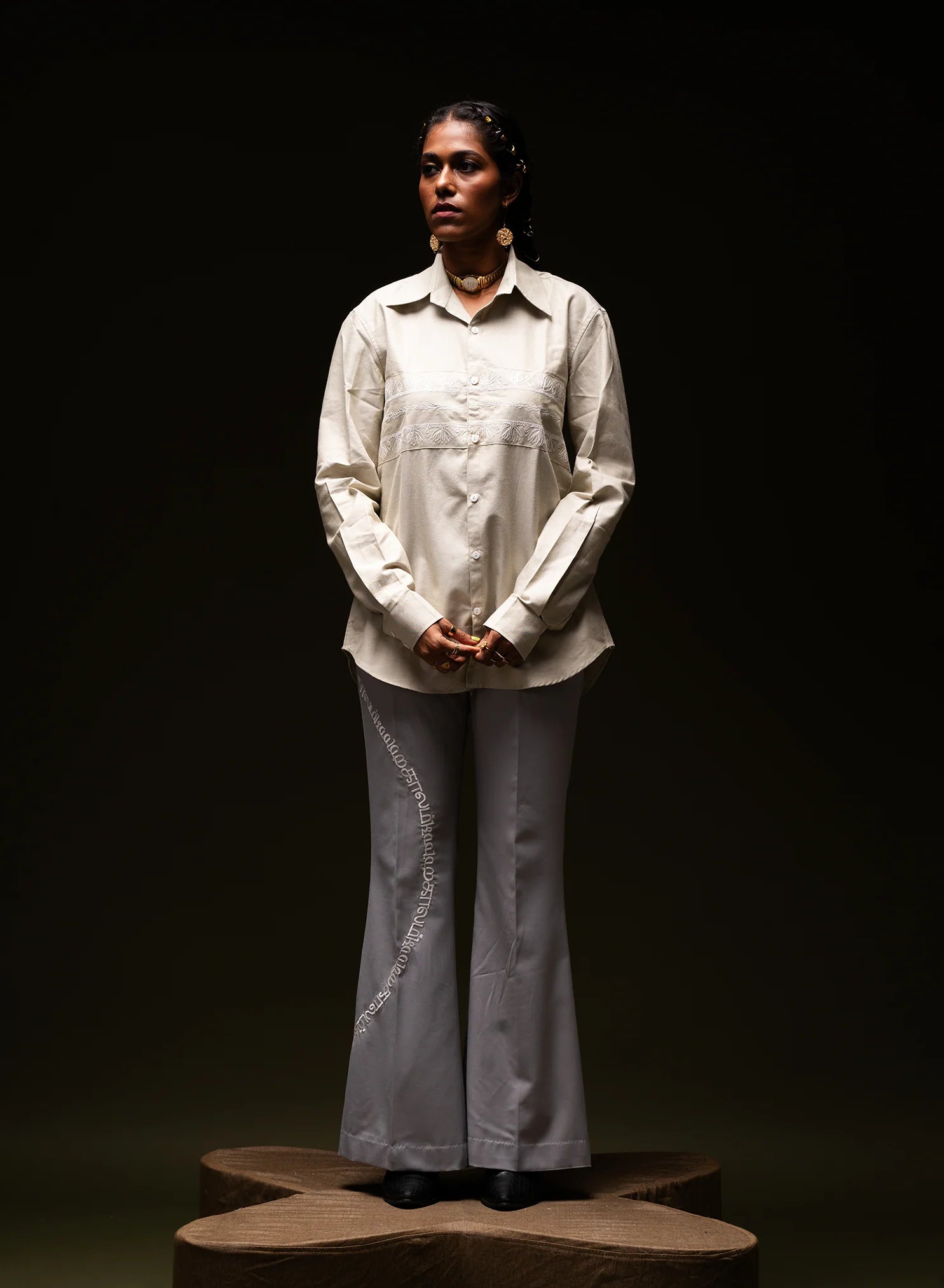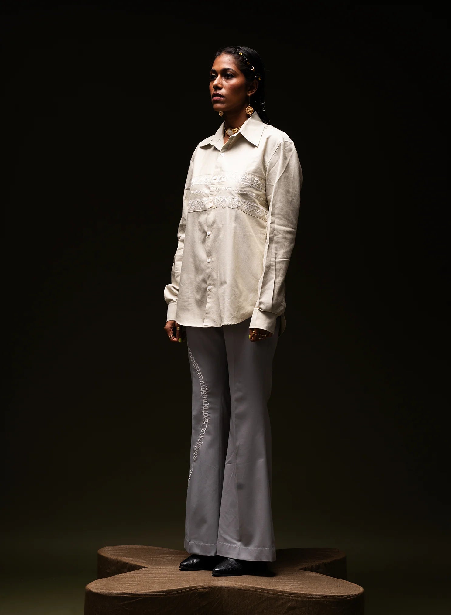 KAALAM KAALAM OG is a pair of grey bell-bottom trousers inspired by 70s fashion, featuring a fit-to-flare silhouette. Crafted from Terry rayon suiting, these gender-fluid trousers showcase repetitive Tamil embroidery, adding a cultural touch. The high-rise fit and circular embroidery detailing on the right side elevate the design, making it both elegant and bold.