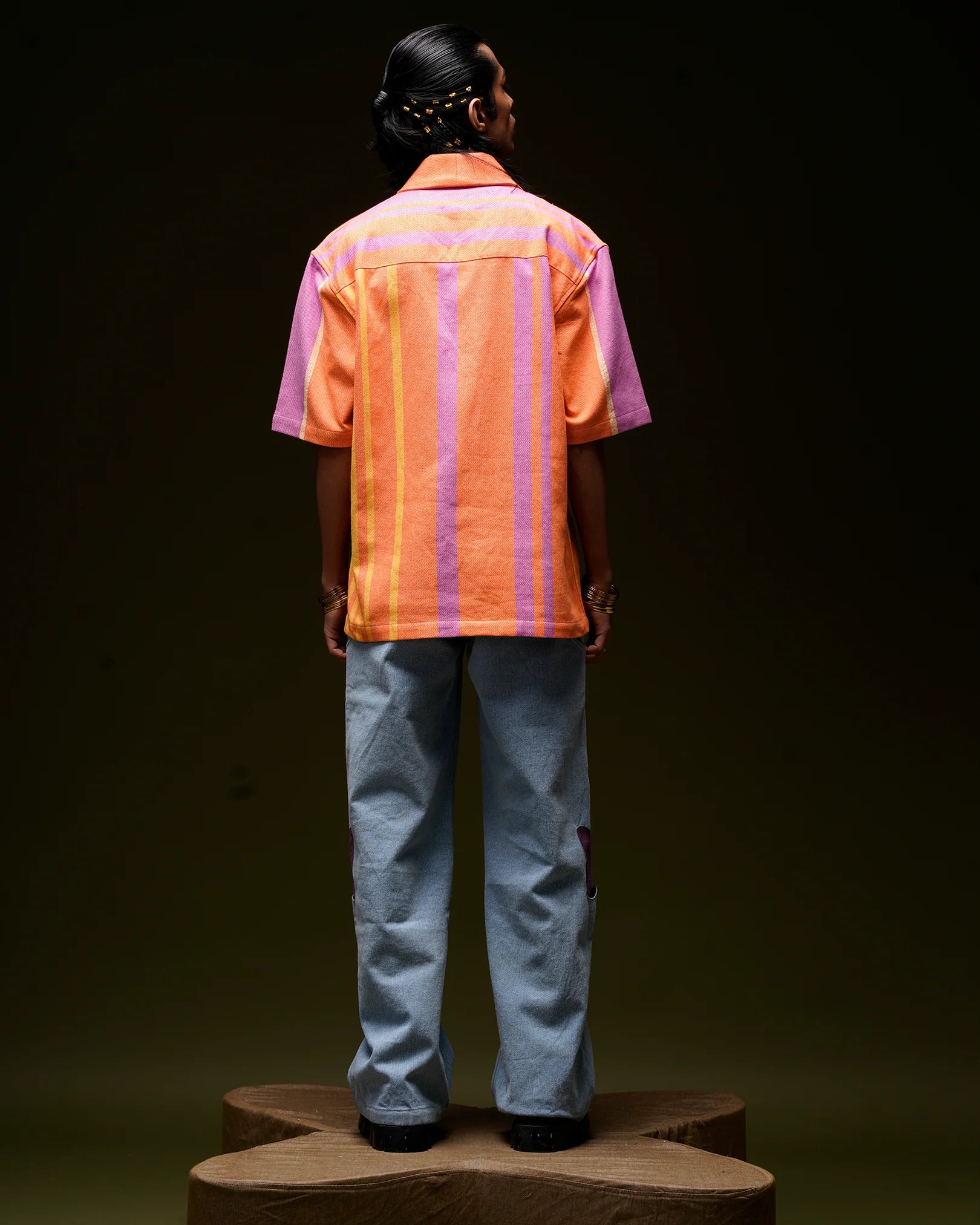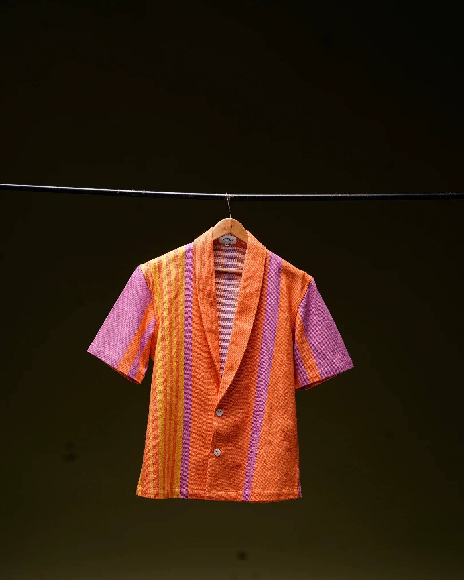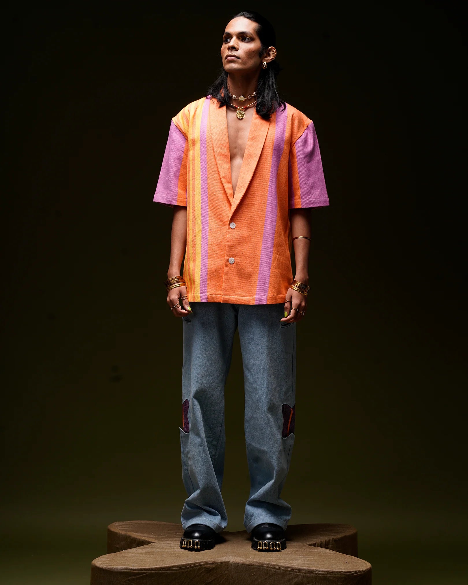 Born Kaalam is a quintessential purple shacket, blending traditional Tamil Nadu style with modern flair. Crafted entirely from Jamakkalam fabric, it features an oversized fit, short kimono sleeves, and a lapel neckline. The front showcases all-button detailing and gracefully designed cowboy pockets. A contemporary take on our first shacket, it's a perfect mix of tradition and innovation.