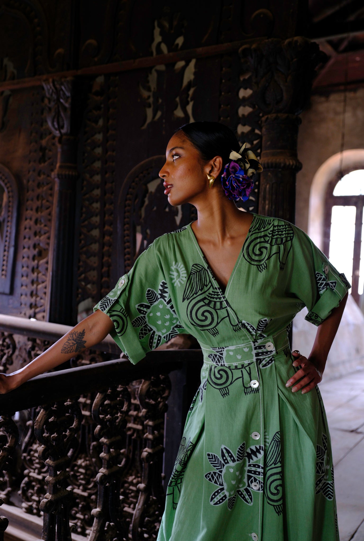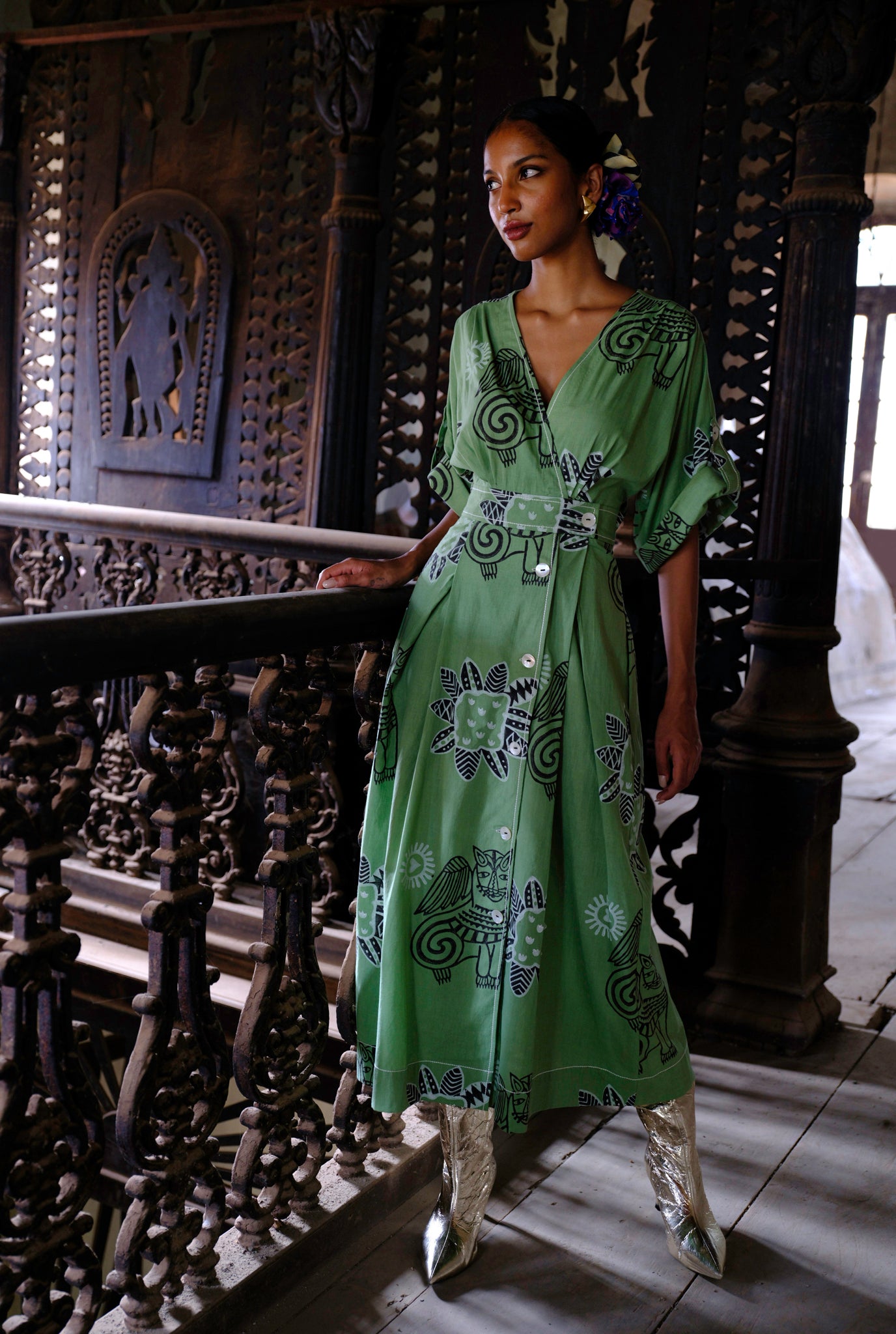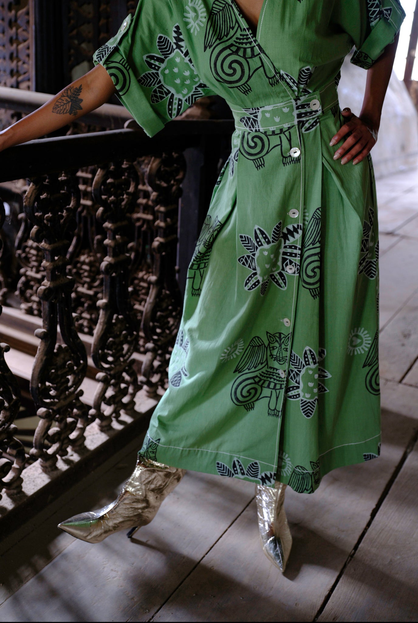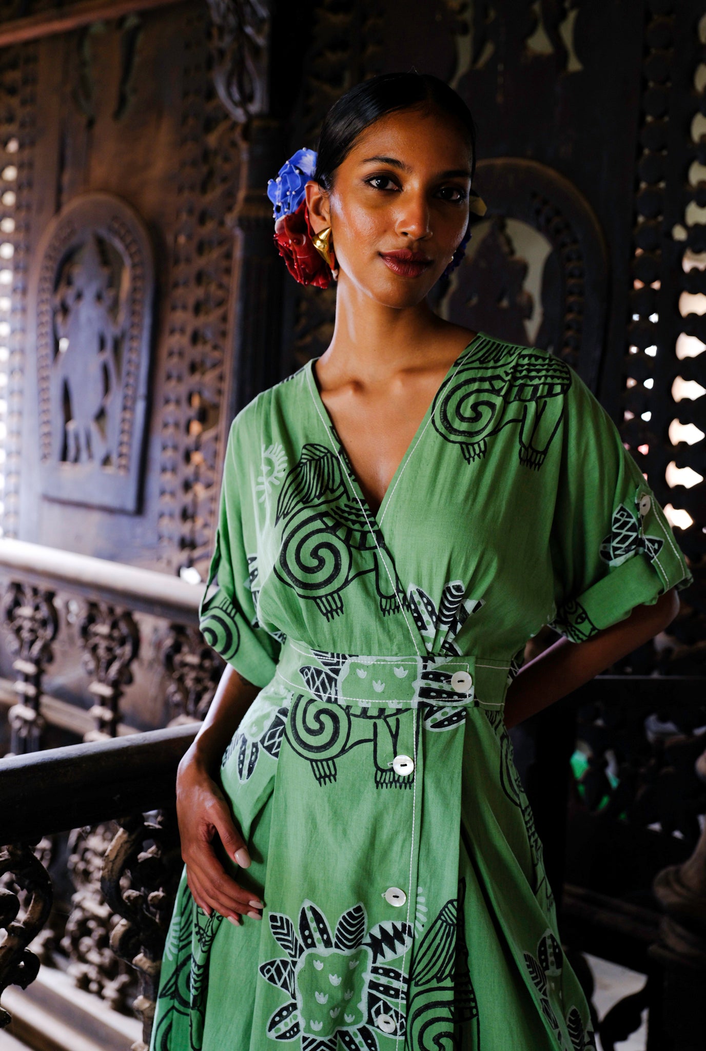 Some days you feel all grown up. You want something structured. Something you can feel all badass in. Say no more. This wrap waist dress is crafted in a hand dyed fabric with our subtle yet bold prints. The wrap waist is fastened with buttons that run down the front. This dress has a white stitch detail throughout that highlights the coolest features against the green hues.