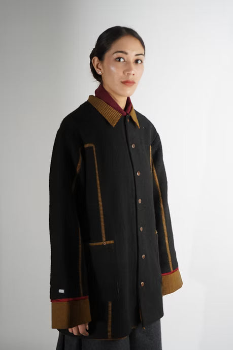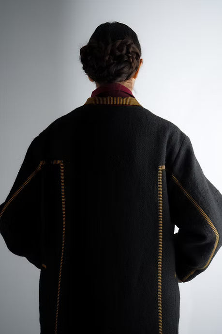 The Khampa Jacket is a sophisticated blend of heritage and modern design, inspired by the strong, architectural foundation of traditional Ladakhi homes. Named after the Ladakhi word for “house,” this statement piece captures the essence of timeless craftsmanship with a contemporary edge. Handcrafted from luxurious, handspun, and handwoven black Ladakhi sheep wool, the jacket offers a tactile richness and natural warmth that exudes understated elegance. Its sleek silhouette is elevated by bold piping appliqué in contrasting yellow and black stripes, a dynamic nod to Ladakh’s architectural aesthetics and cultural symbolism.