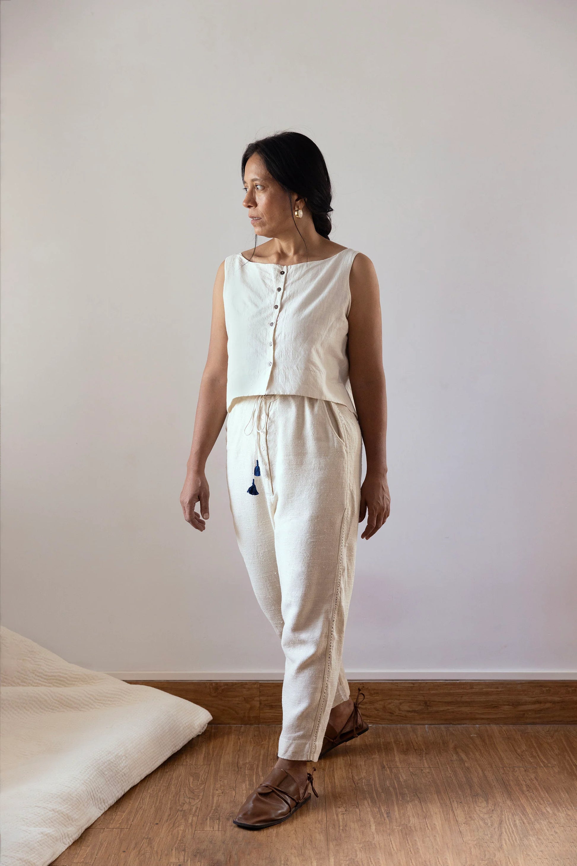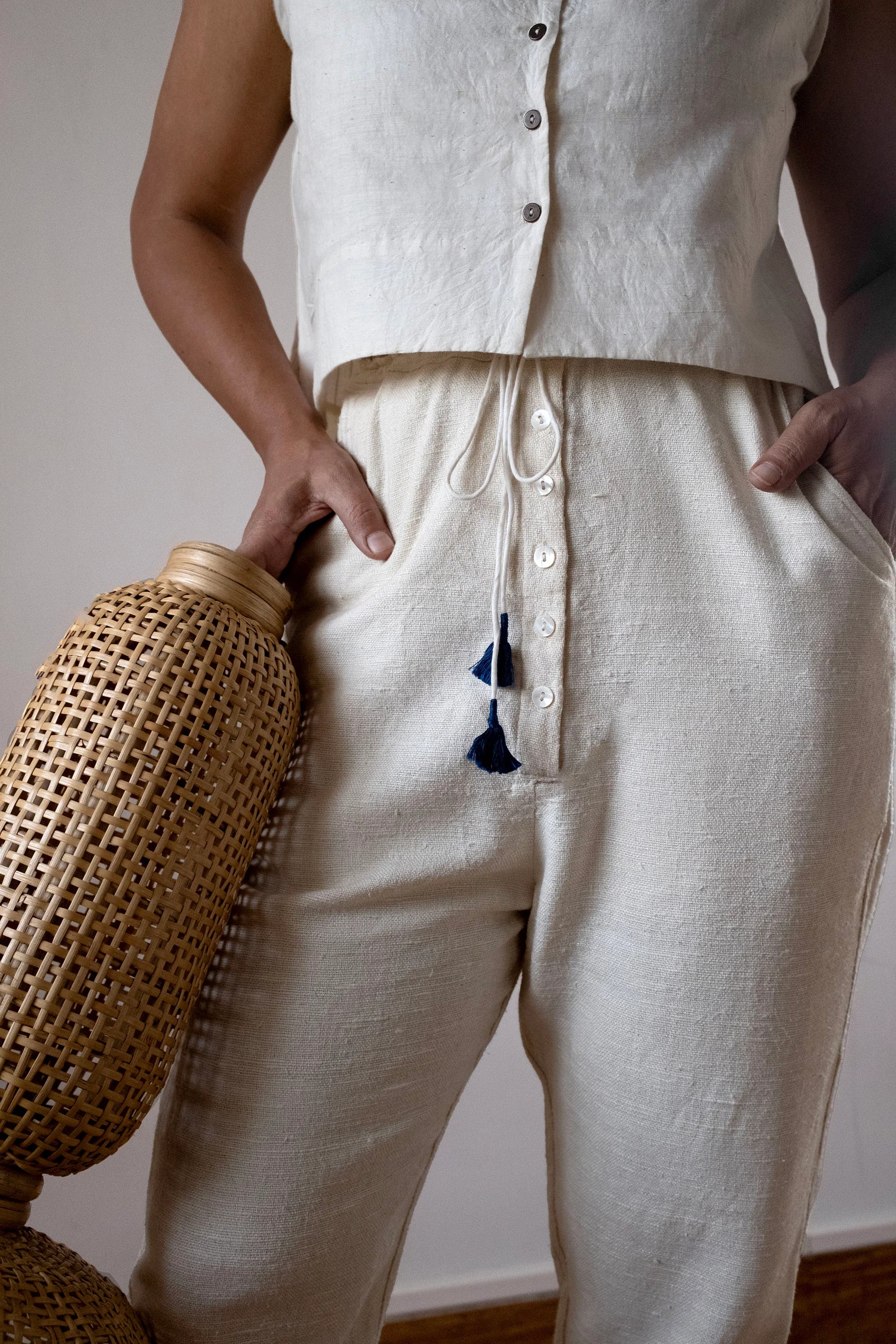 These pants are made of a thick, slubby, hand spun silk with a beautiful sheen and a contrasting blue kantha stitch running along the side seams. The thick, hand-spun silk offers an elegant sheen, while the elasticated and drawstring features provide a comfortable and customizable fit. The contrasting blue kantha stitch adds a unique touch to these stylish and versatile pants.