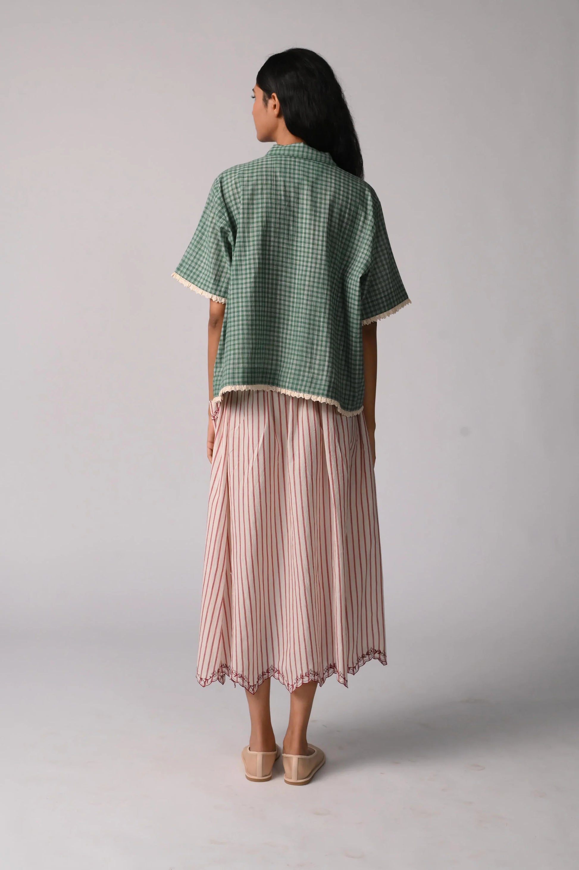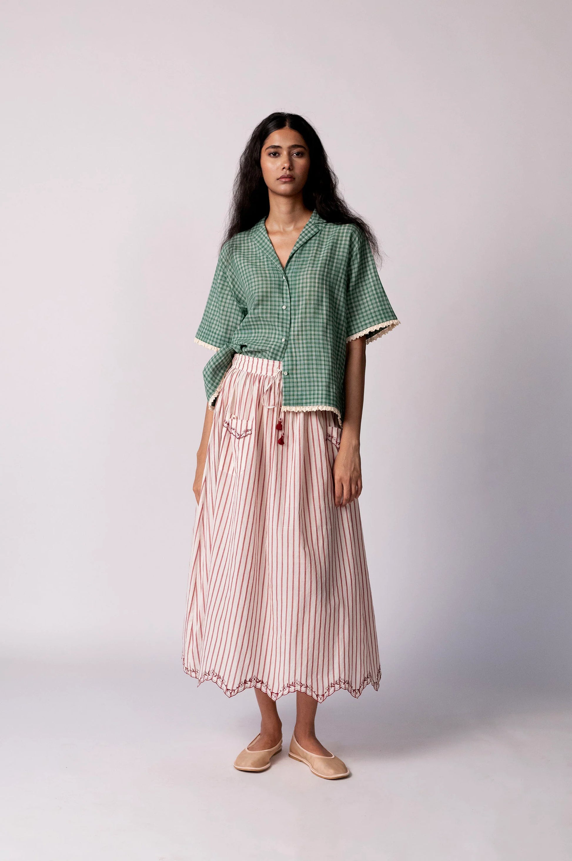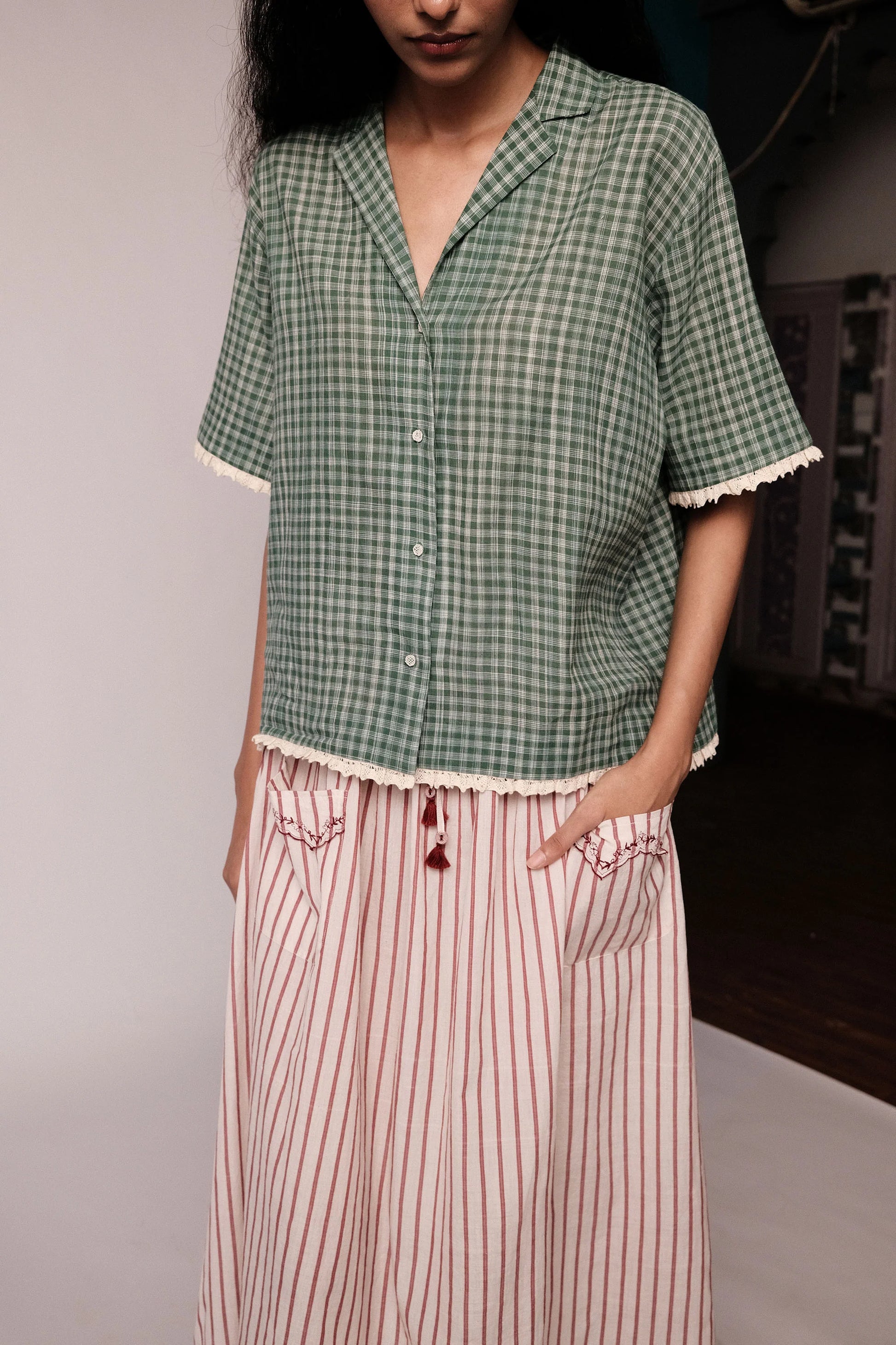 The Khemsar Shirt by Serai is a charming green checkered piece with a touch of whimsy. This stylish shirt features a checkered pattern in rich green tones, accented by cute white borders that add a fresh, elegant twist. Its classic design, combined with these delightful details, makes it a standout choice for adding a pop of personality to any outfit.