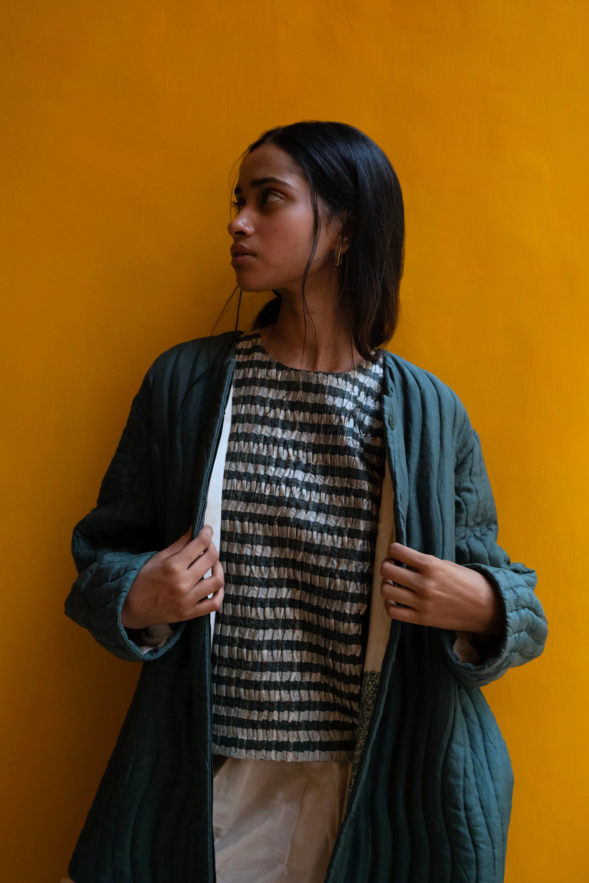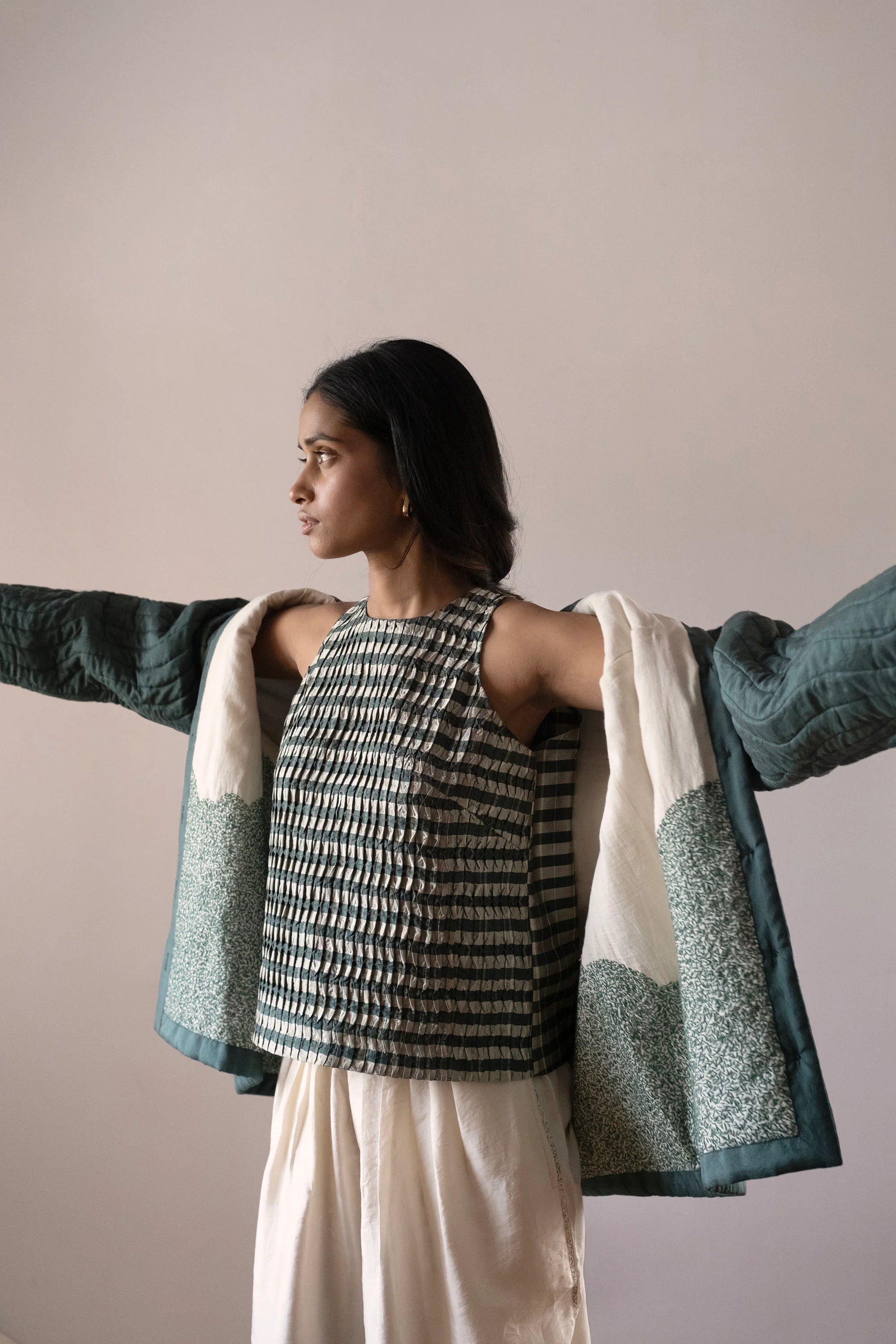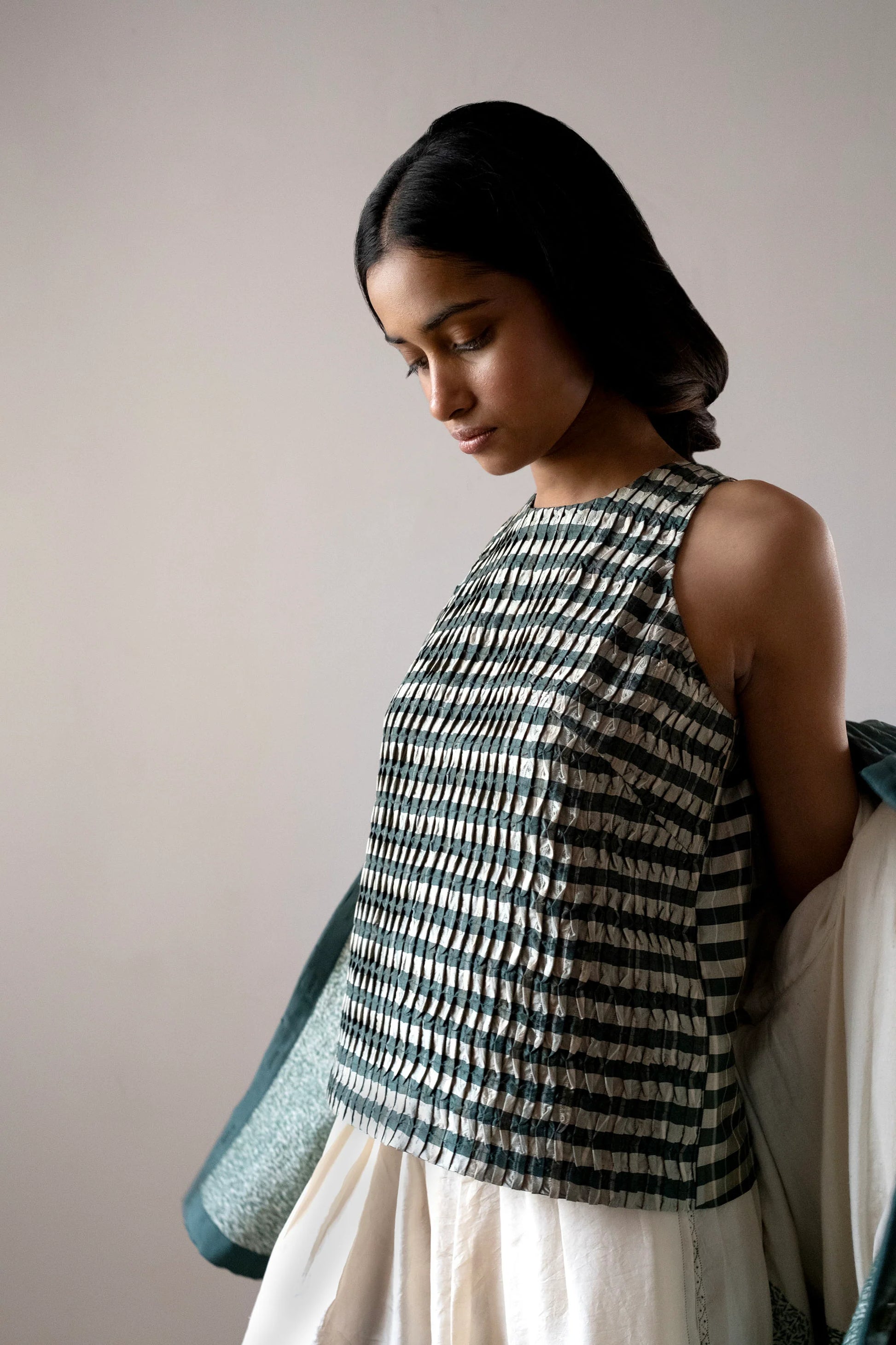 The Chironji top is Serai's version of a dressy racerback. The front is pleated and the back has a keyhole design. The Chironji is designed to be a boxy fit. It's a versatile piece with a unique design - making it perfect for any occasion, whether it's a night out or a day at the office. The boxy fit allows for comfort and movement without sacrificing style.