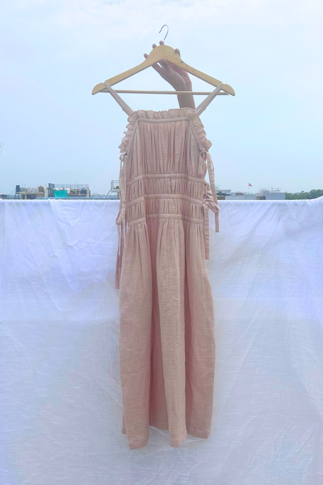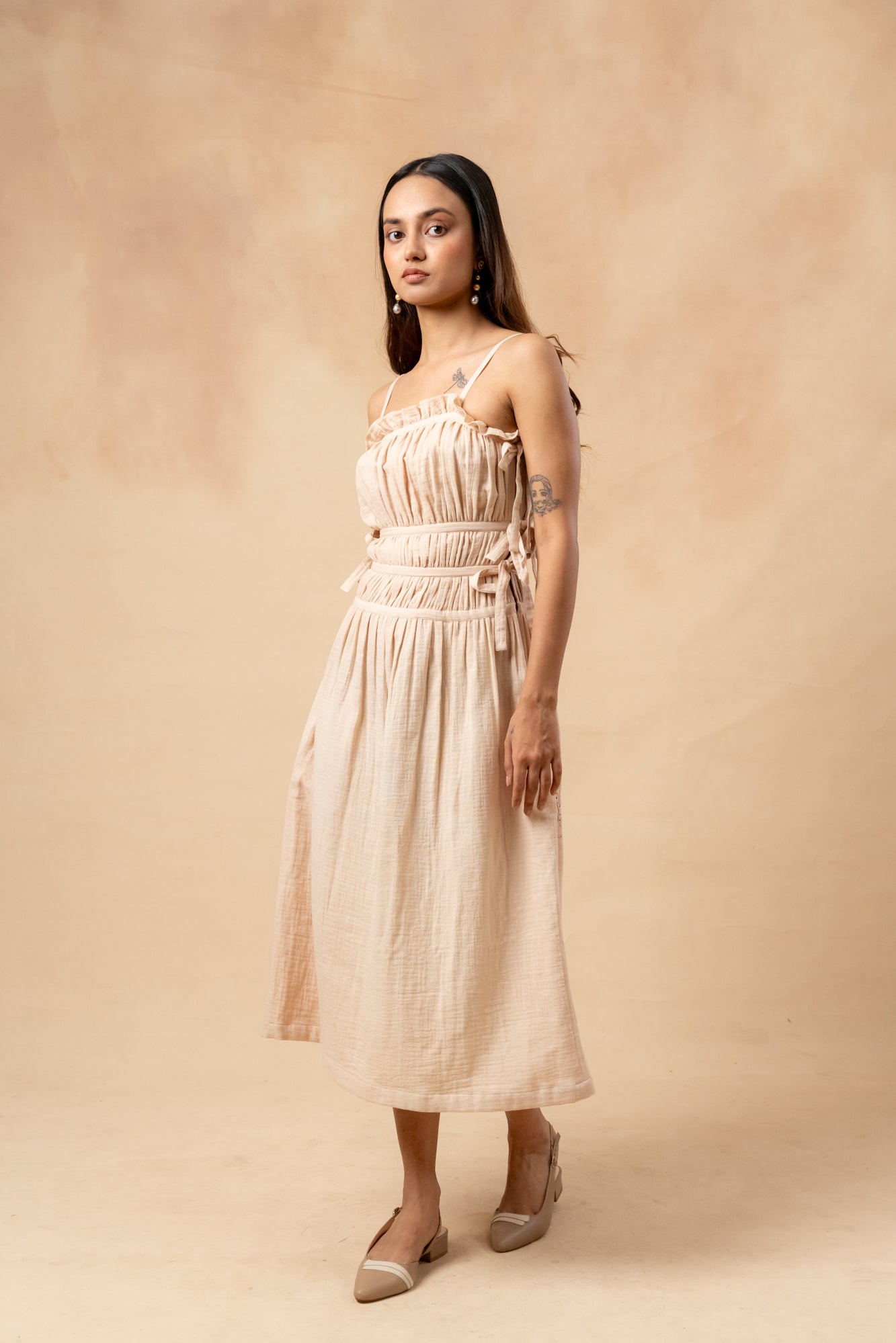 Description: Beige organic cotton smocked dress with adjustable straps and bows, featuring a concealed zipper for closure, comes with randomly placed doodle embroidery.