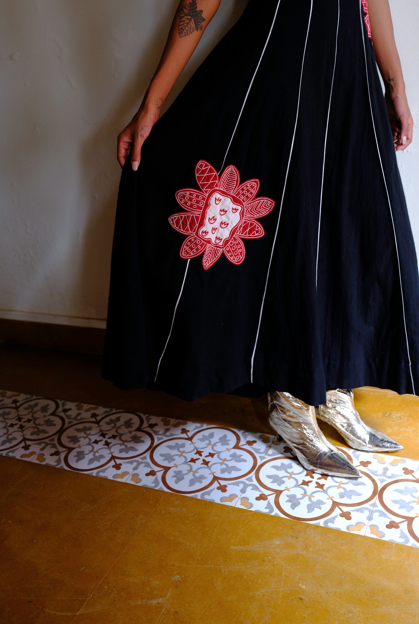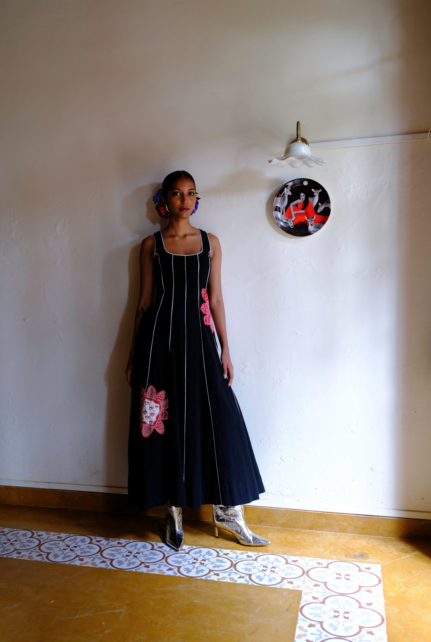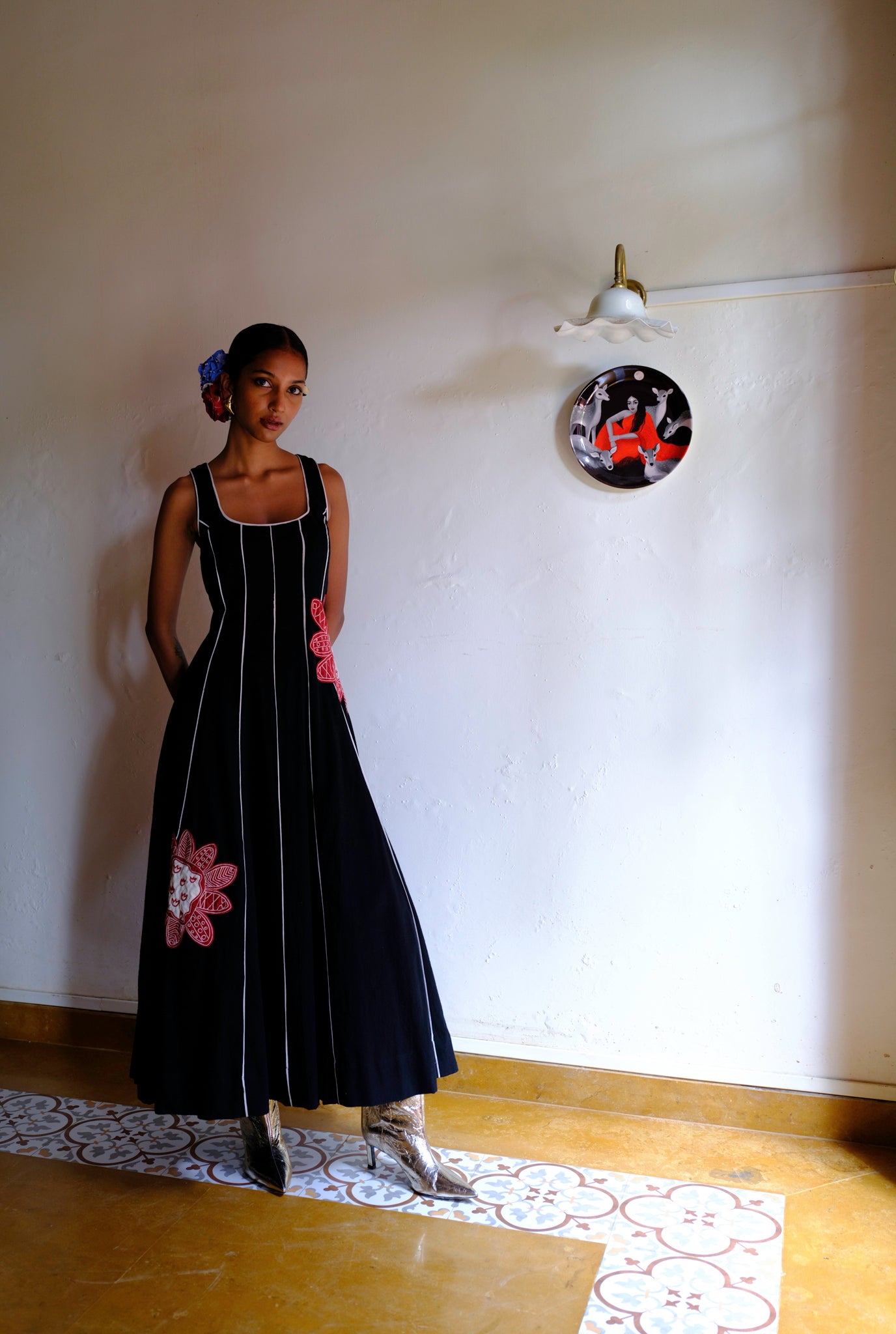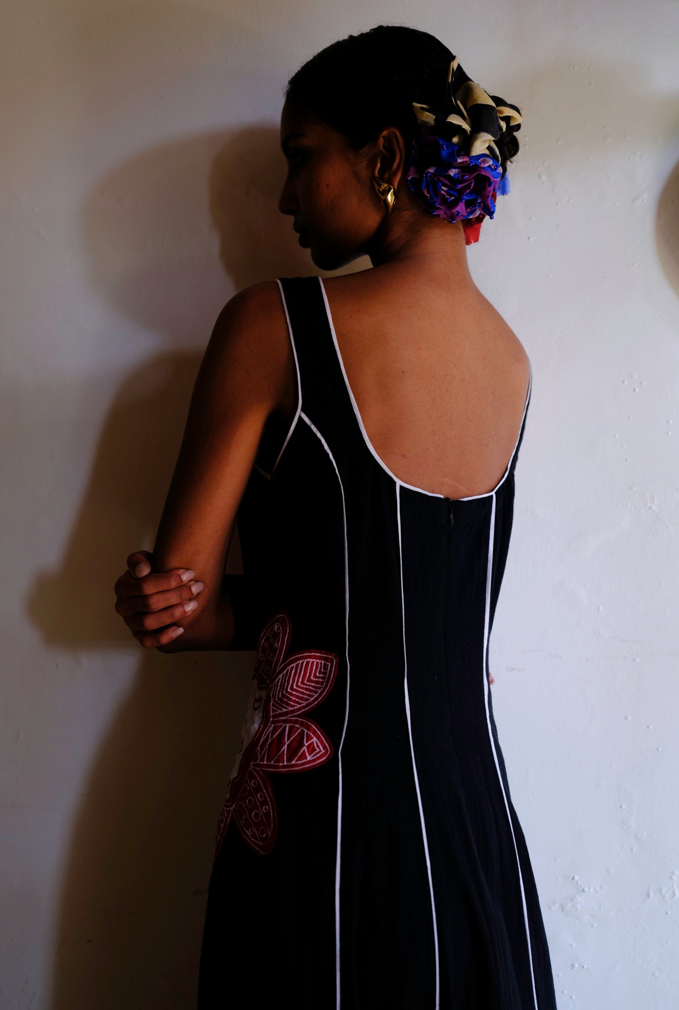 If we had to pick a favorite from the collection this would be it! Crafted in handwoven cotton, it features a wide scoop neckline, and the paneled cuts give it a fit of your dreams. It is also contrasted with white detailing at all the right places, and the hand-embroidered applique flowers make it a standout piece.