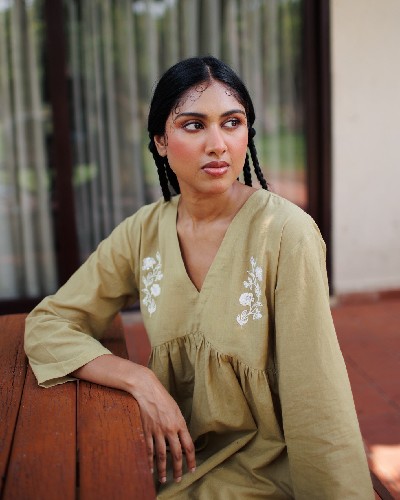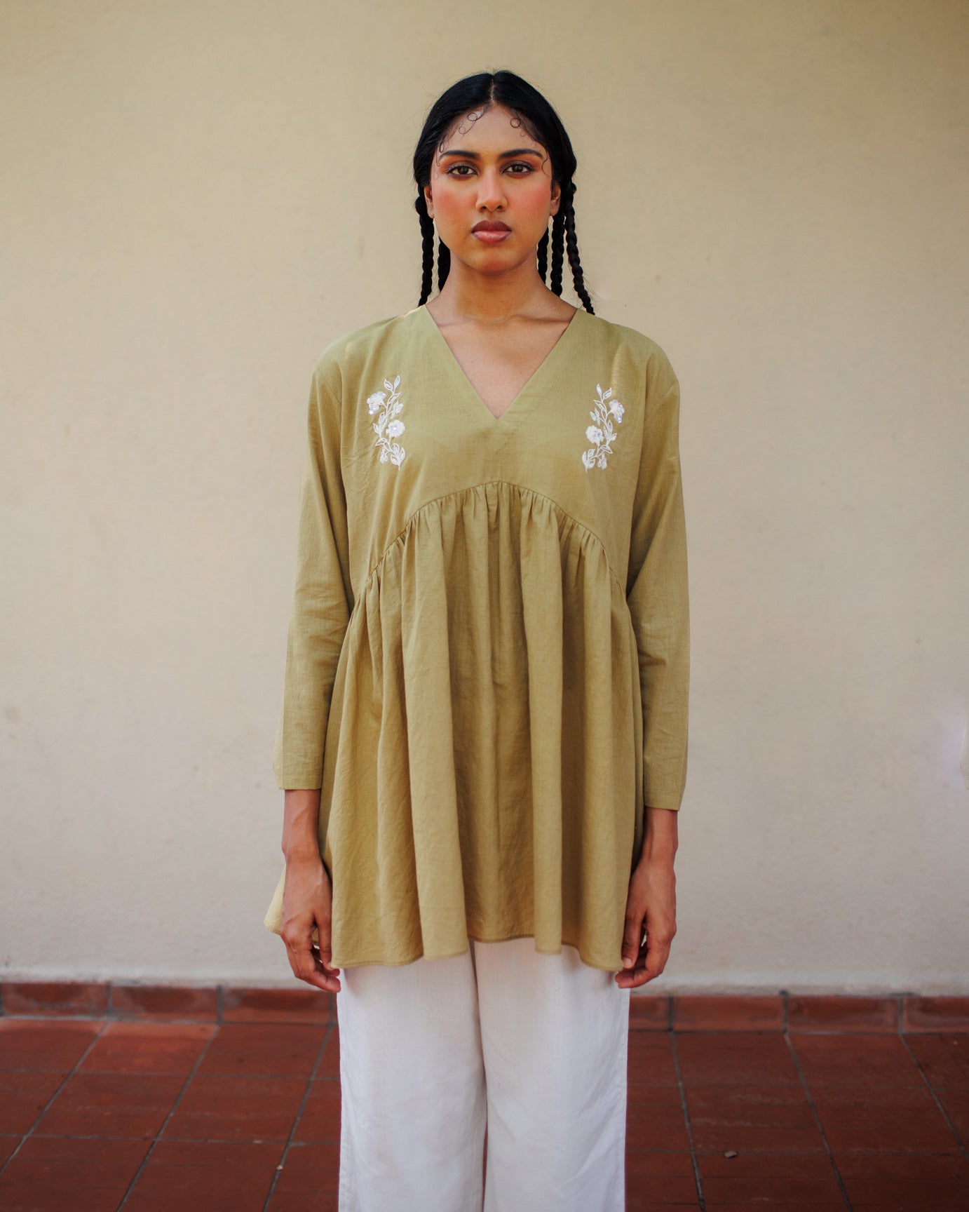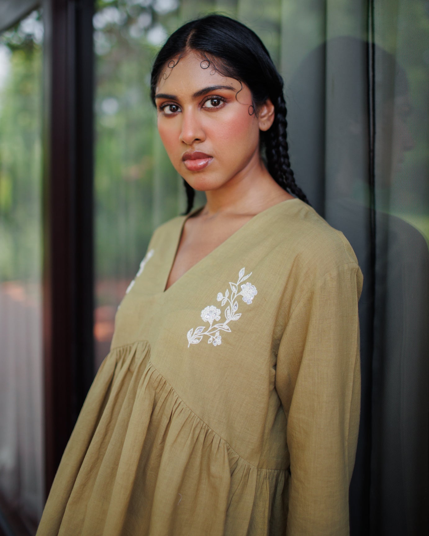 An oversized empire-line tunic crafted in hand-spun and handwoven Kora cotton. Designed with soft gathers for a fluid silhouette, and finished with our signature Aari embroidered motifs on the bodice.