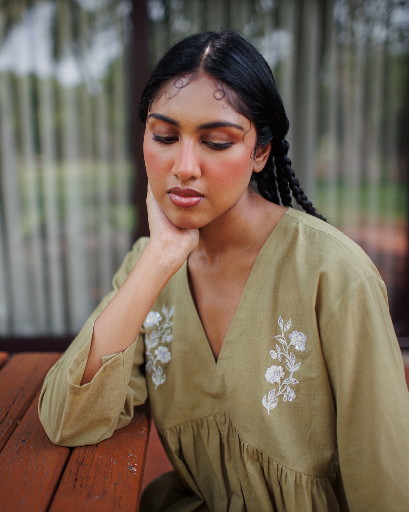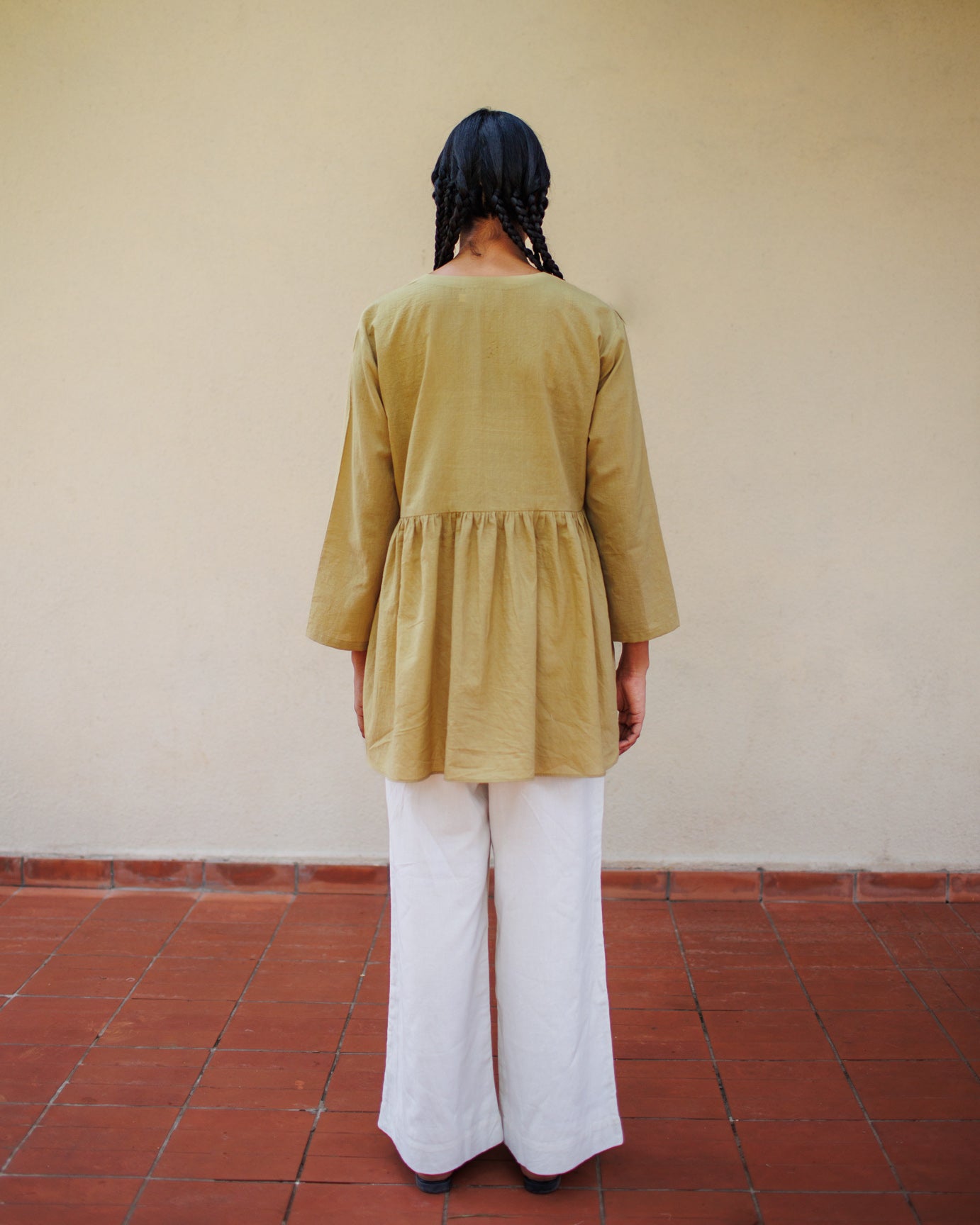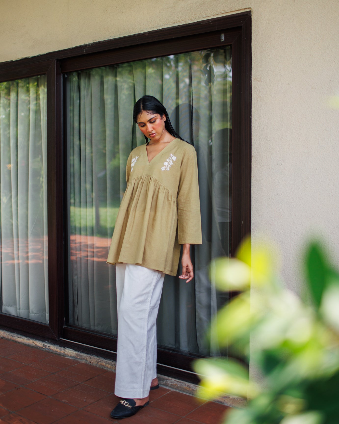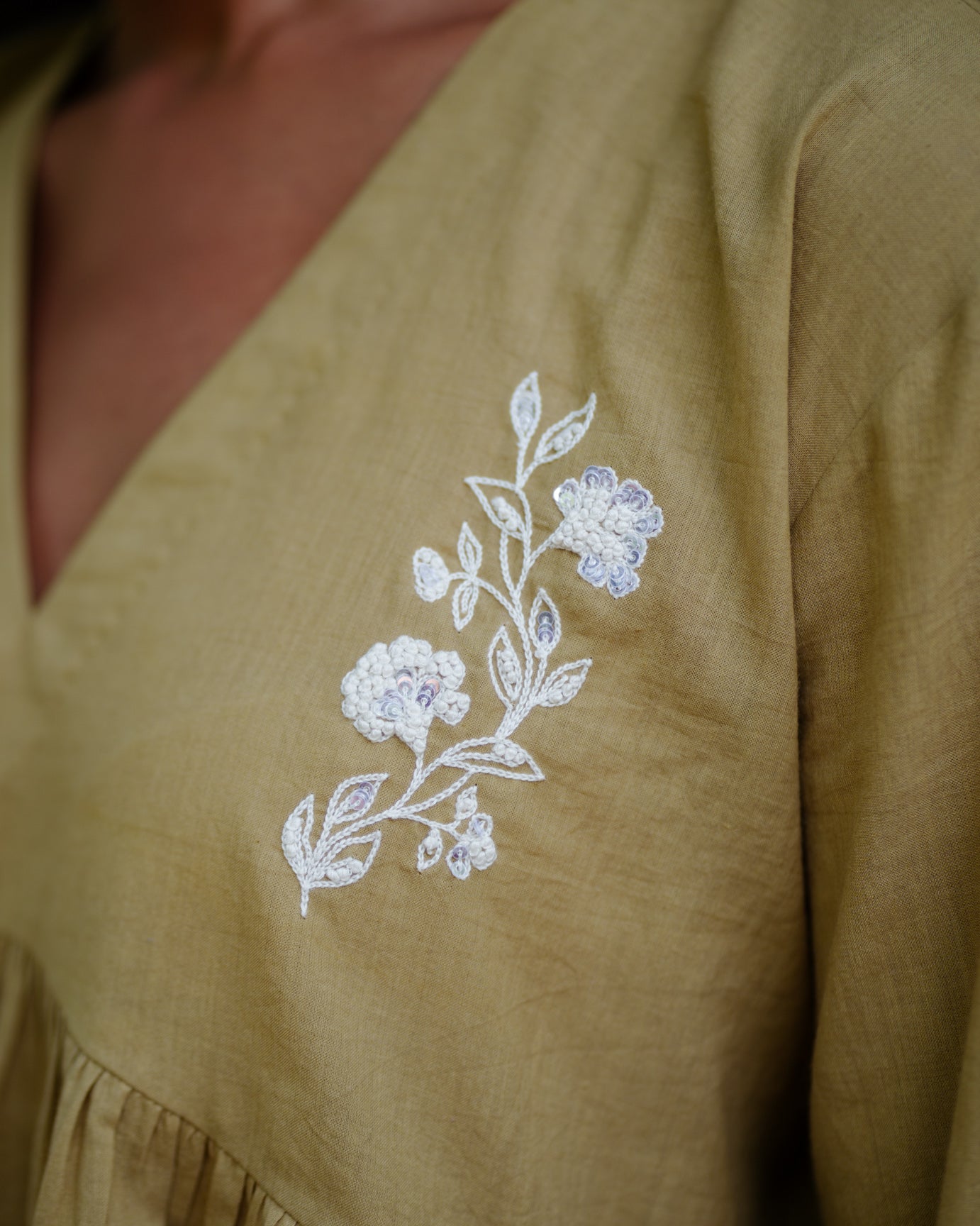 An oversized empire-line tunic crafted in hand-spun and handwoven Kora cotton. Designed with soft gathers for a fluid silhouette, and finished with our signature Aari embroidered motifs on the bodice.