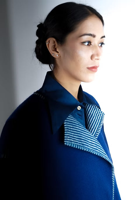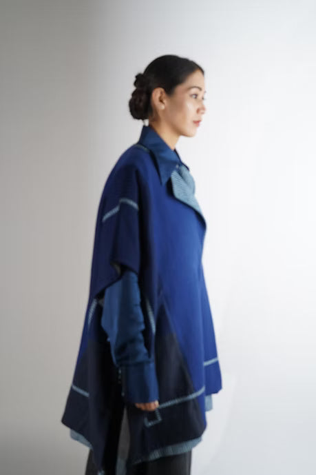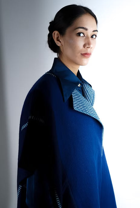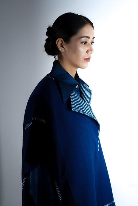 The Koor Poncho is a free-size, effortless layer crafted in shades of indigo, reflecting our commitment to textile revival and mindful craftsmanship. Made by carefully mixing and matching leftover indigo-dyed fabrics, this piece carries a subtle dual-tone effect, adding depth and character to its form. A striking Ajrakh strip appliqué in geometric patterns runs across the poncho, celebrating the rich heritage of hand-block printing.