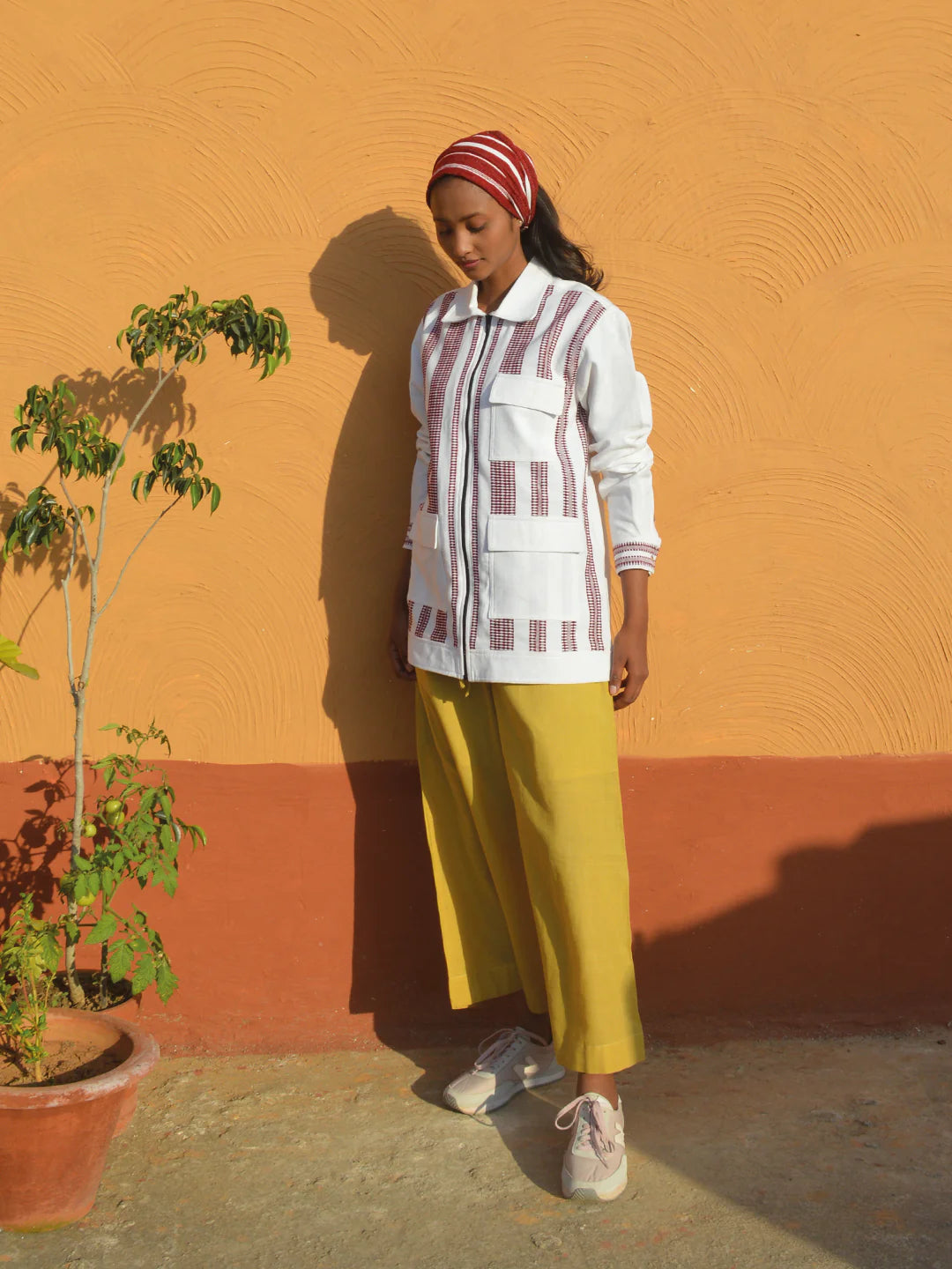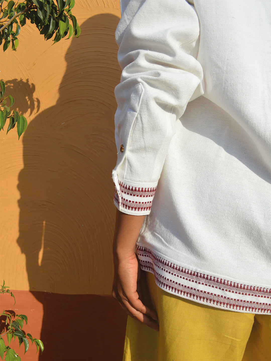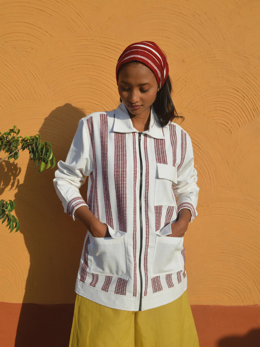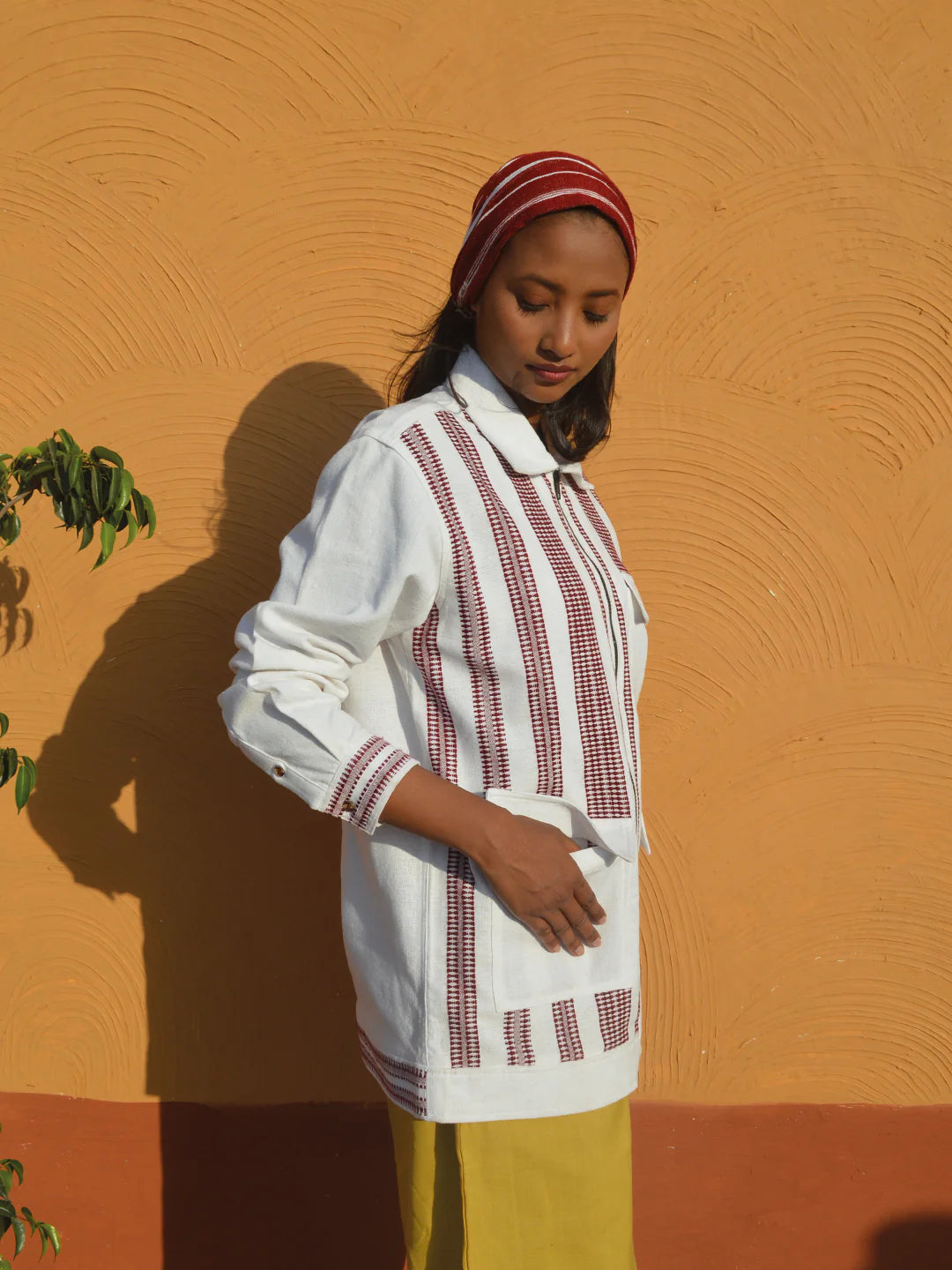 Unique unisex shacket made from Jharkhand Tribal Textile Kukhna, traditionally used as a shawl by various tribal communities in Jharkhand. Crafted from pure cotton, this regular-fit shacket combines comfort with cultural heritage. Its maroon color adds a bold touch to any outfit. Embrace sustainable fashion with this distinct piece that celebrates indigenous craftsmanship.