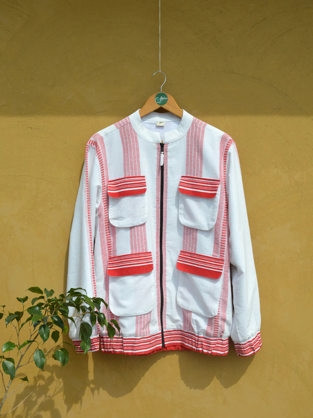 Experience the timeless elegance of the PINDNA Unisex Bomber Jacket, crafted from Jharkhand Handloom Traditional Textile Pindna. Originally cherished by various tribal communities of Jharkhand, this jacket features a plain weave and is made from pure cotton. The regular fit ensures comfort and style for all, while the vibrant coral hue adds a touch of modern flair. Complete your look with this versatile piece that seamlessly blends tradition with contemporary fashion.