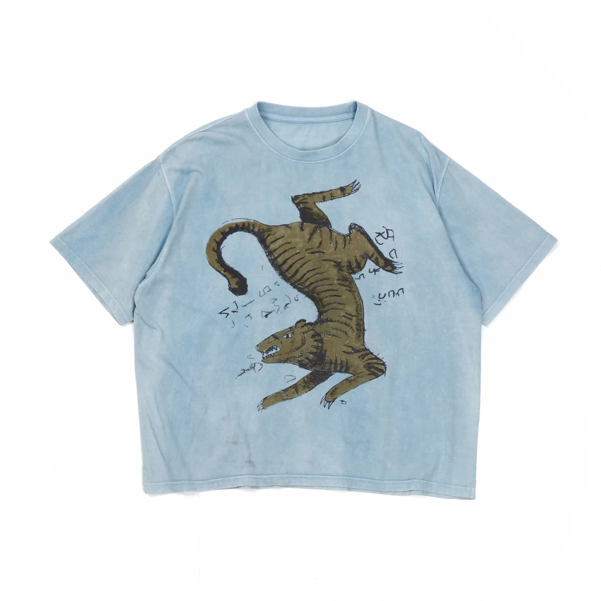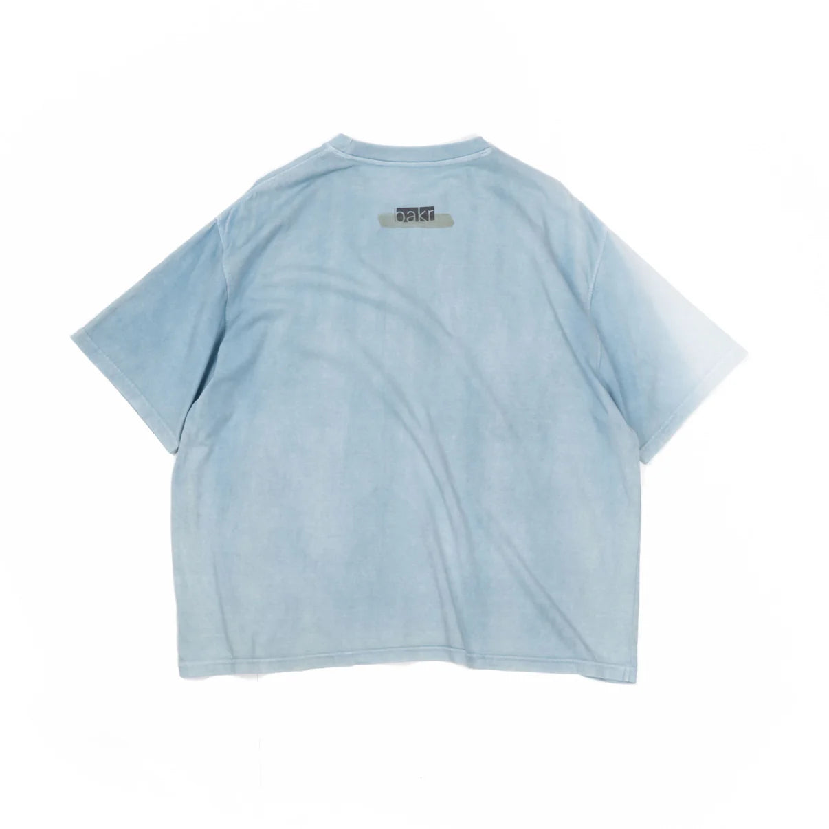 Bakr's oversized t-shirt "imprint" in the shade "indigo ice" is hand-printed in colours extracted through the fermentation of iron rust and molasses, hand painted in a 100% extract of Pomegranate peel and hand-dyed in our studio with our organic honey indigo vat.