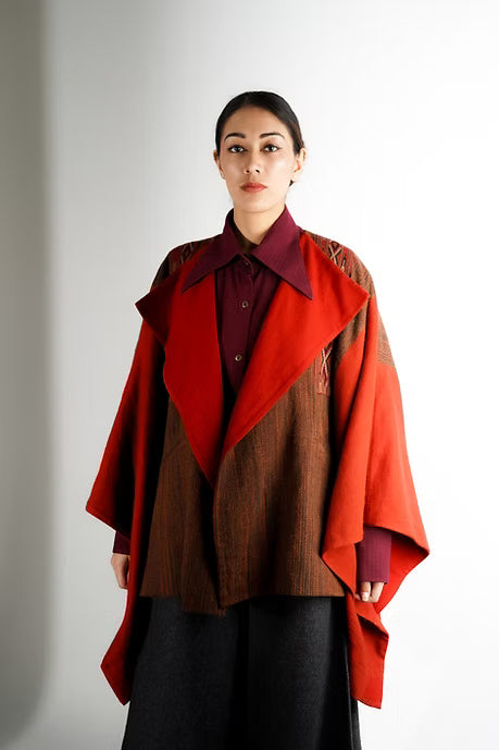 The Repurposed Cape is a striking fusion of Ladakh’s Nambu wool and the intricate weaves of Kullu shawls, reinterpreted into a front-open poncho with a flowing handkerchief hemline. Designed for effortless layering, this piece drapes with a sense of movement, embodying the fluid elegance of Himalayan textiles. By repurposing pre-existing Kullu shawls, each cape carries a distinct character, with patterns and colors that tell a story of craftsmanship. Adding Ladakh’s handwoven Nambu lends structure and warmth, ensuring both comfort and durability.