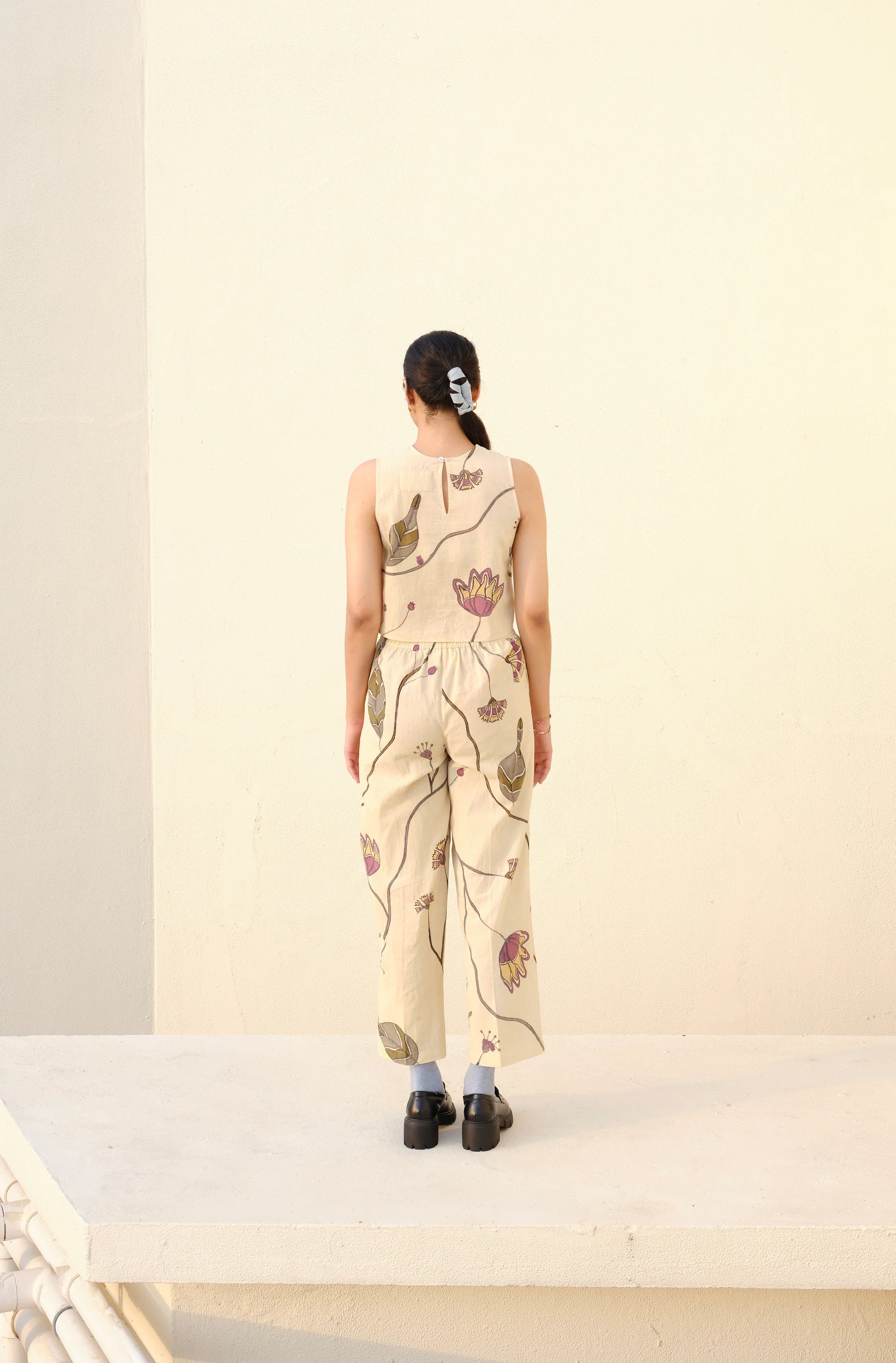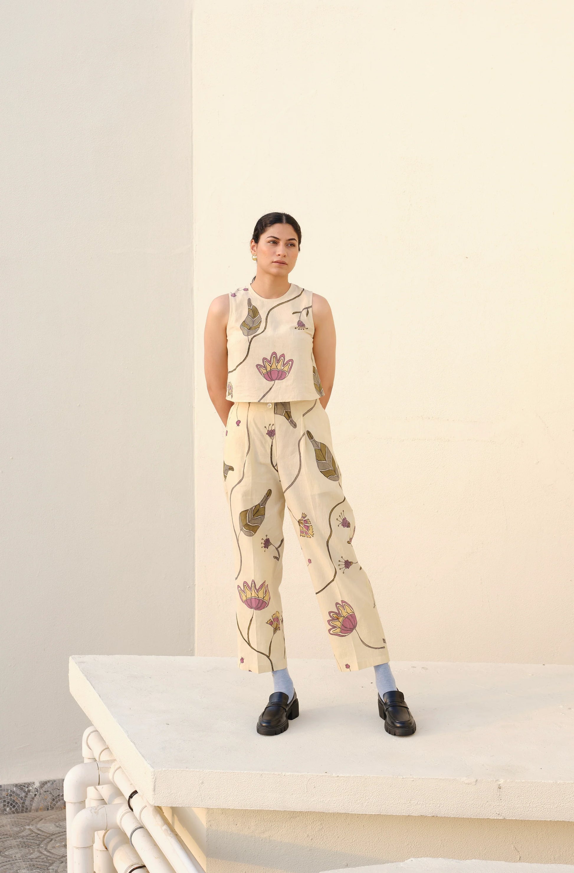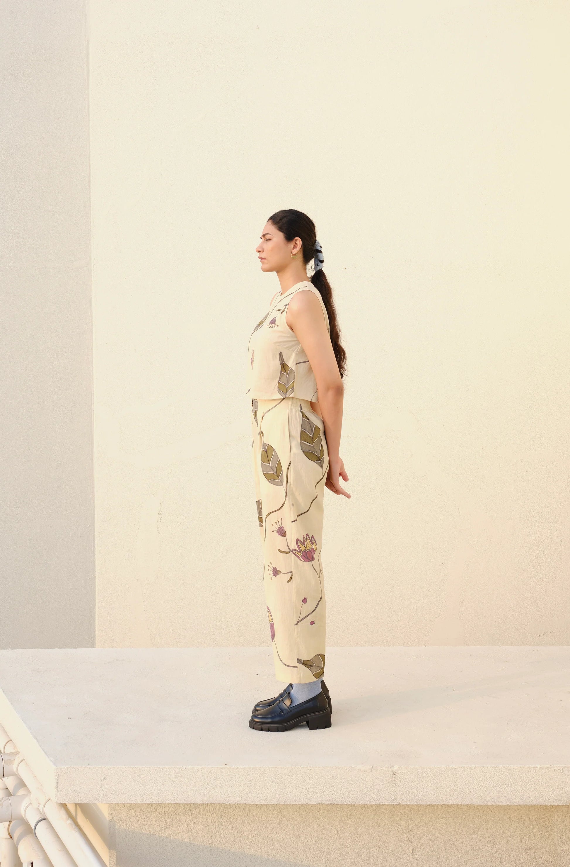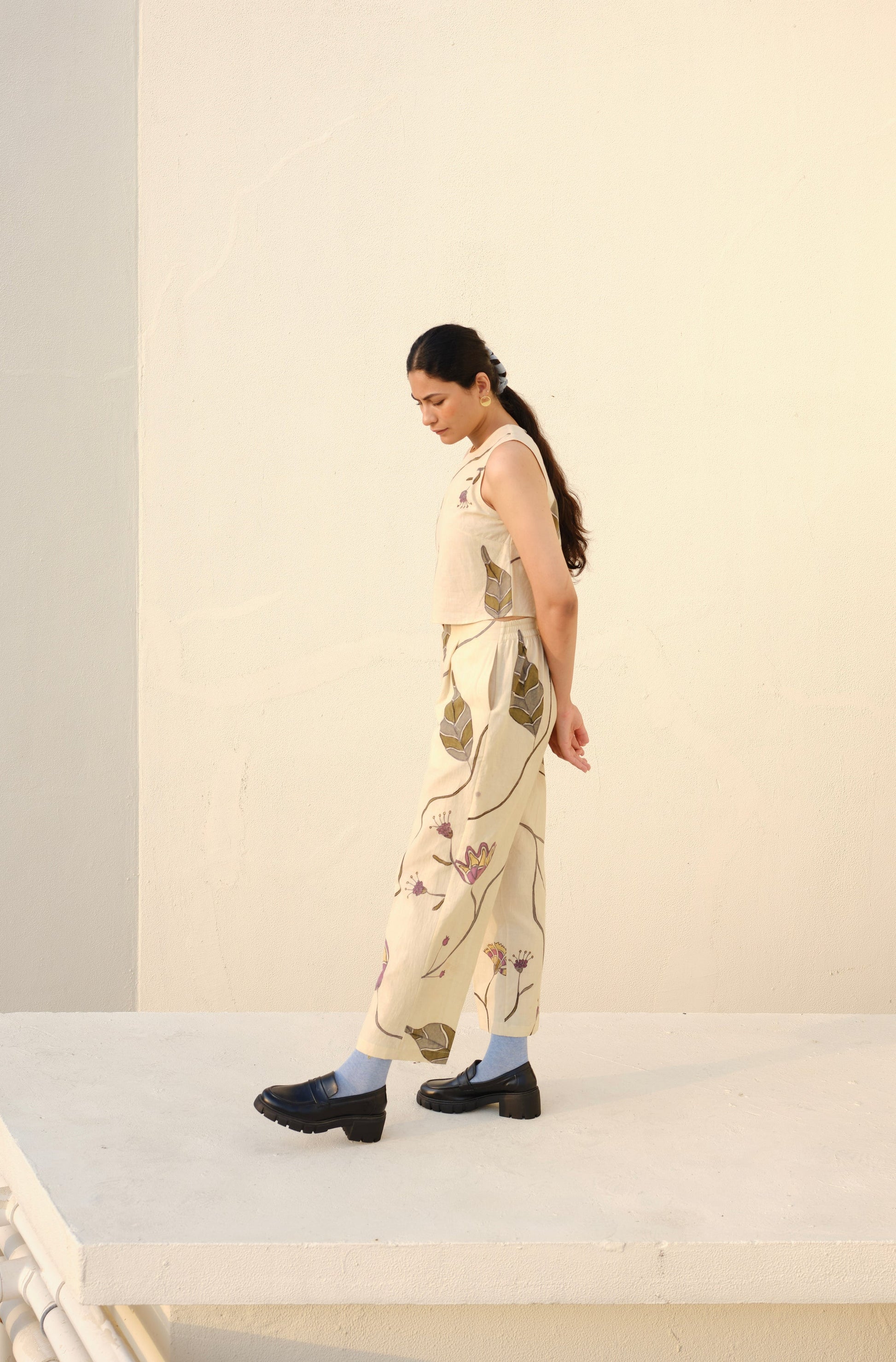 A pair of straight-fit handpainted trousers with pleats, elasticated back, side pockets and mock fly detailing.