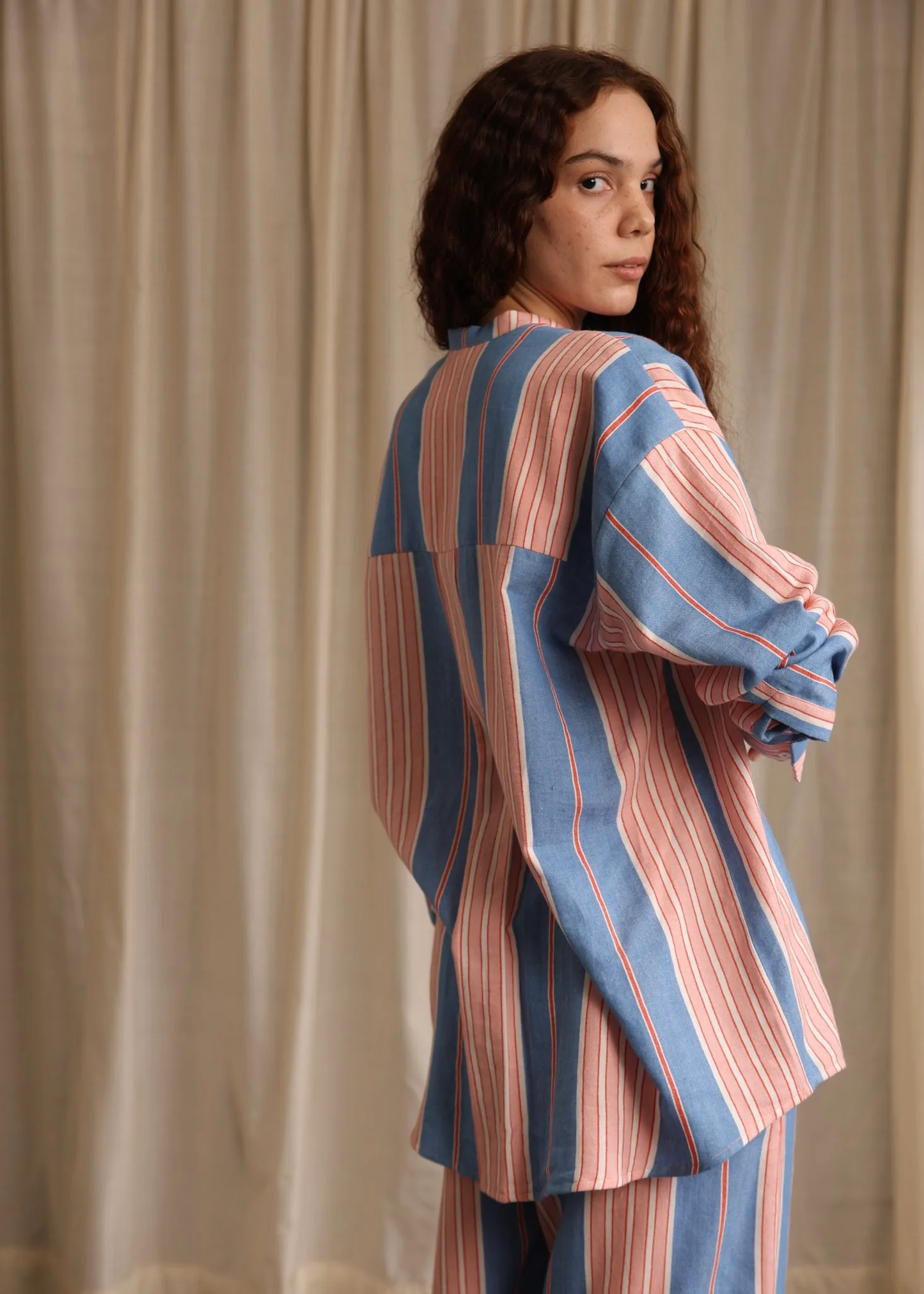 A vibrant, oversized cotton twill shirt, in a playful stripe, with minimal shell buttons and a Chinese collar.