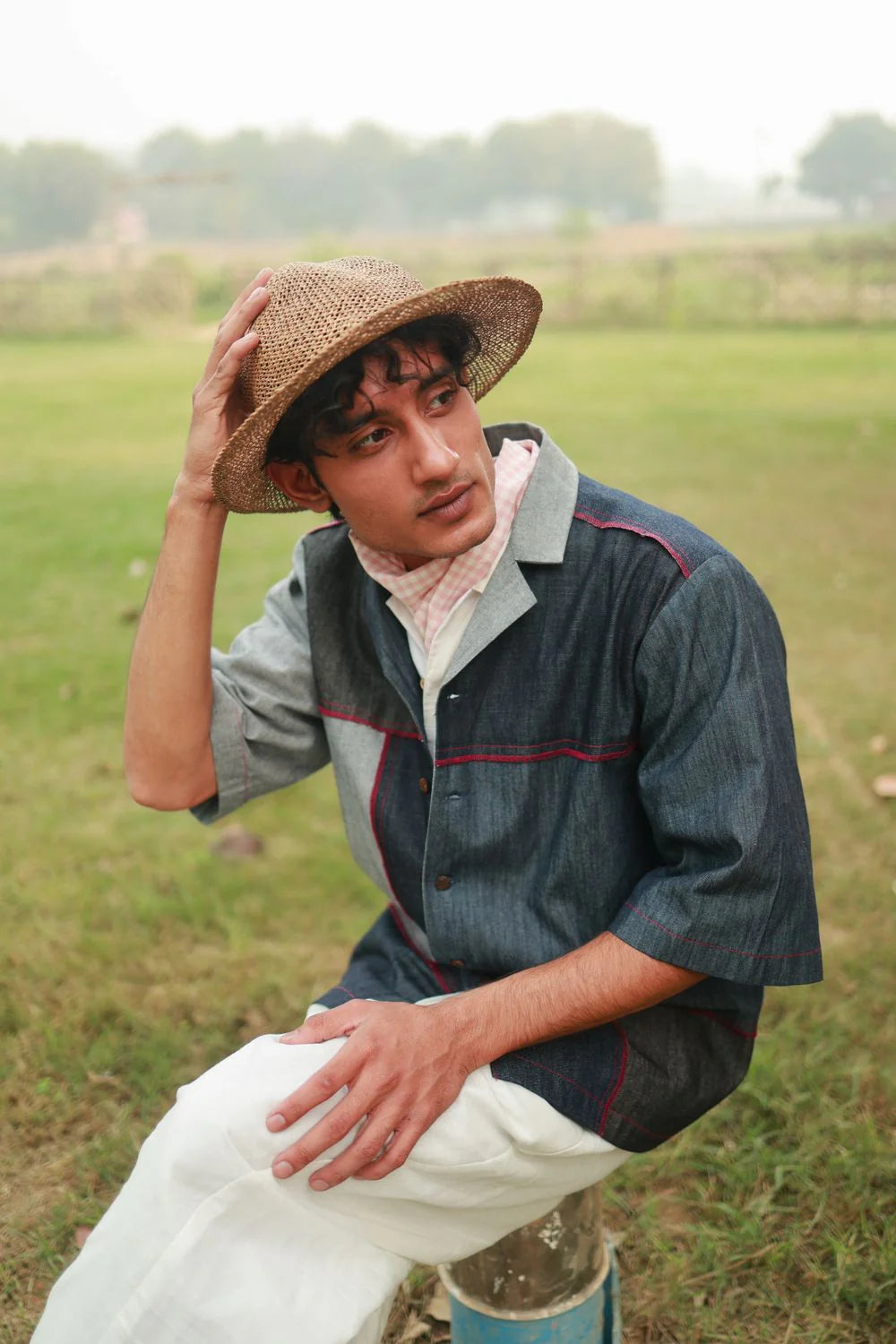 A relaxed-fit men’s shirt crafted from factory-waste denim with a unique patchwork design. Featuring short sleeves, a button-down front, and contrast stitching, this versatile piece blends artisanal charm with everyday ease.