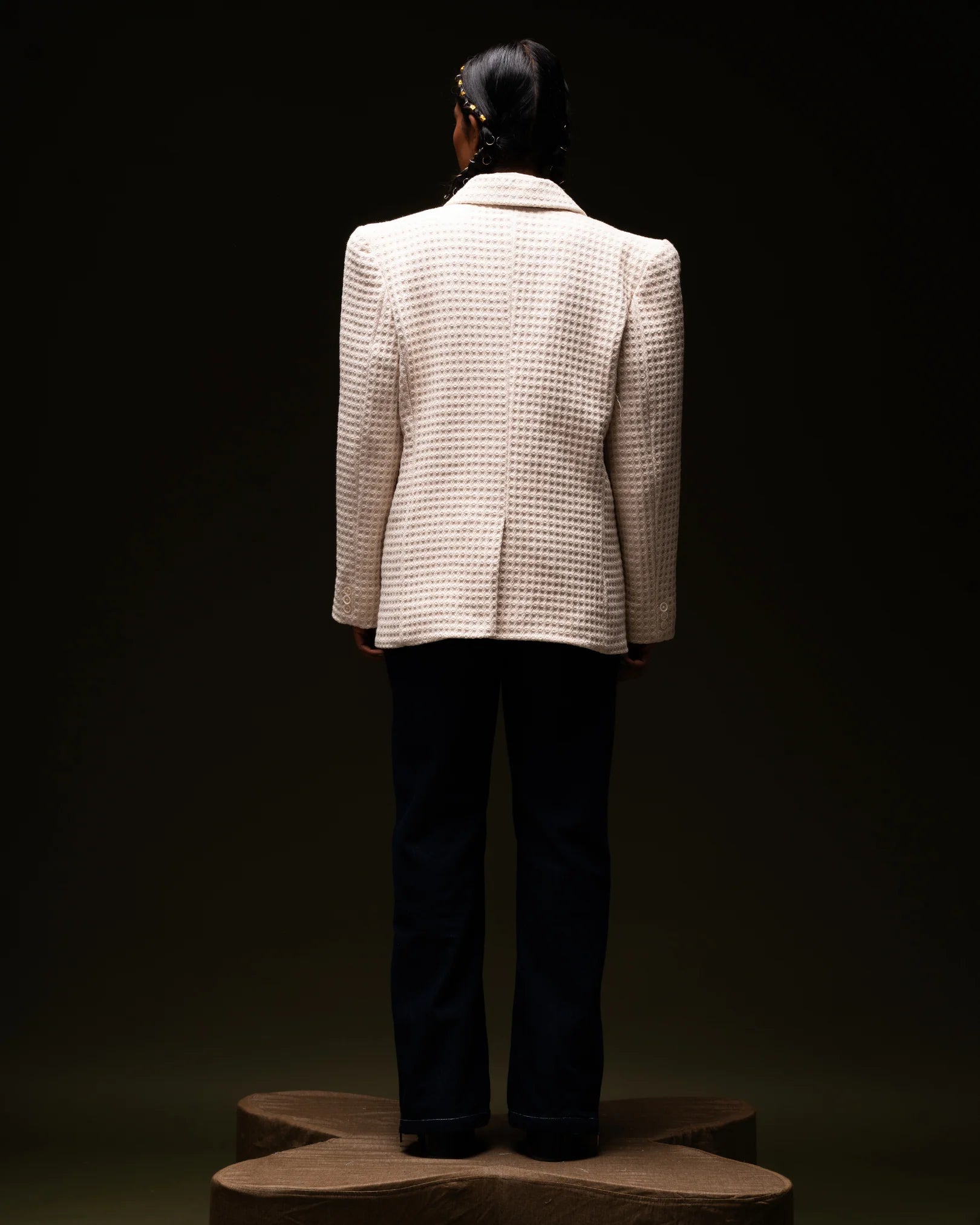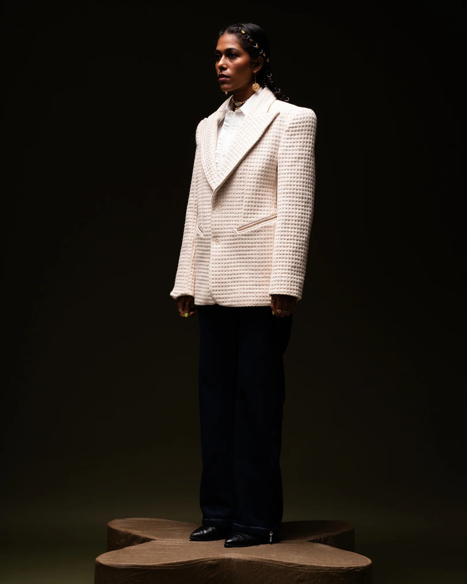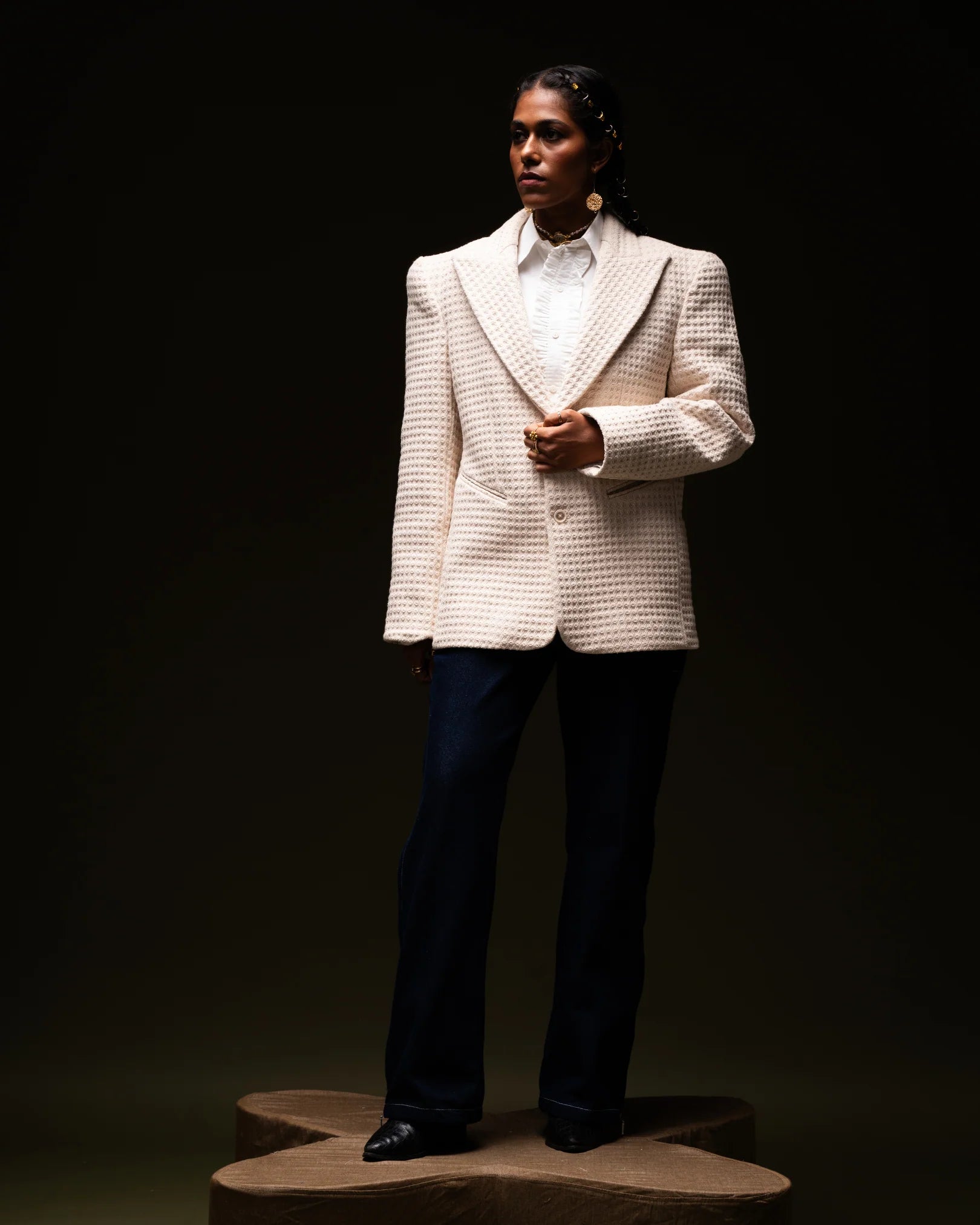Legend is a timeless honeycomb beige blazer, blending classic elegance with modern sophistication. The shorter, tailored lapels effortlessly transition your look from day to night. Crafted with a honeycomb weave for a body-hugging fit, it features elevated shoulder-padded full sleeves and modern cowboy pockets with button fastenings. Perfect for any occasion, this blazer is a versatile wardrobe staple.