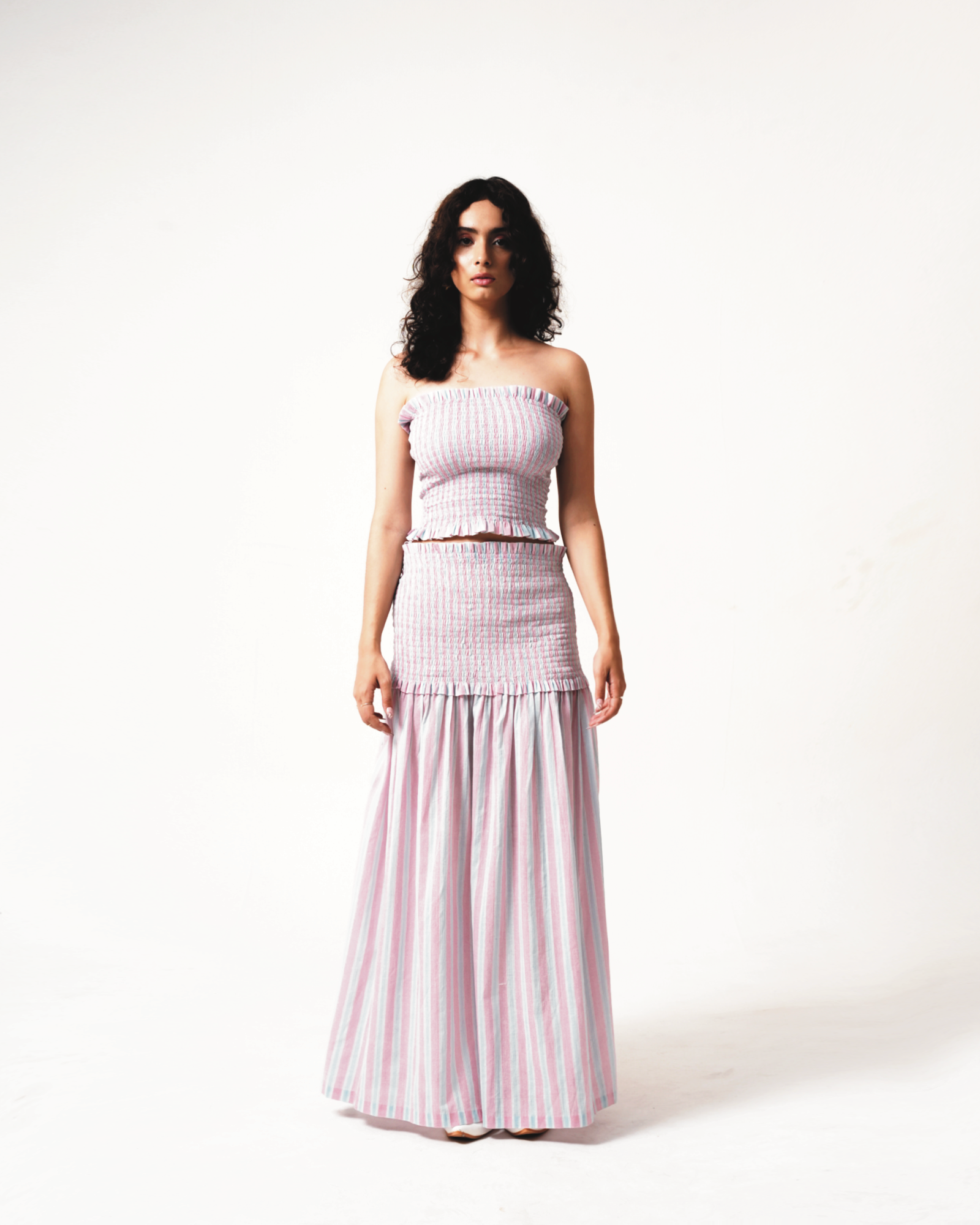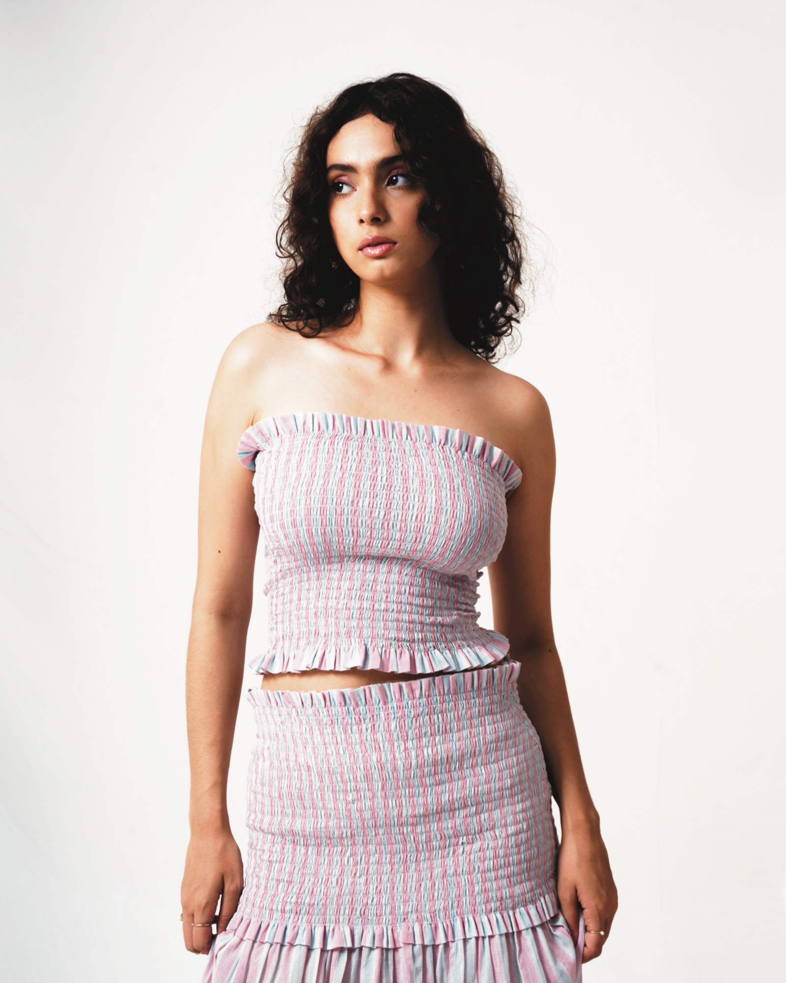 This Top blends softness with statement. Crafted in a pastel mix of blush pink and blue, its smocked bandeau silhouette hugs comfortably while flattering the form. Delicate ruffles at the neckline and hem add charm and movement, making it an effortlessly feminine piece. Pair it with high-waisted skirts or pants for a balanced, modern look — equally suited for slow brunches or sundown evenings.