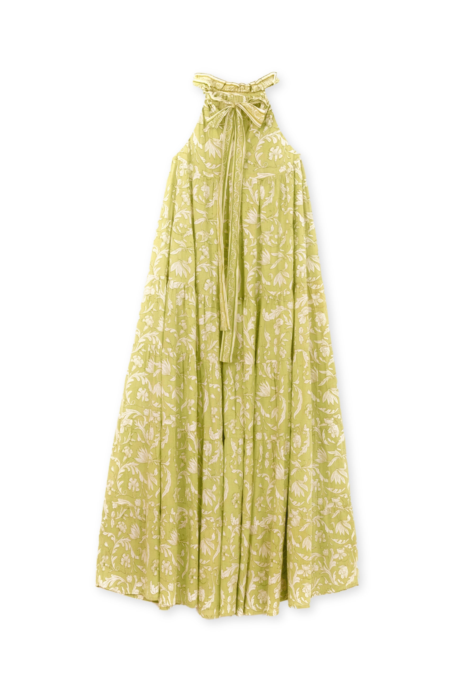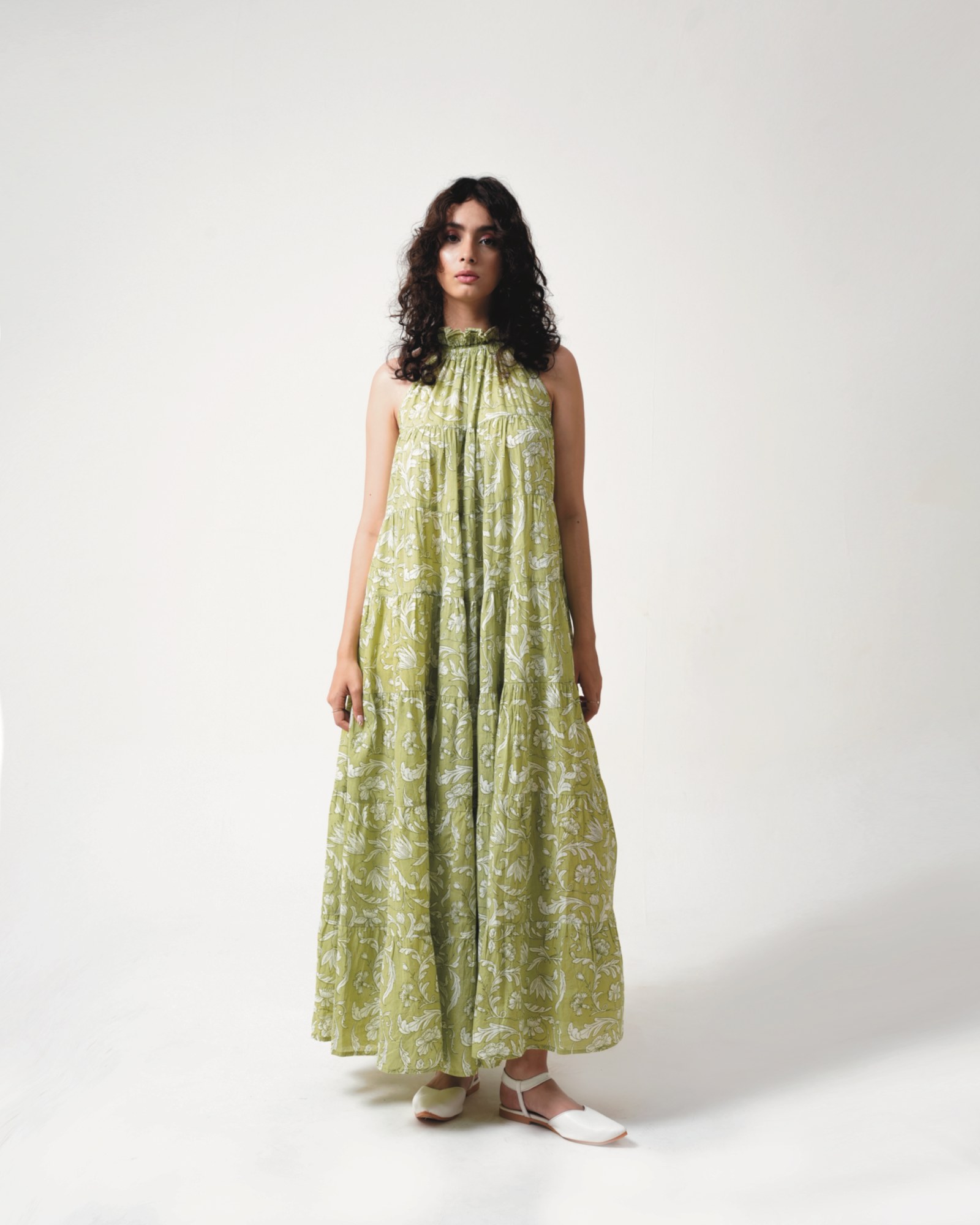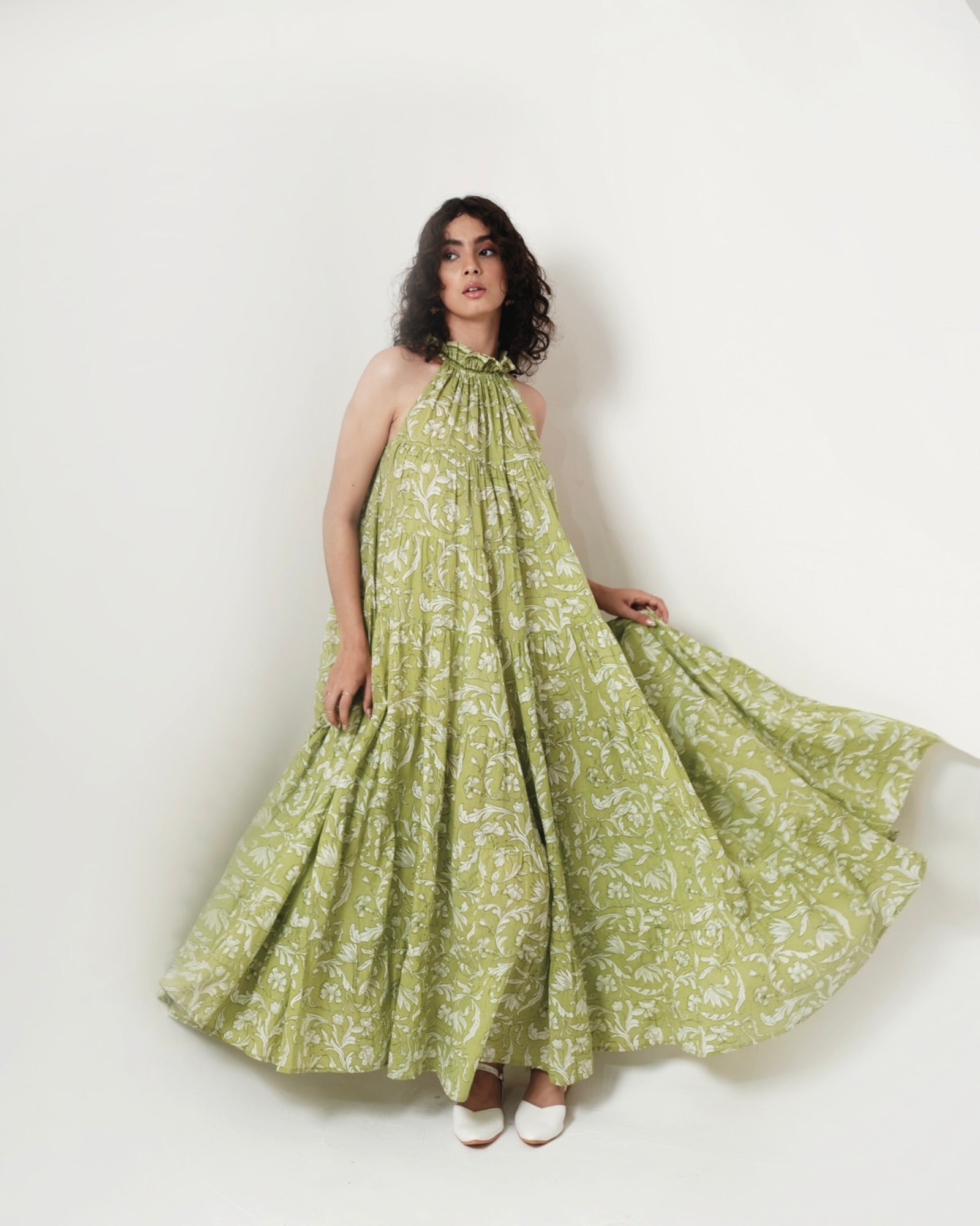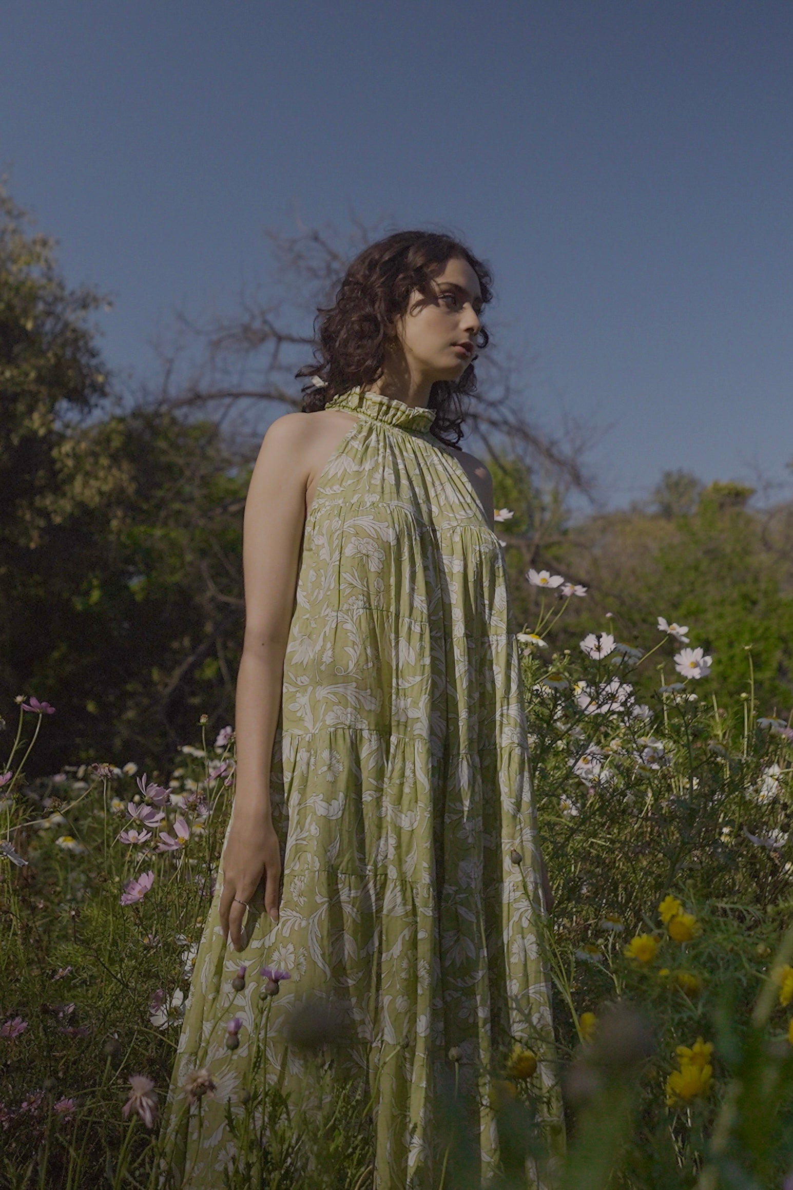 Designed for movement and ease, this halter-neck maxi dress embraces a free-spirited aesthetic with its gathered neckline and fluid silhouette. Crafted from soft cotton, it offers both comfort and breathability, making it perfect for sun-drenched days. The muted green hue, paired with a delicate floral pattern, enhances its natural and feminine appeal.