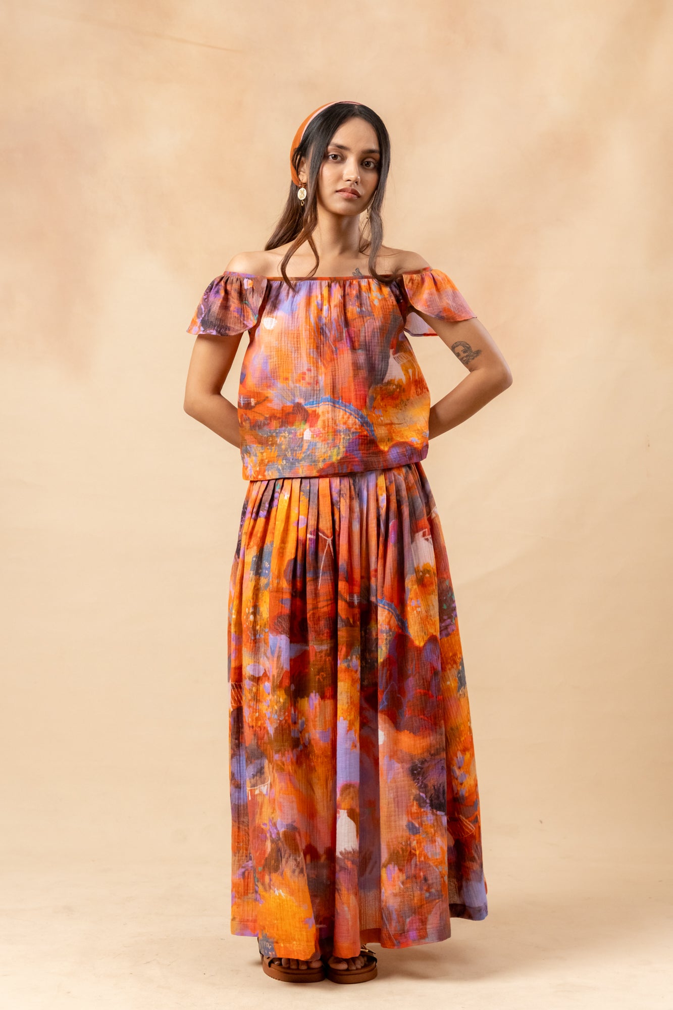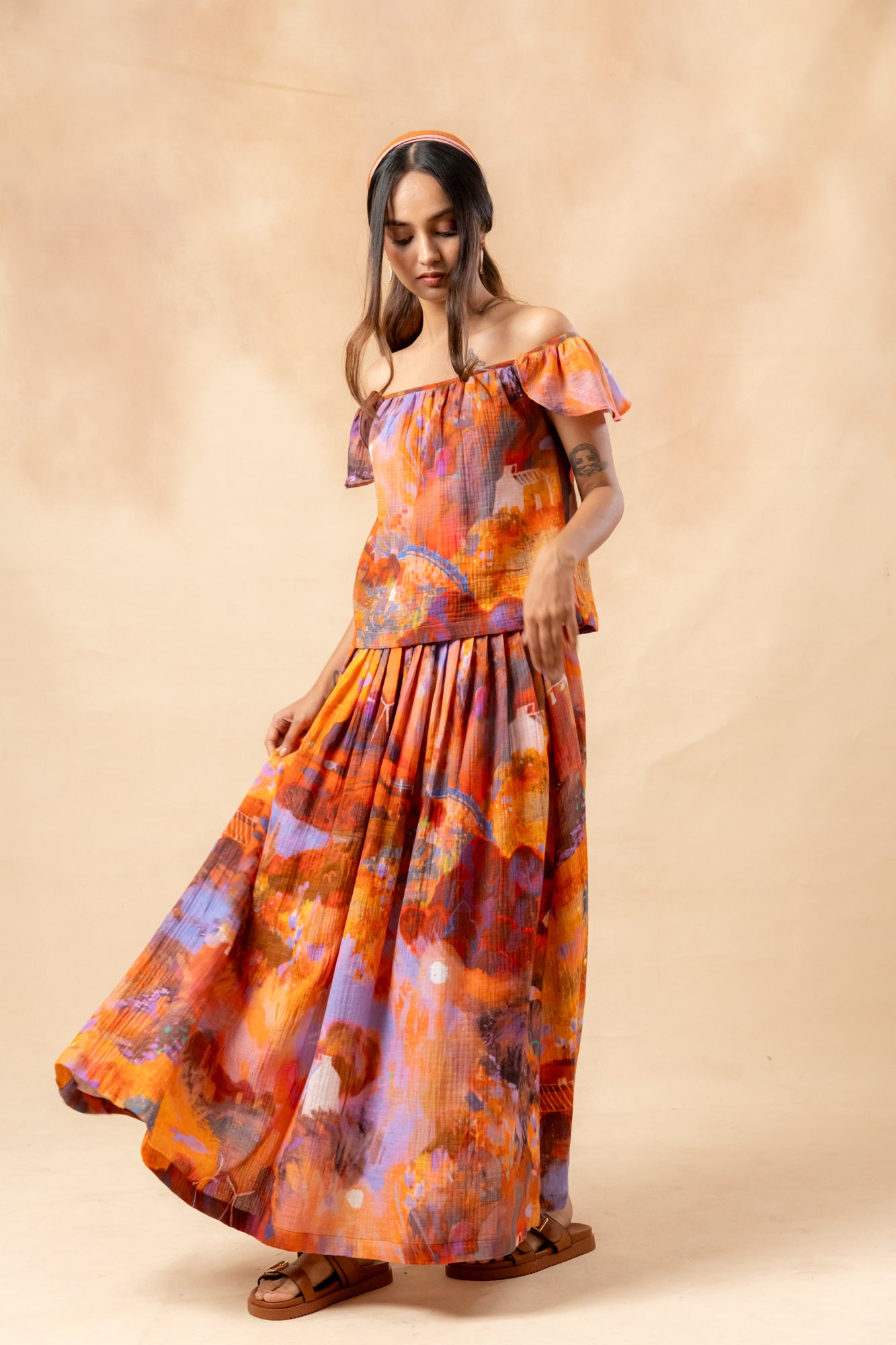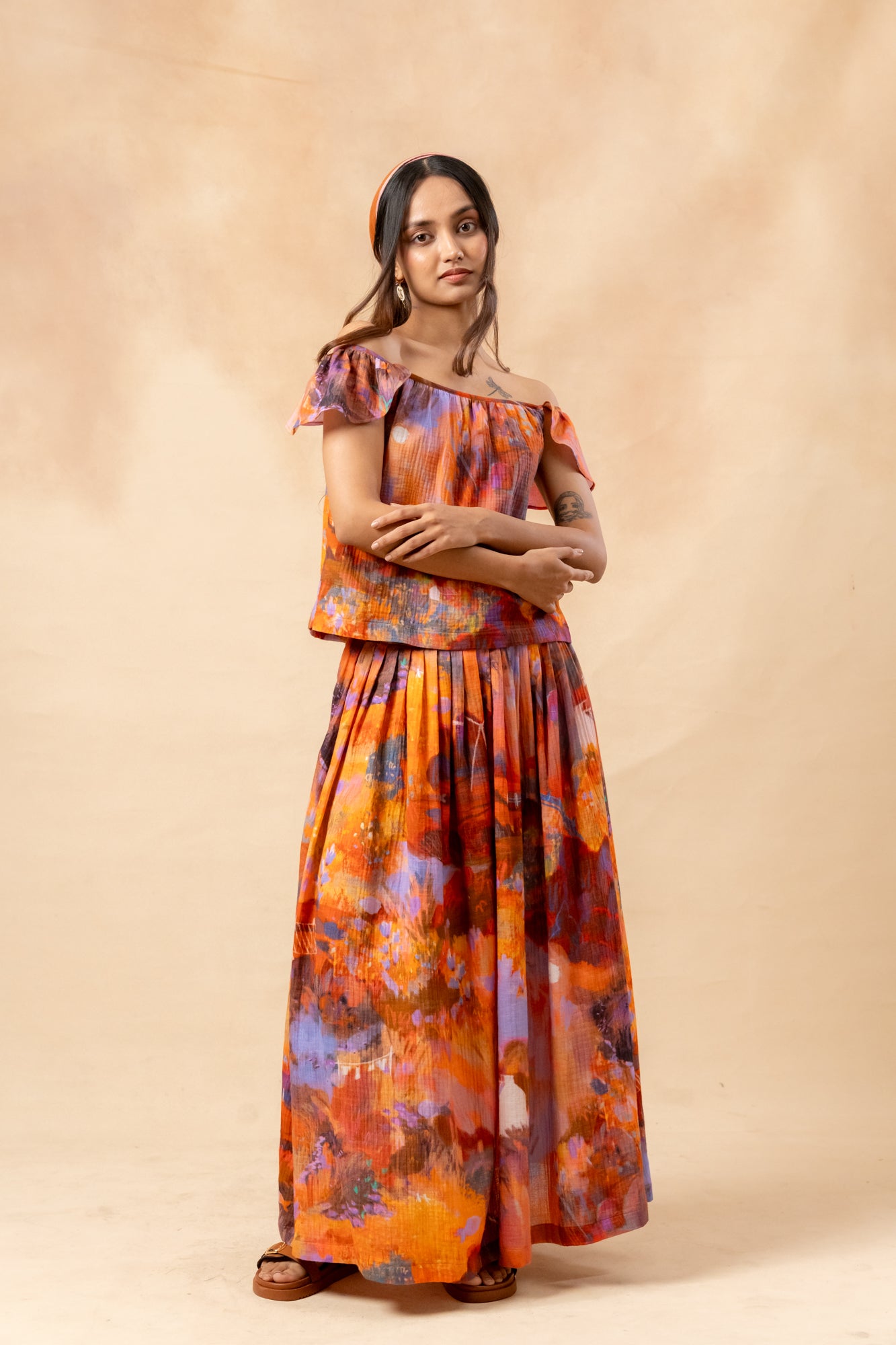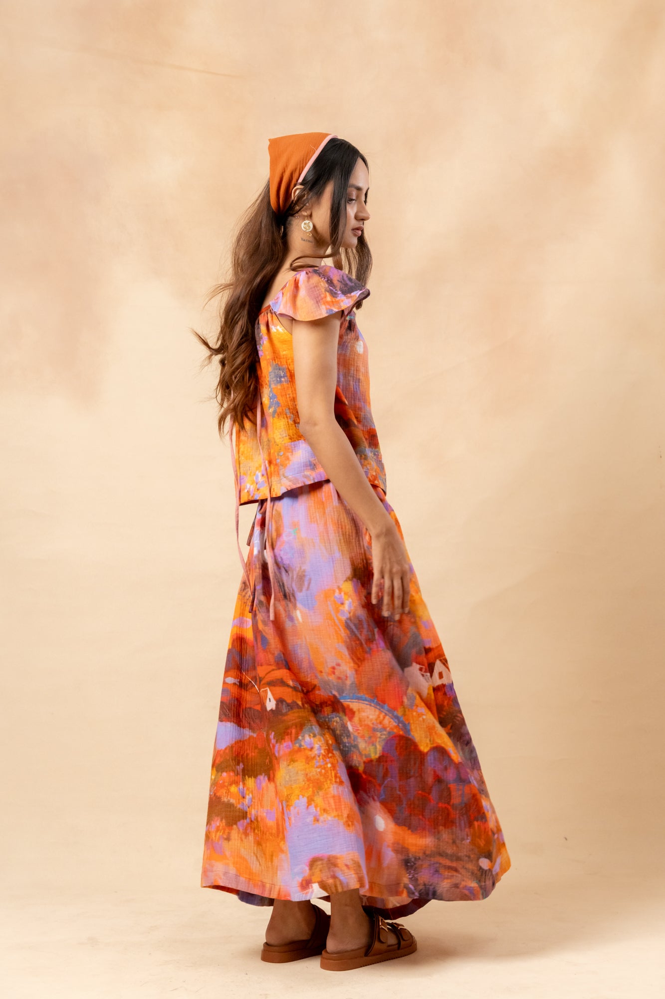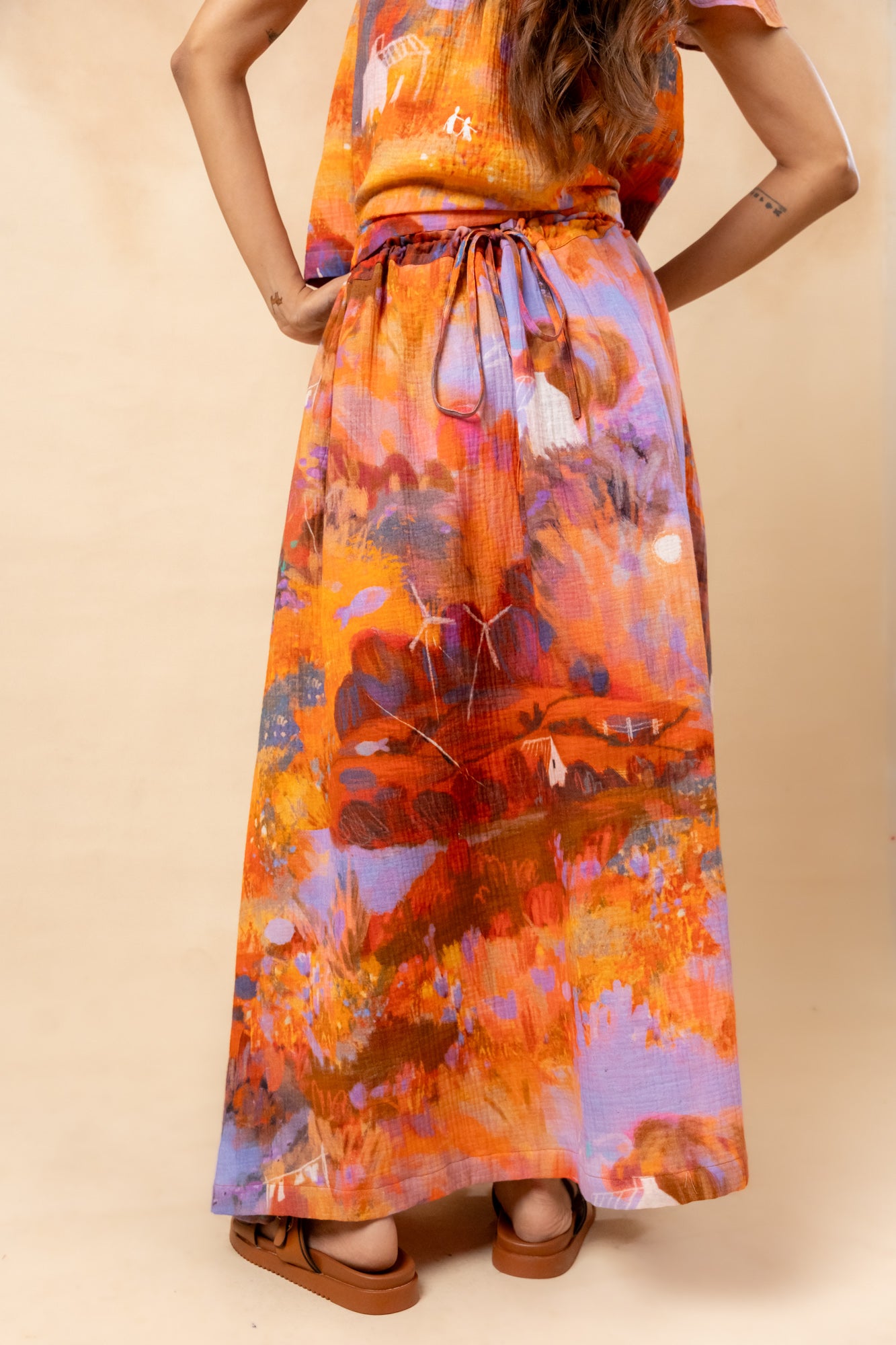 Description: This doodle printed skirt comes with front pleats, adjustable back with drawstrings and side pockets.