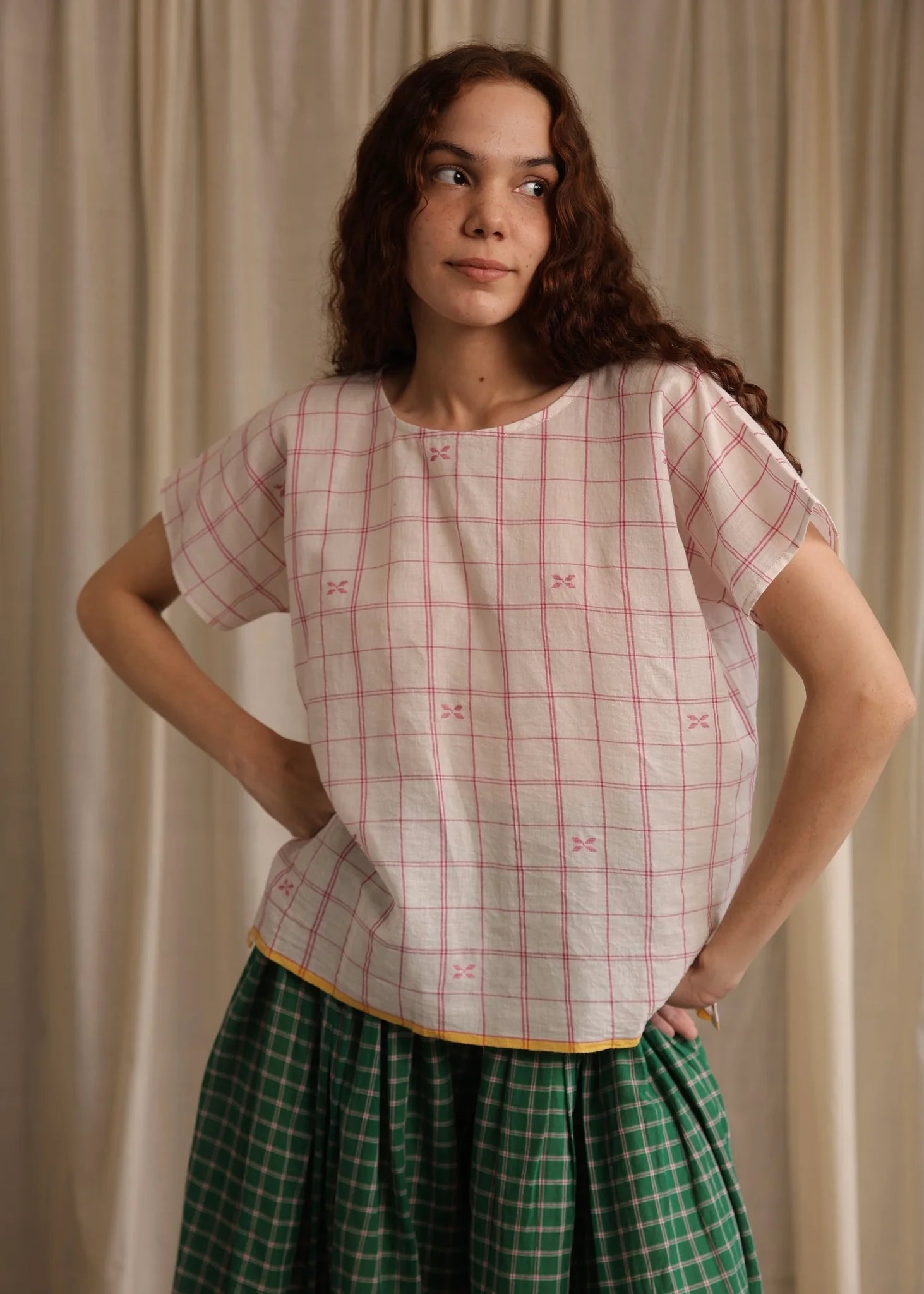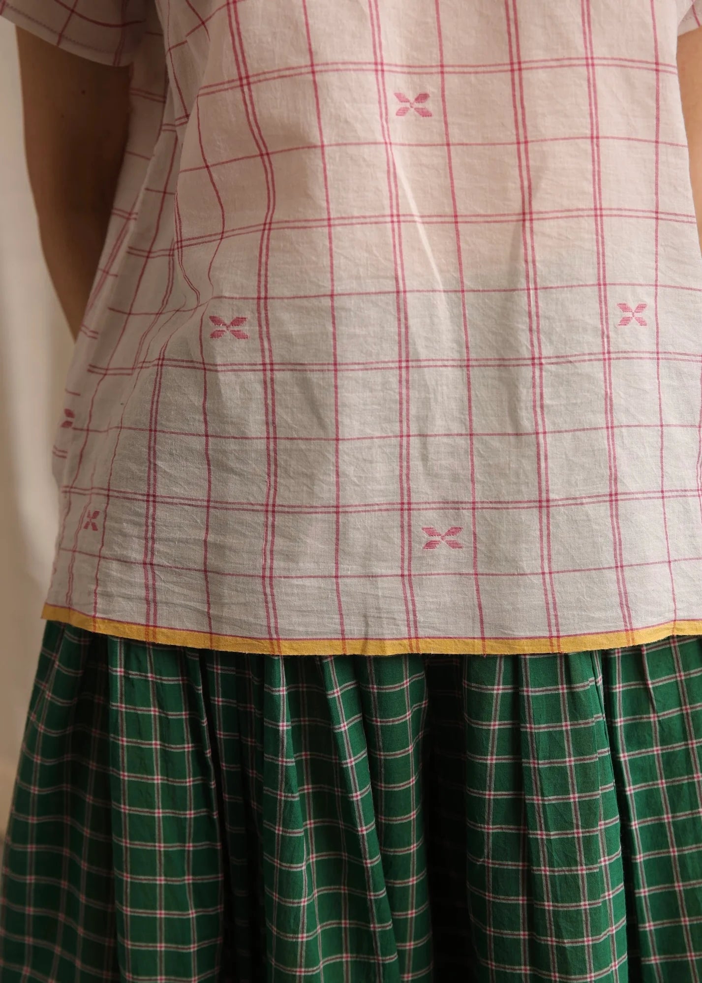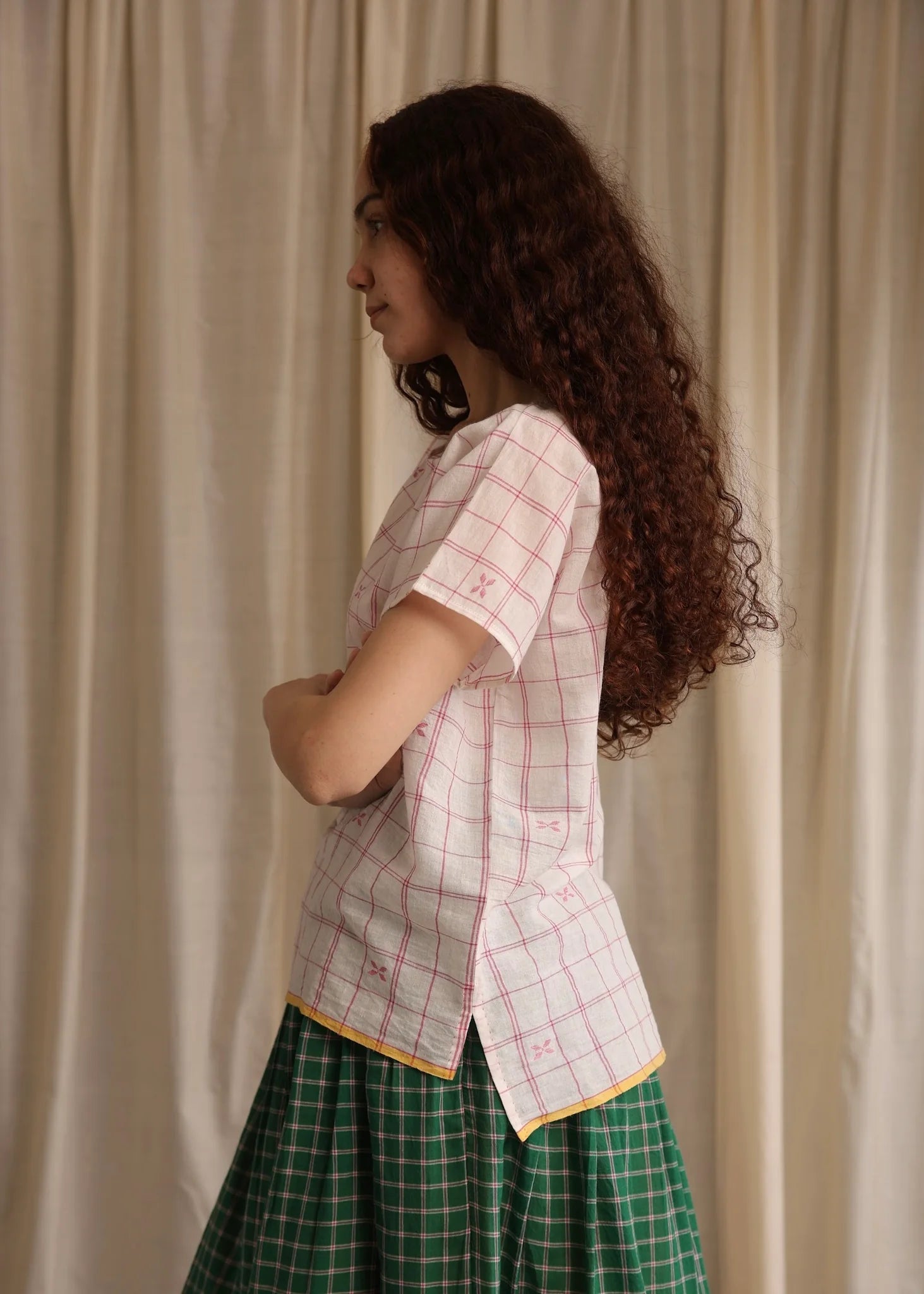 A timeless classic with a modern twist. Crafted from lightweight Jamdani fabric, this elegant top features intricate woven motifs and a contrasting yellow selvedge—a perfect pop of color for effortless charm.