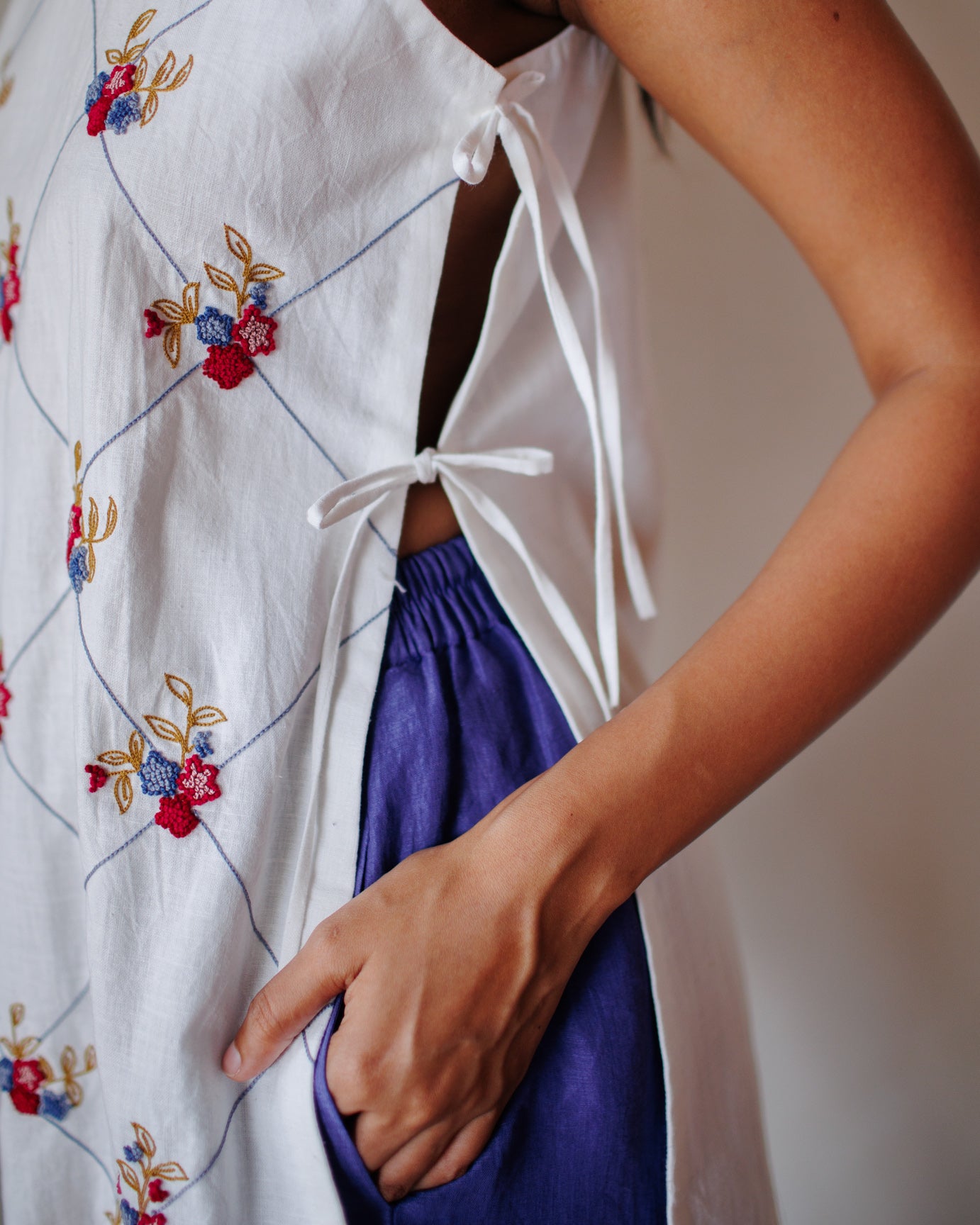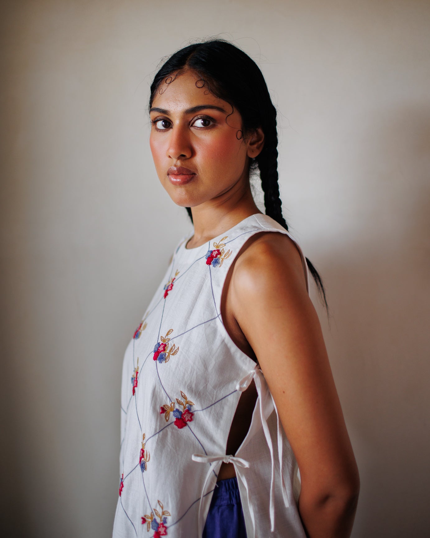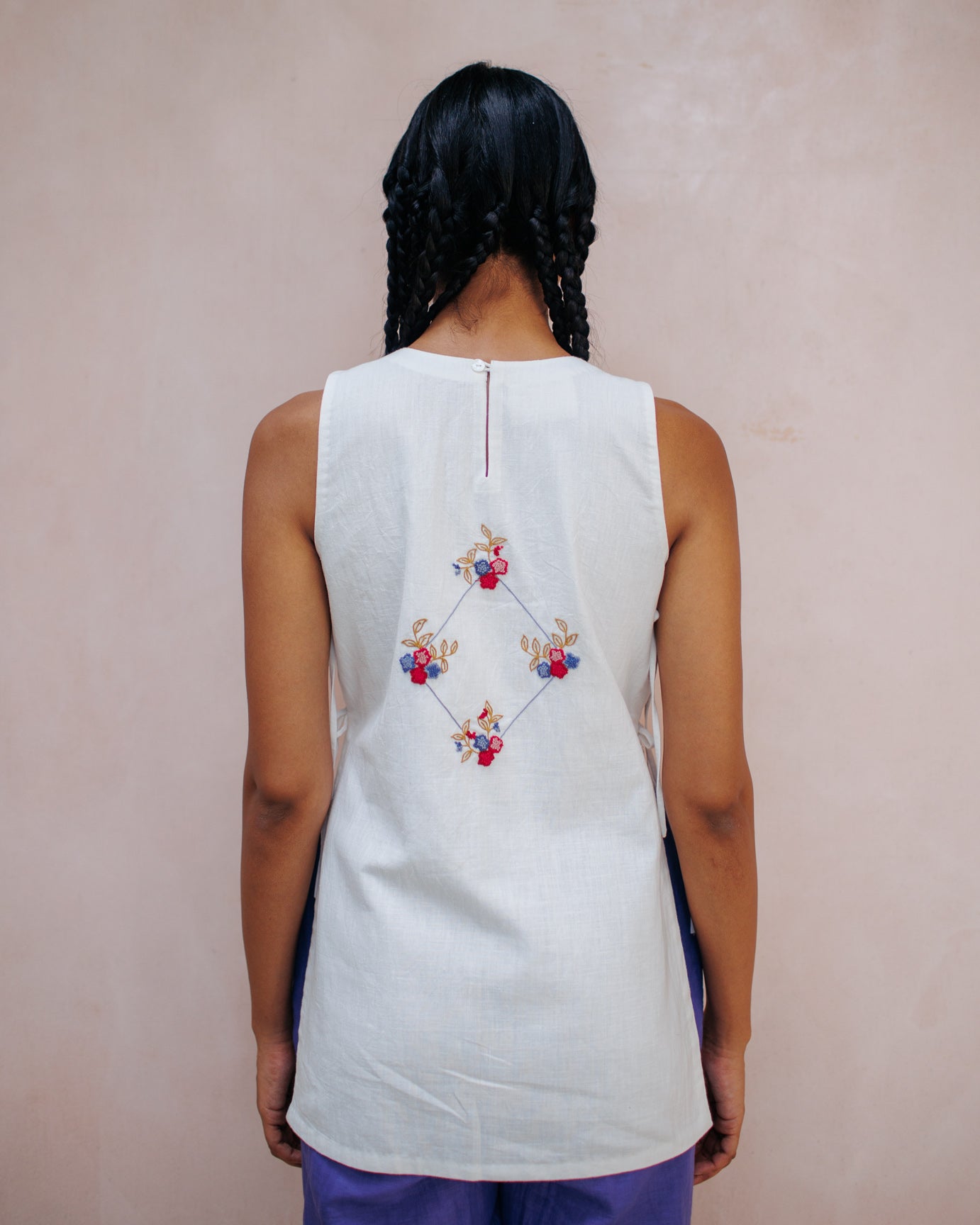 An oversized bib top made from hand spun, handwoven Khadi. Hand-embroidered over 30 hours using traditional aari embroidery. Features side tie-ups and a keyhole opening at the center back for easy wear. A relaxed yet detailed piece that reflects thoughtful craftsmanship.