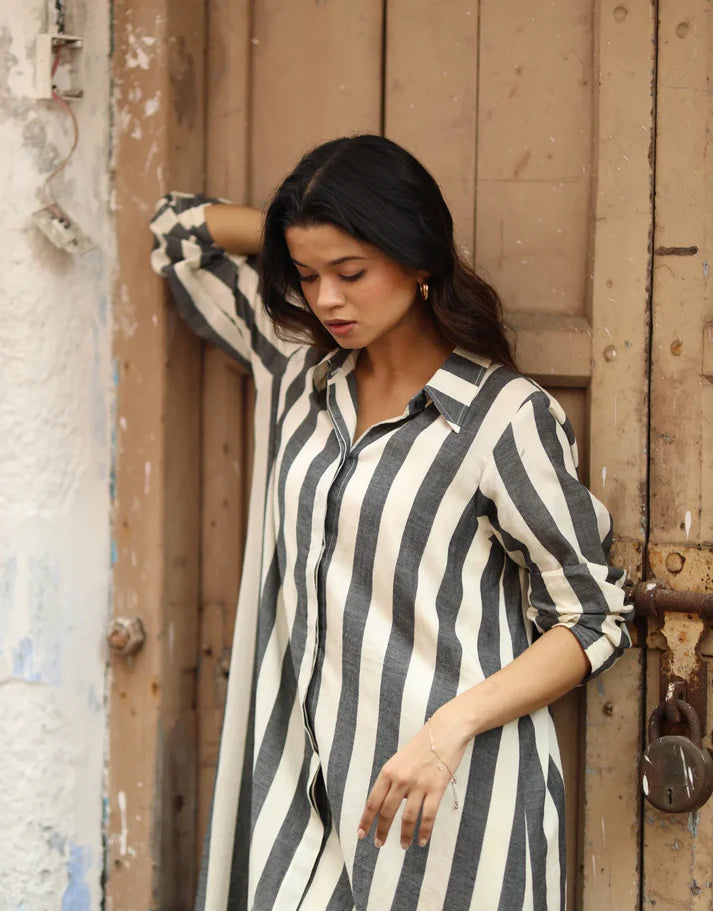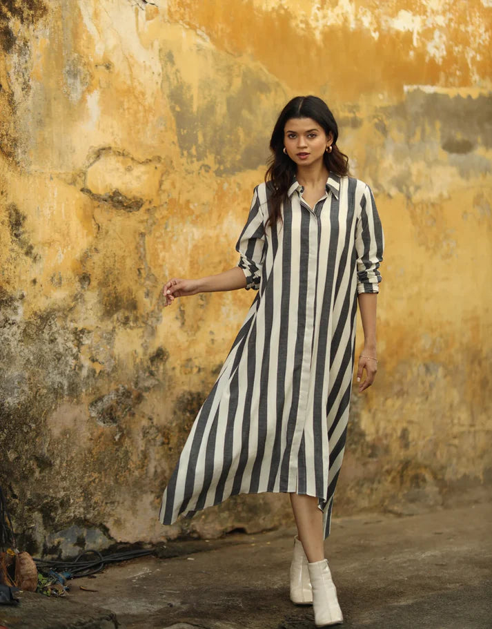 Versatile shirt dress with an angled hem, double placket, and striking black deck chair stripes is created in handloom cotton fabric.
