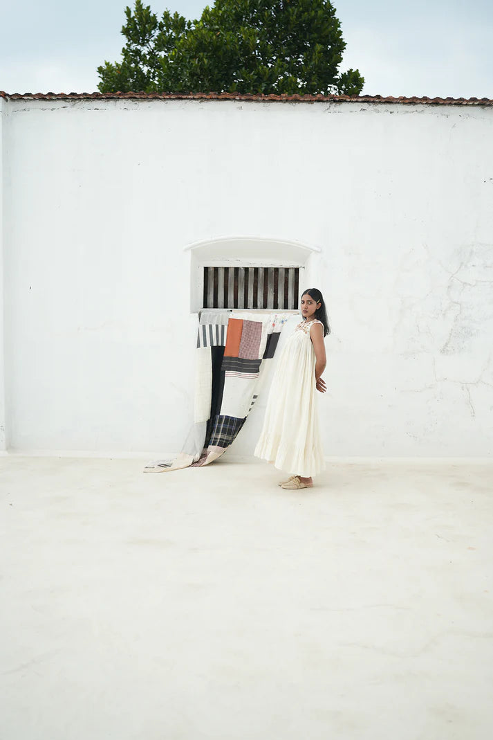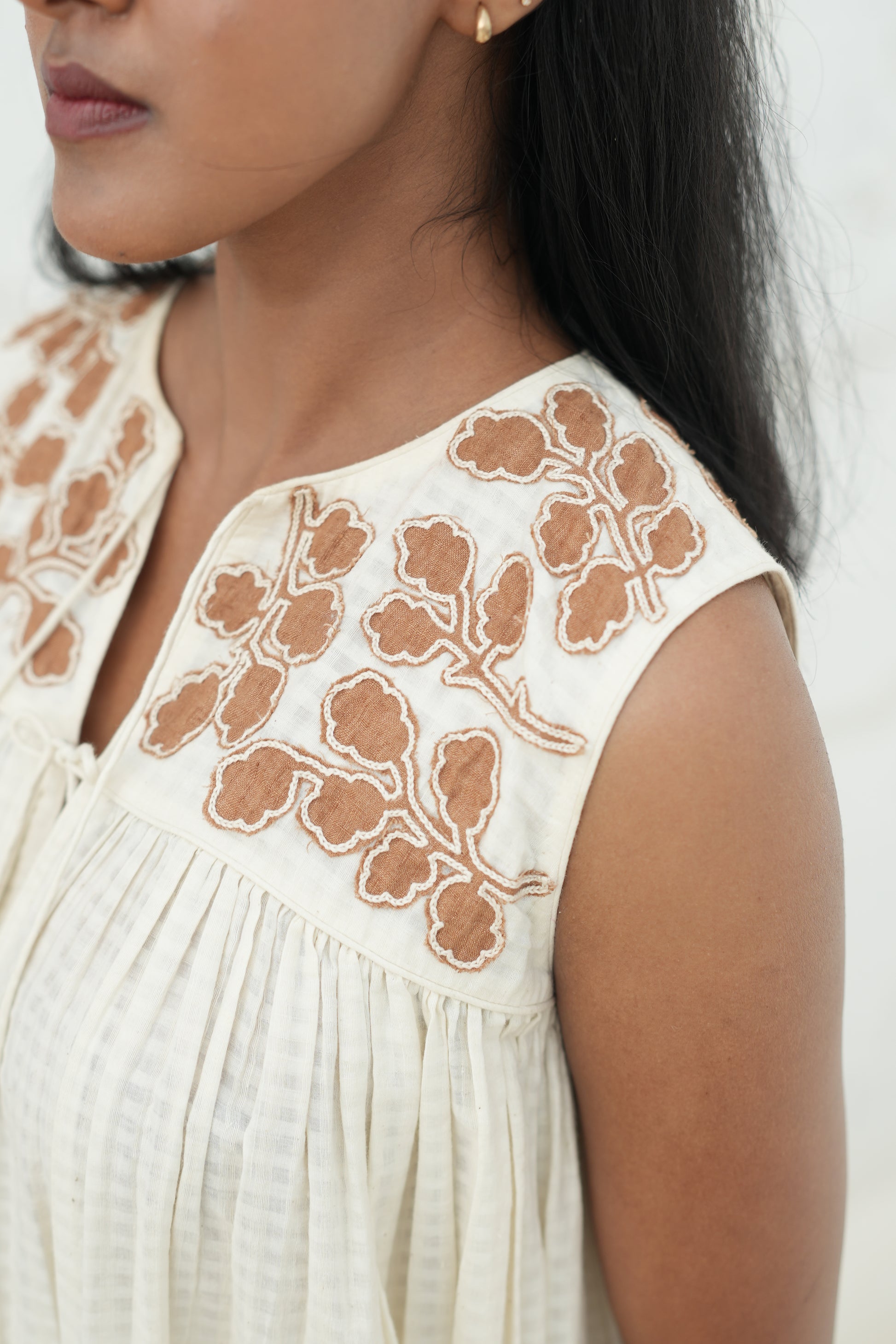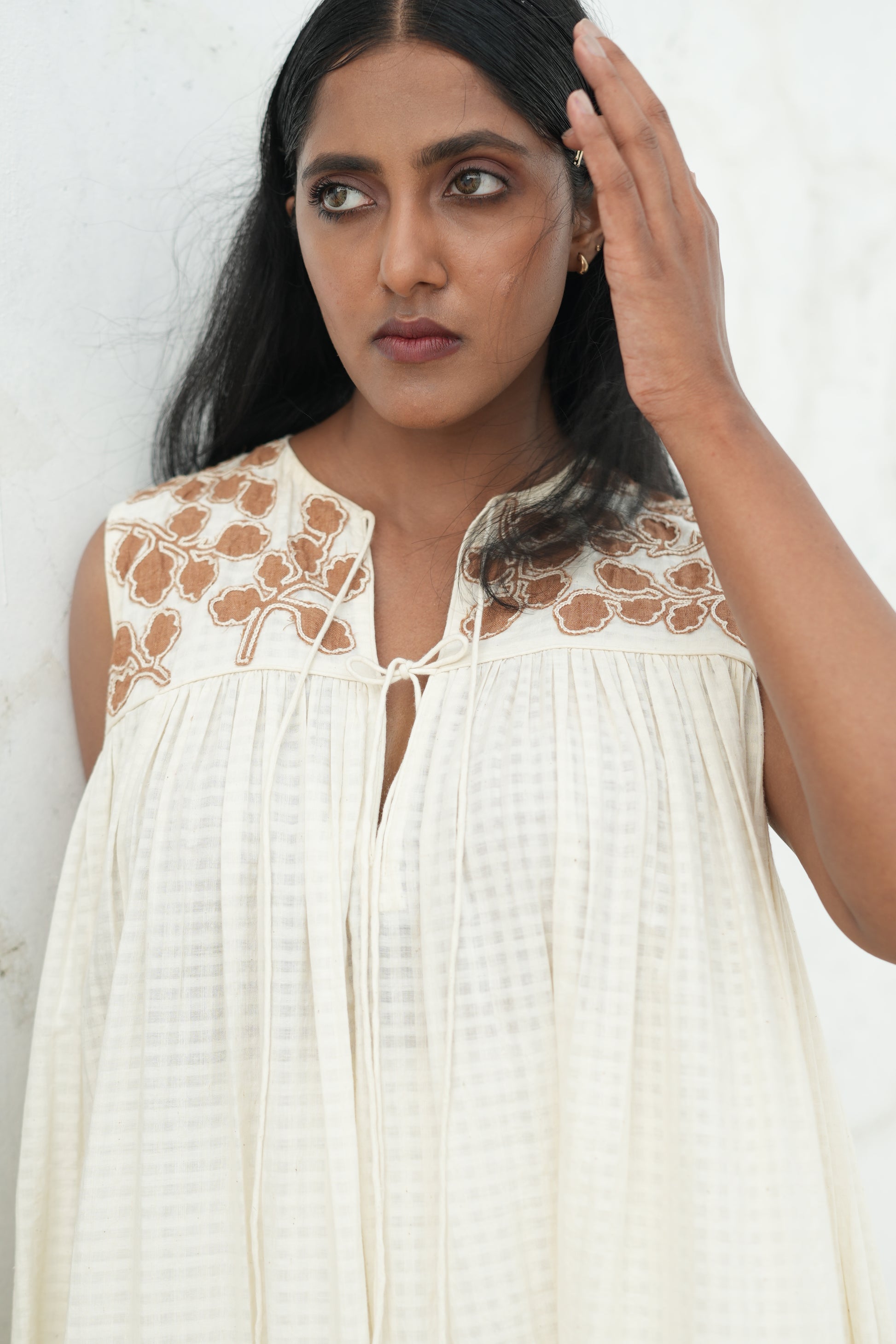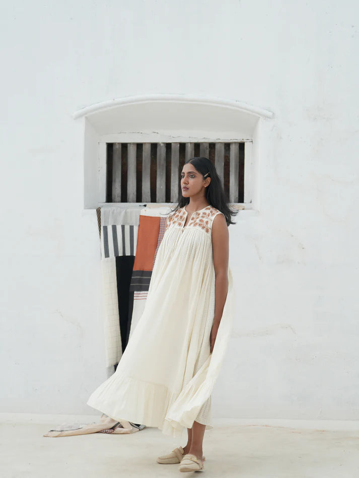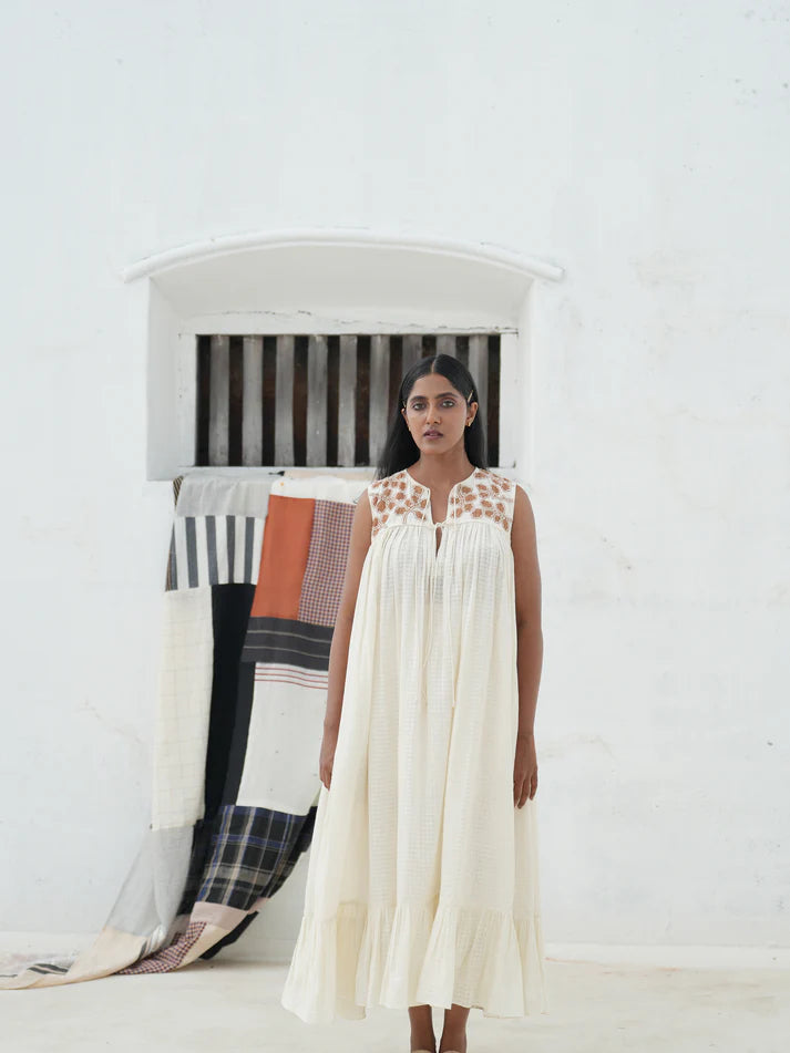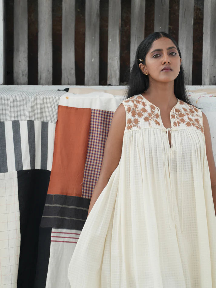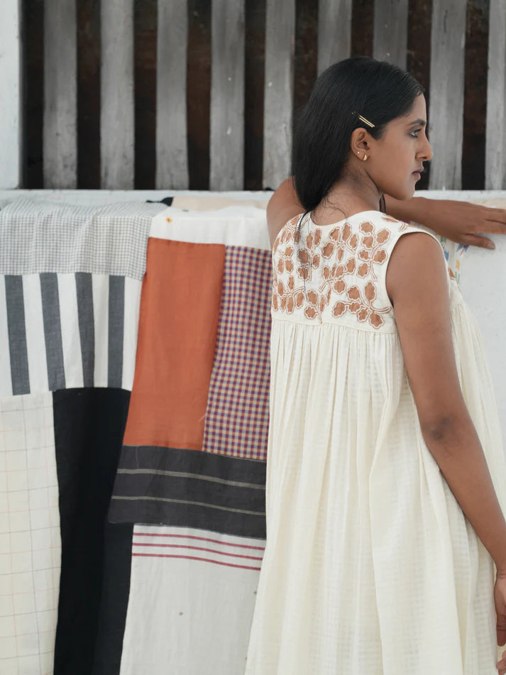 THE MAPLE DRESS in handloom cotton, this sleeveless dress offers a soft, breathable feel, making it perfect for all-day wear. The gathers from the yoke create a flowing silhouette that enhances movement, while the intricate appliqué work on the front and back yoke adds a touch of artisanal craftsmanship.