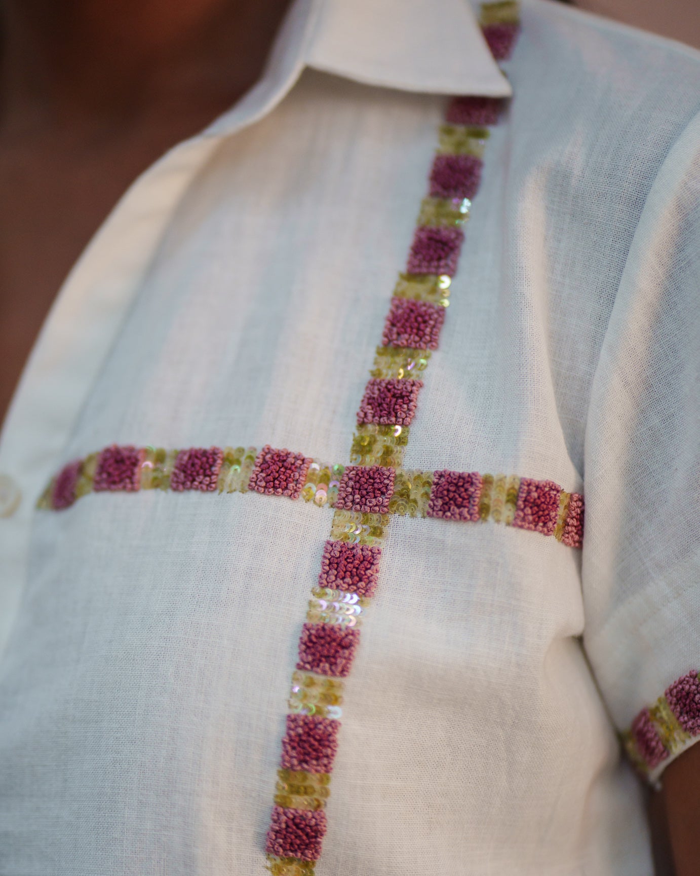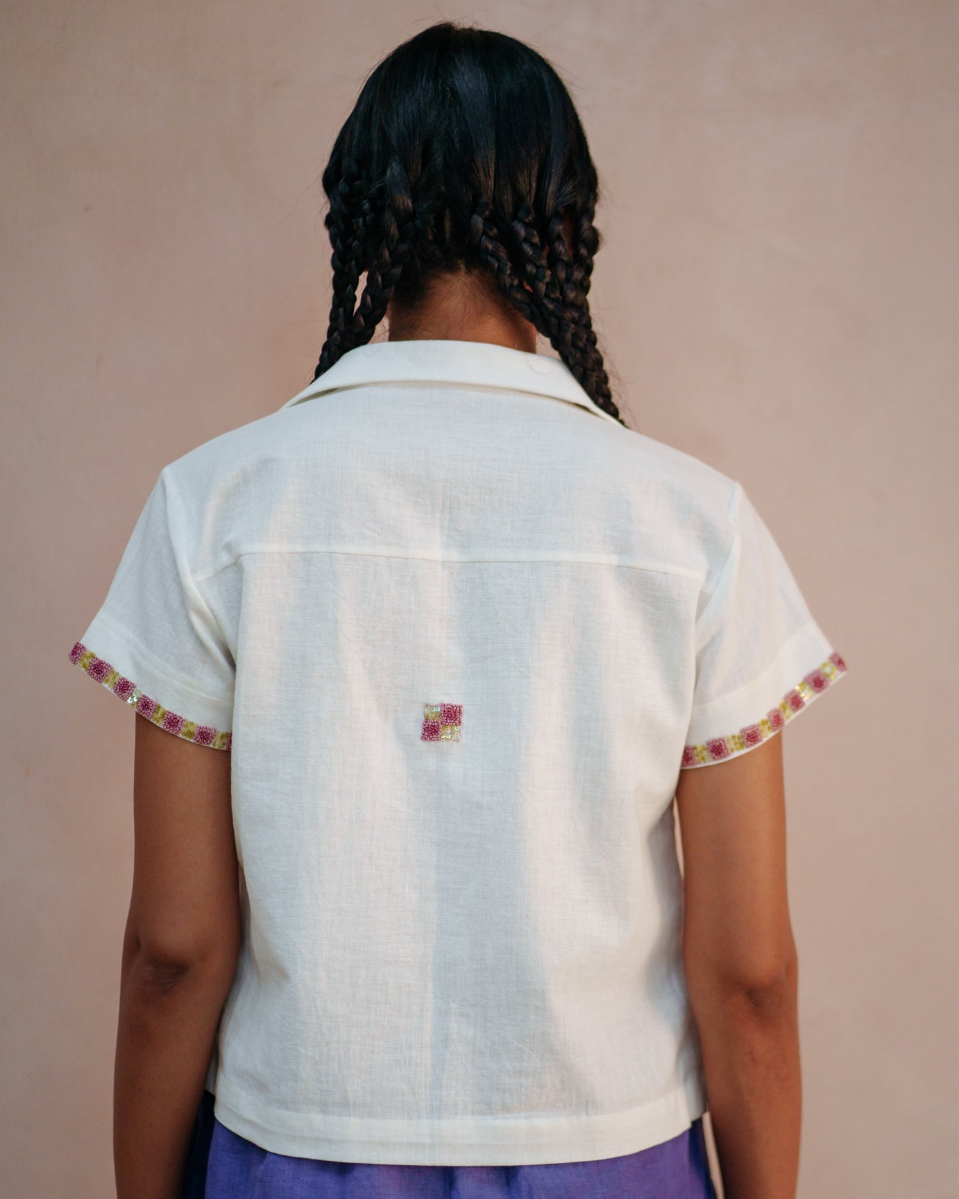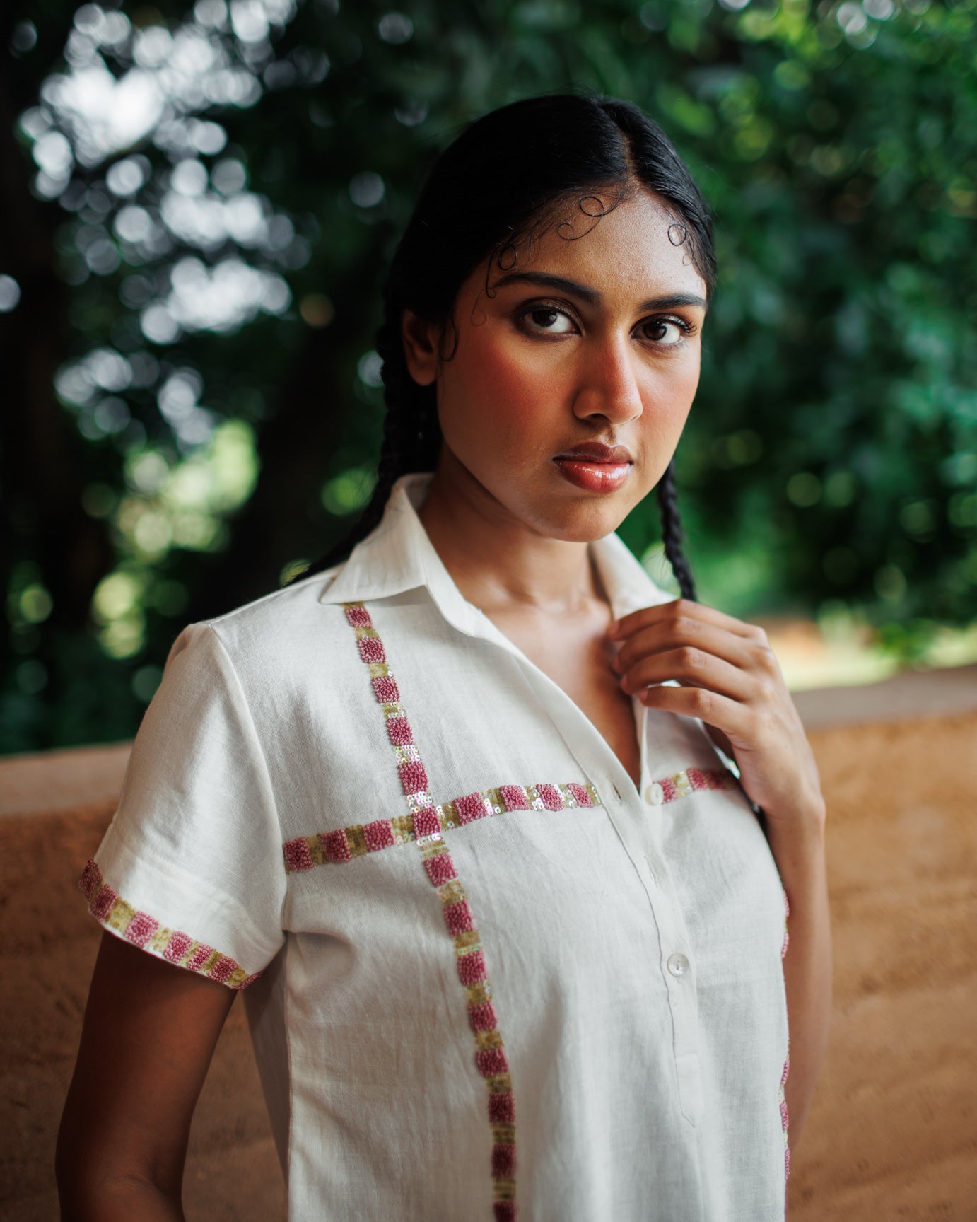 A relaxed-fit top with a popover placket and classic shirt collar, crafted in handspun and handwoven Khadi. It features our signature aari embroidered motifs, detailed with French knots and sequins.