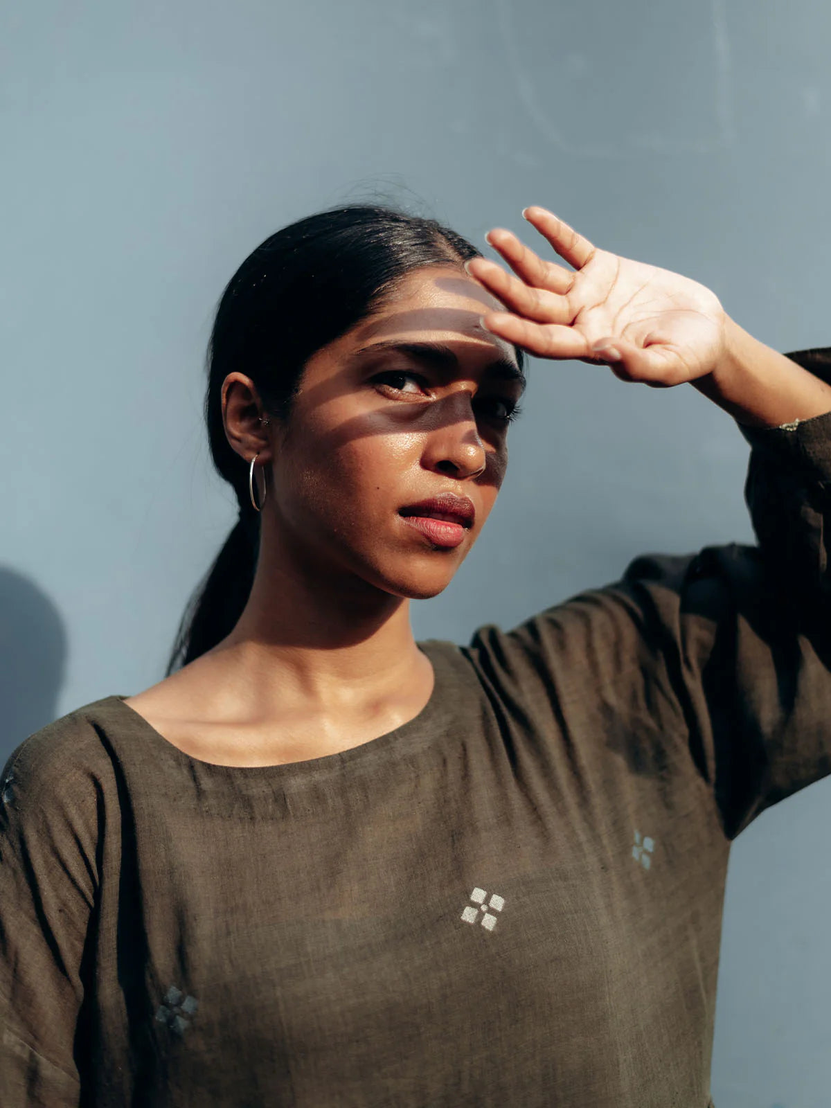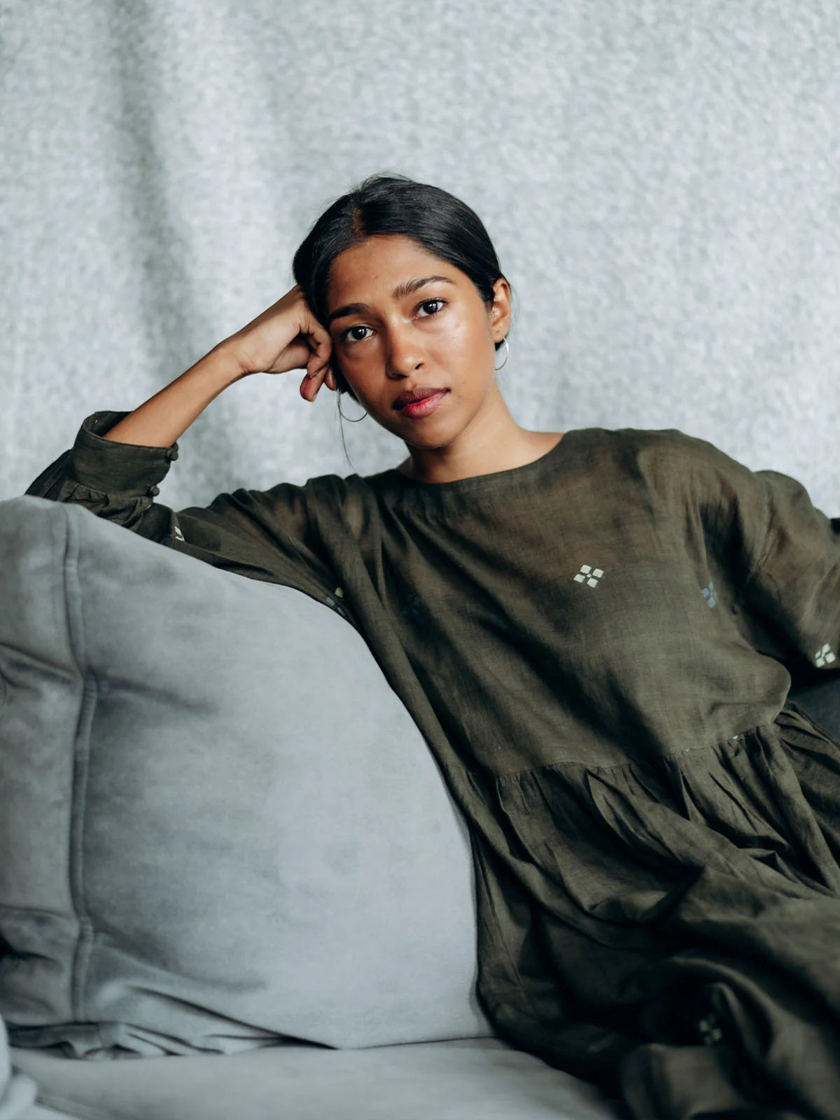 Drawn from the memory of a sojourn to Murshidabad in West Bengal. A temple trail, and a scene of a woman gathering flowers for her morning worship–an everyday early morning scene in quiet towns and even larger cities. Floral motifs in Indigo and white scattered on a naturally dyed green which was meant to be grey, and we have a result called accidental beauty. Gathered waist dress with drop shoulders, cuffed full sleeves and button closure at the back. Comes with a handwoven cotton slip.
