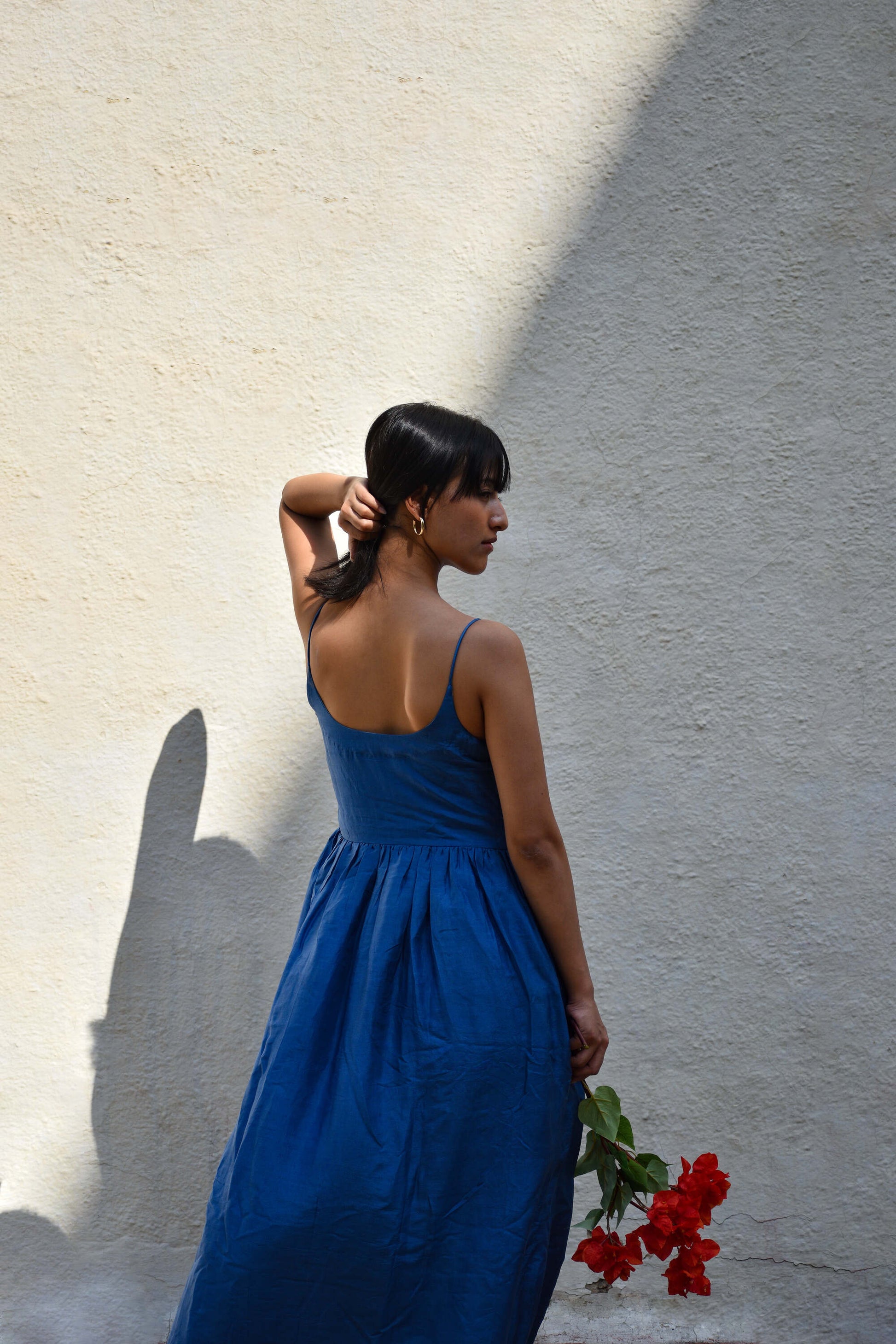 Make a statement in this effortless silk dress with gathers along the waist, and noodle straps. The blue is inspired by a naturally dyed medium shade of indigo from our archives. The dress has a generous fall, pockets and size zip closure. Lined with handwoven cotton.