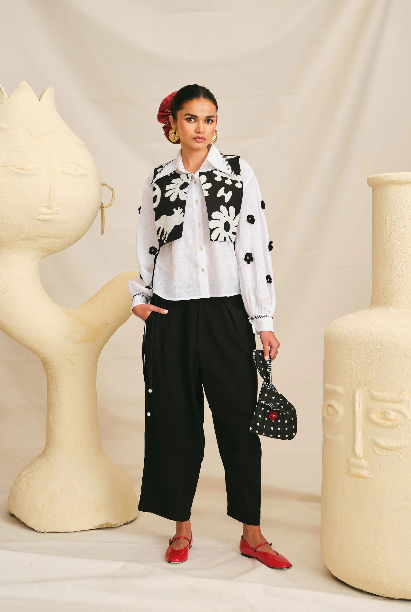 This beauty is crafted in cotton and adorned with delicate hand-crocheted flowers. An effortless, oversized shape with wrist-grazing sleeves and hand-embroidered details on the collar, this Meso crochet shirt is a bold statement.