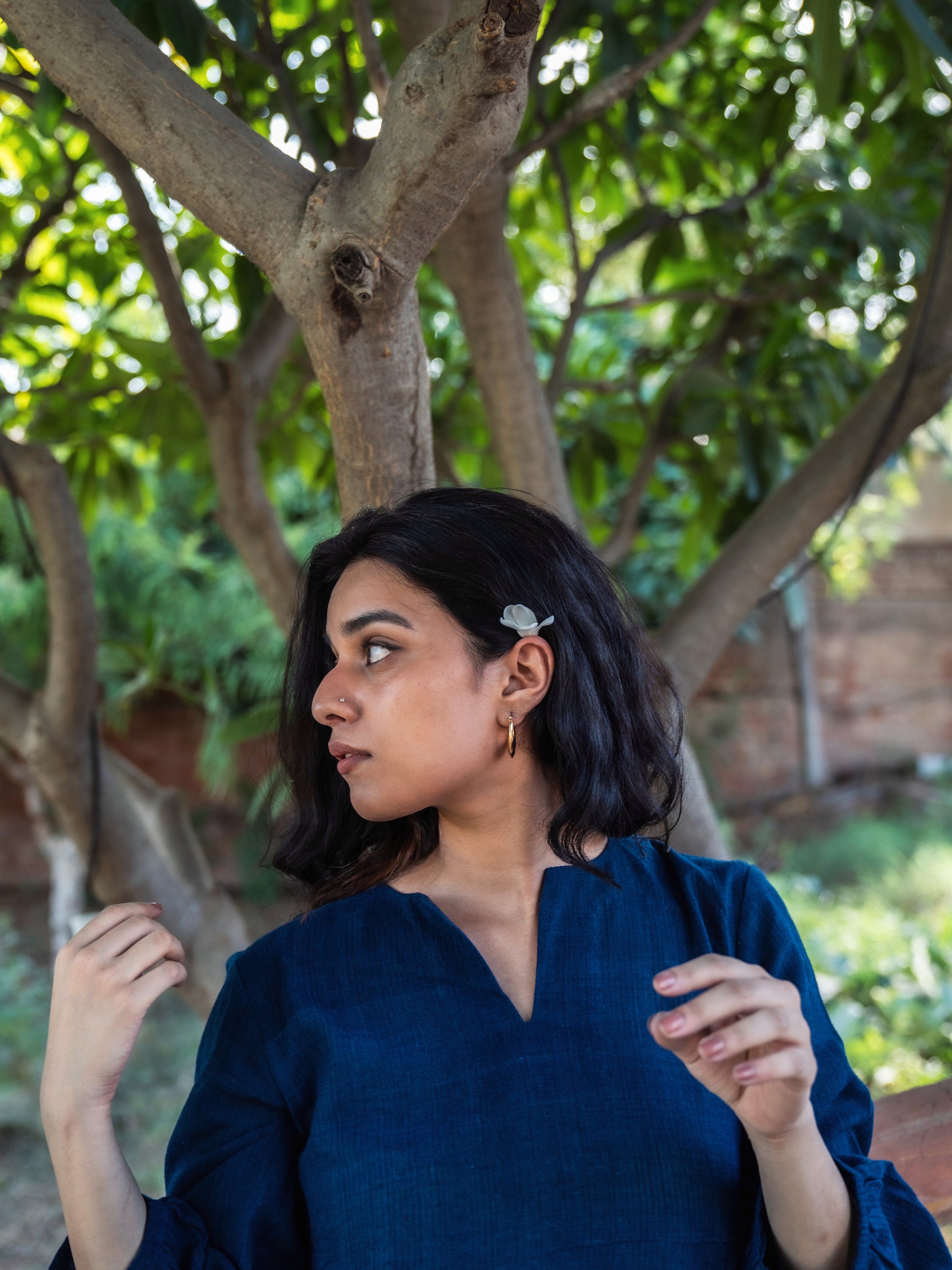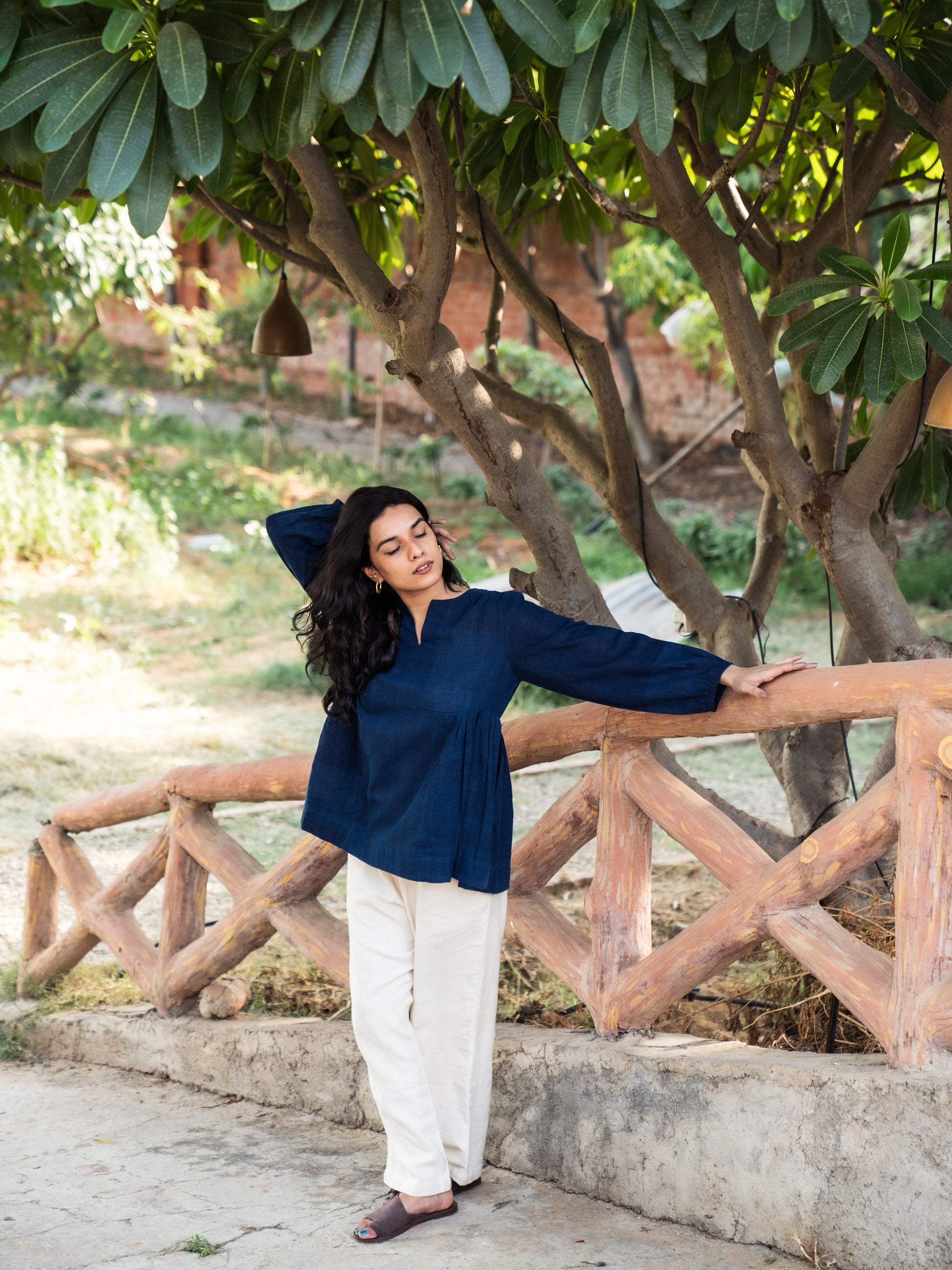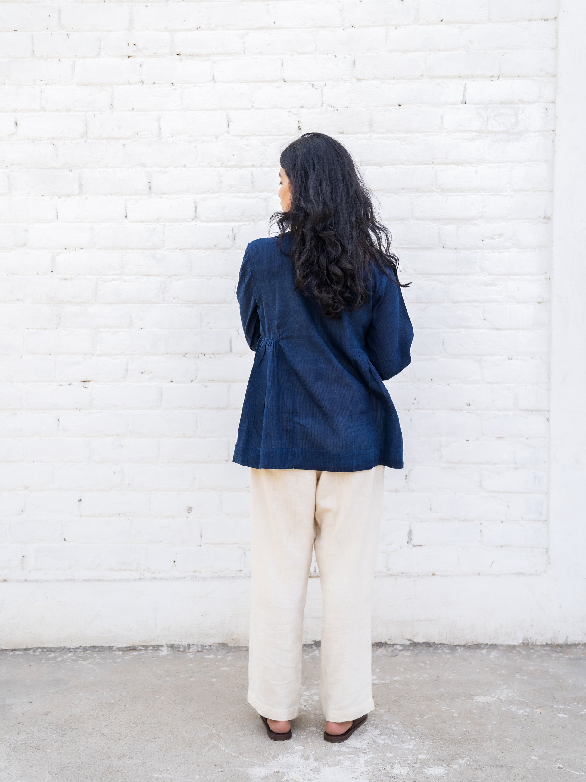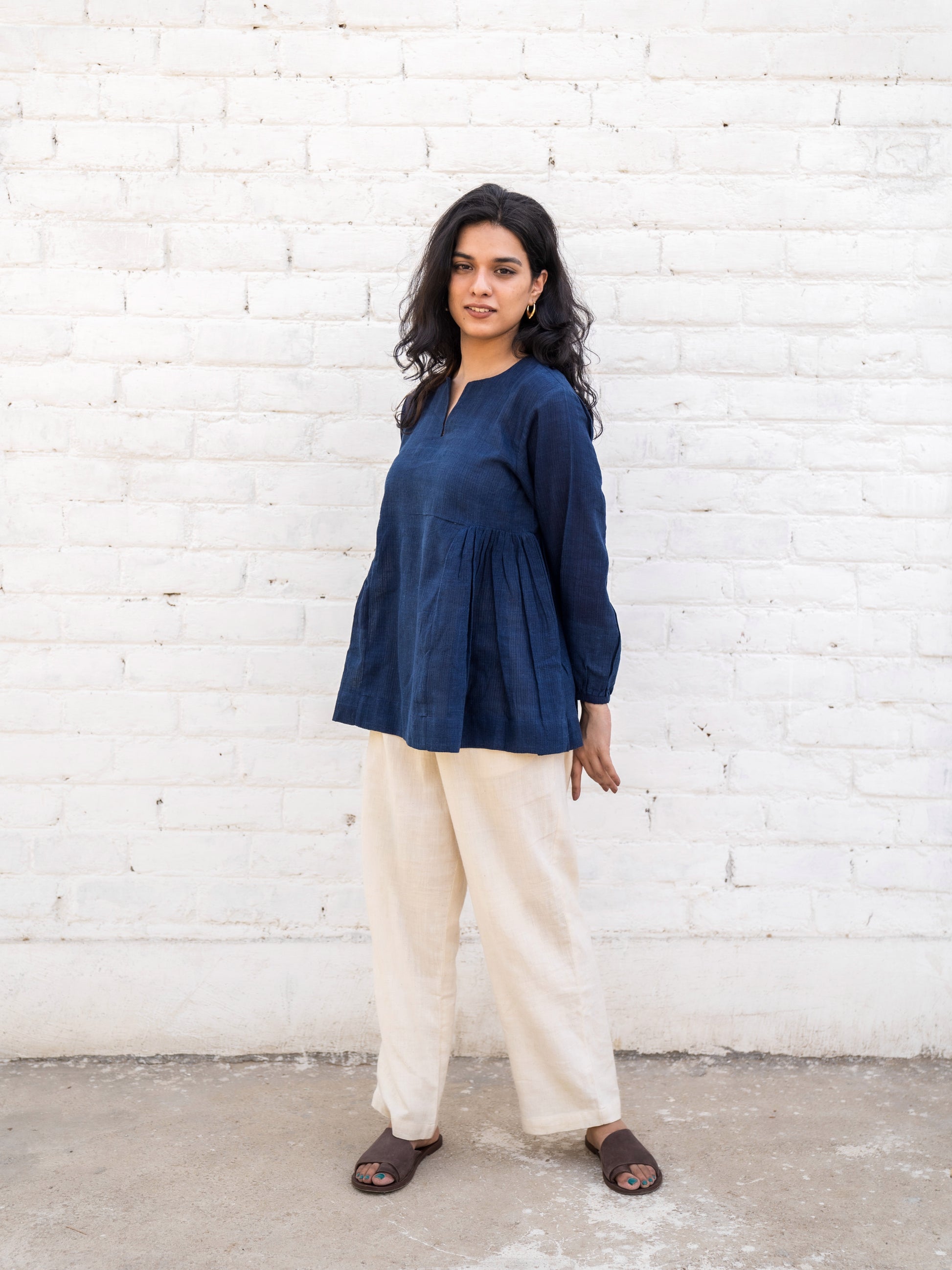 Full sleeves top with side gathers, light-weight cotton with self stripes that look like ridges. There may be colour variation in the textile on account of natural dyeing which only adds to its character.
