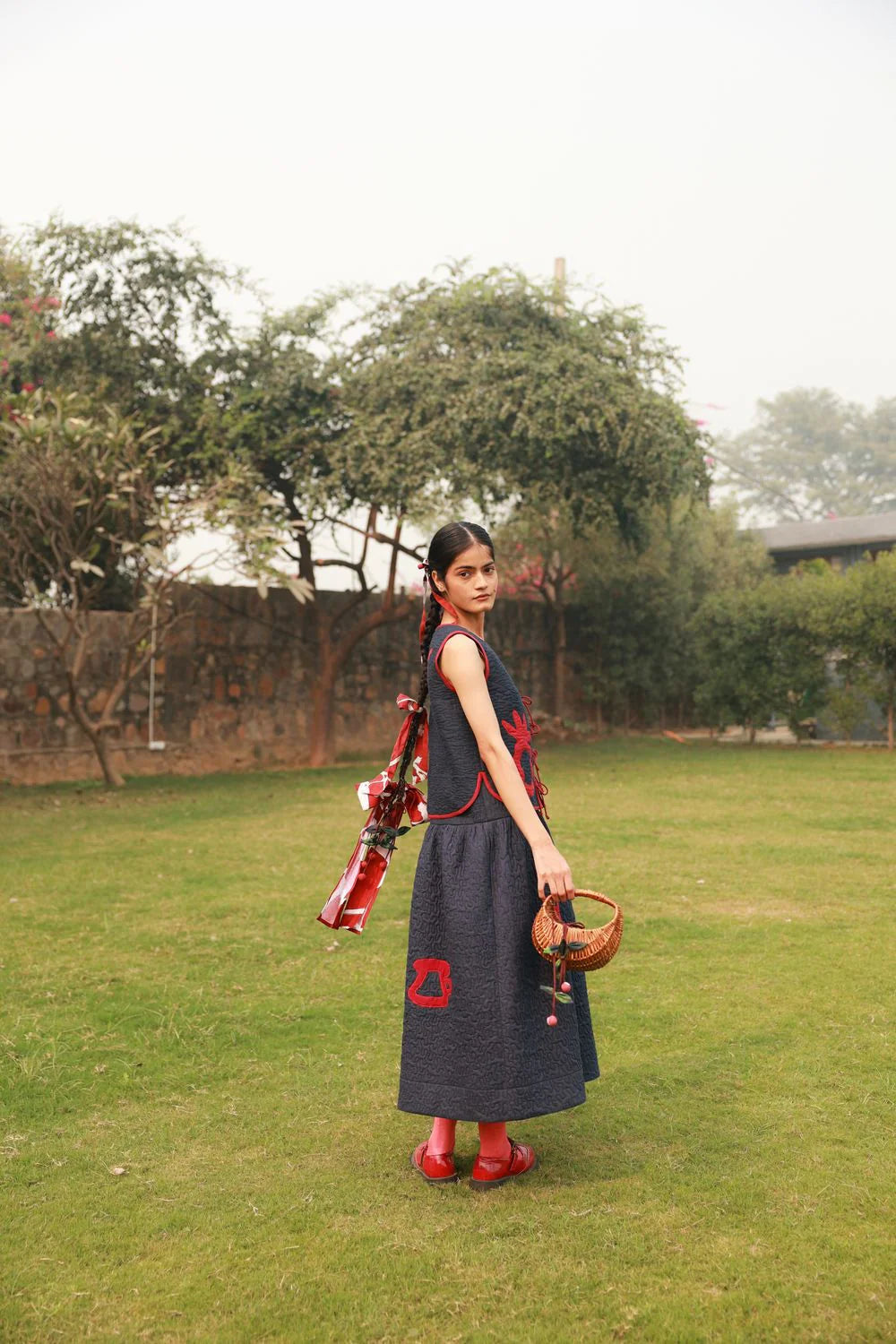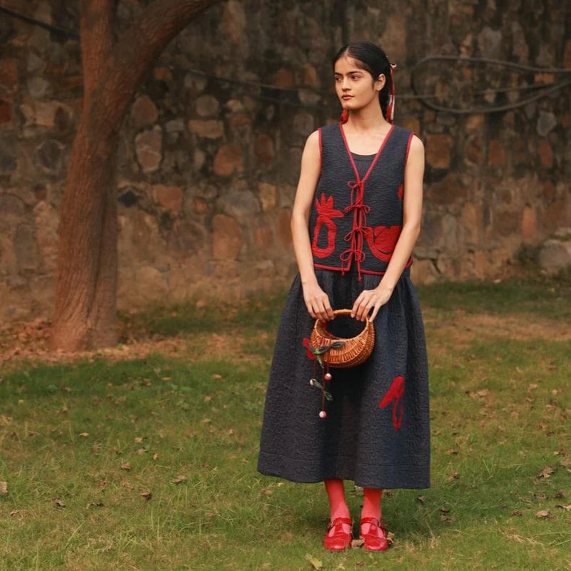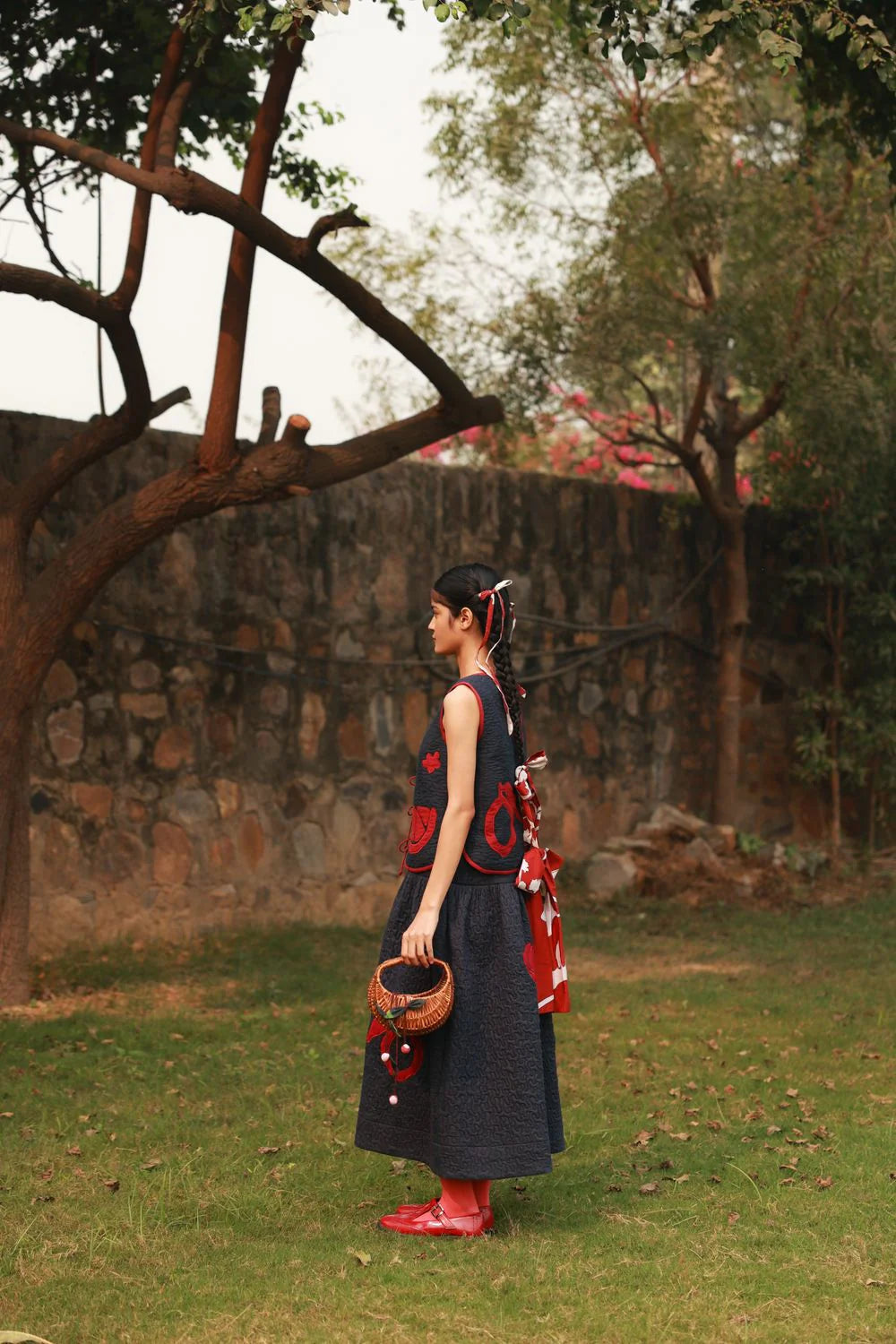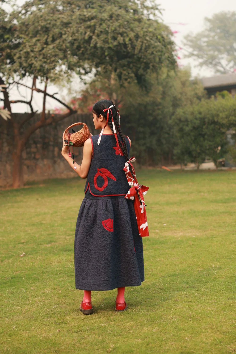 A charming navy quilted vest with bold red appliqué motifs and tie-up closures. Featuring a flattering V-neck and intricate detailing, this versatile piece adds a playful touch to your layering game. Perfect over a dress or paired with a casual outfit.