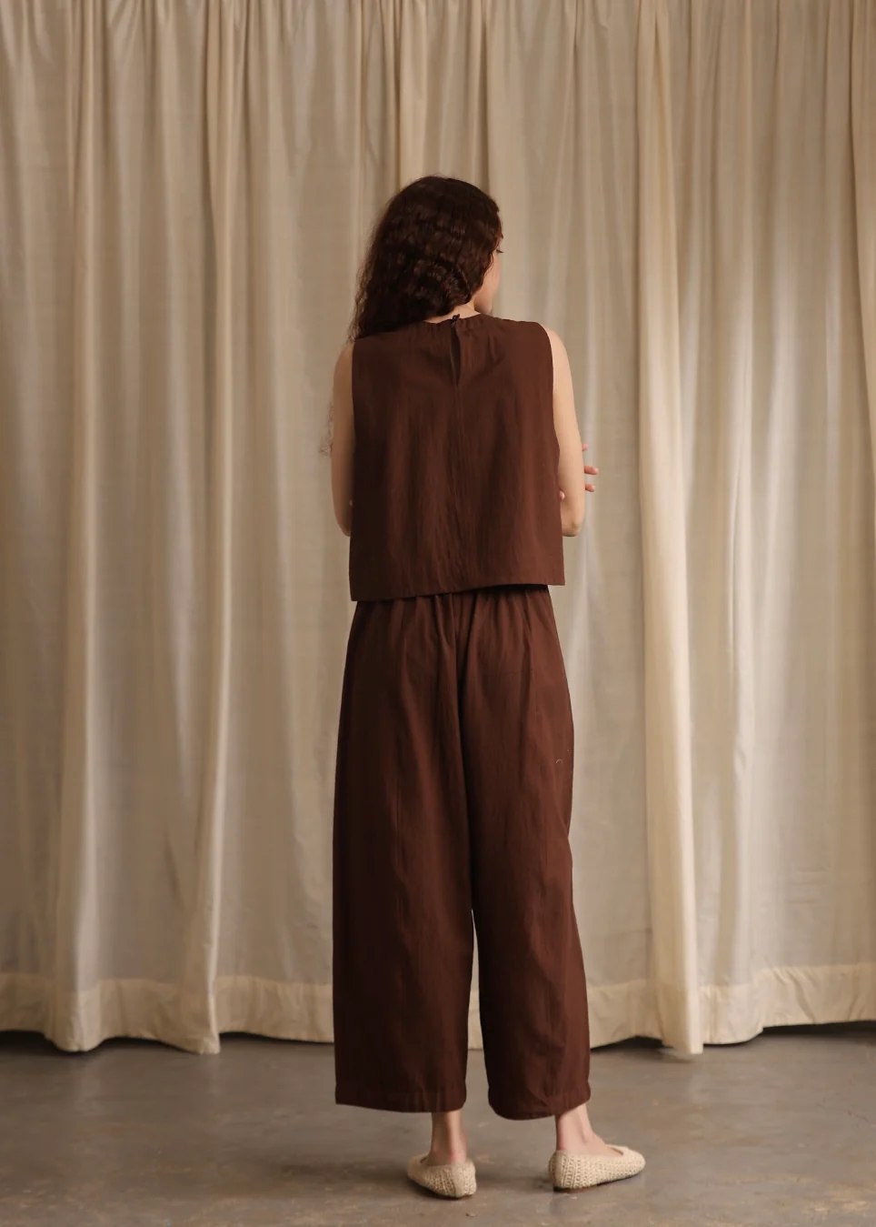 A no-fuss staple top, cut in a rich espresso brown handwoven cotton. Perfectly shaped armholes and a wide hem to define the cut. Easy to throw and absolutely chic.