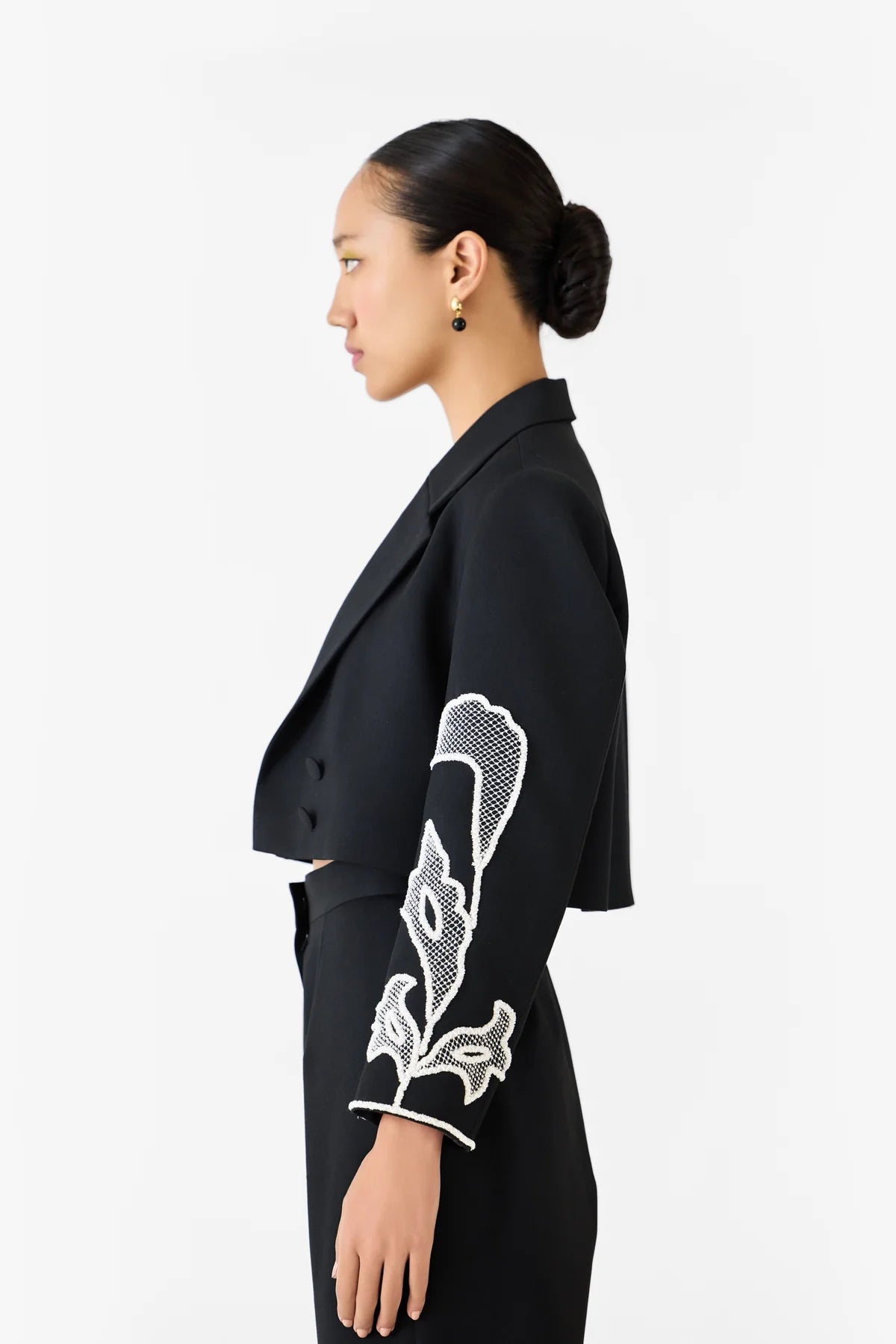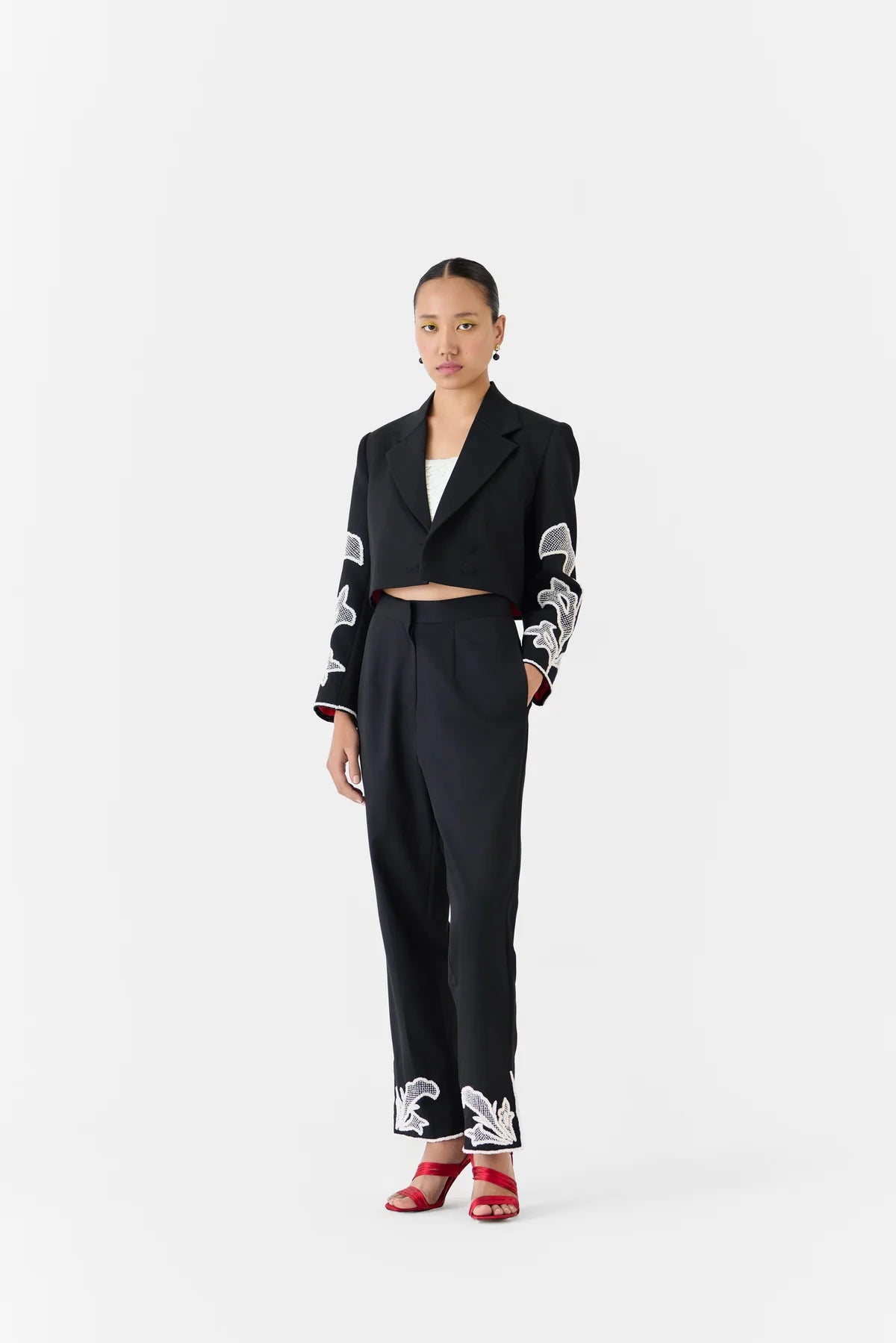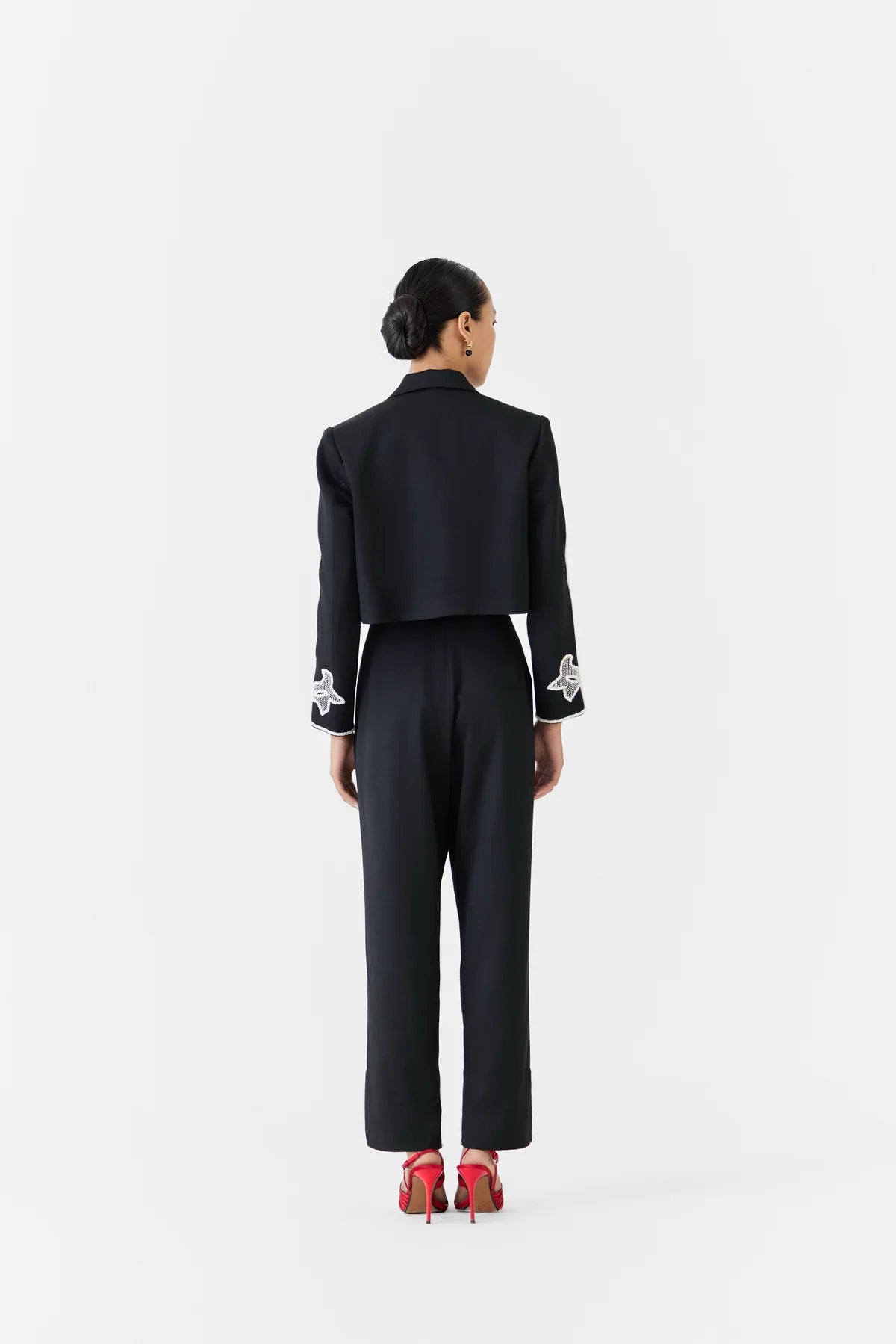 The Moonstone Crop Blazer & Trouser Co-ord crafted from our stunning cotton suiting fabrication, trans-seasonal, is a statement piece. The piece, lined suiting , has a cropped fit. The blazer has been embroidered with mesh moonstone embroidery on the sleeves and has a lapel and collar. It is paired with our matching Moonstone trousers with a side slit and hand embroidered hems. It can be worn with our diamond sequin bustier. Wear it with heels for an elegant look.