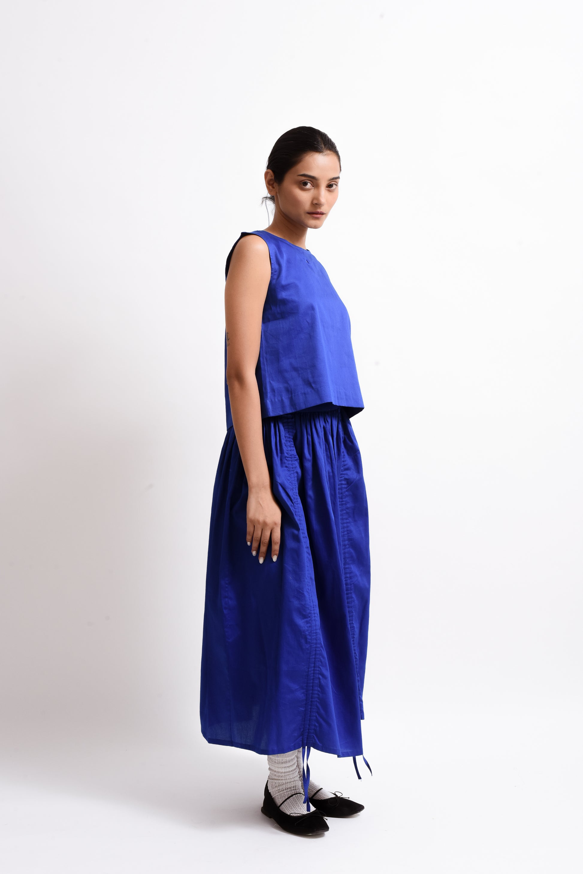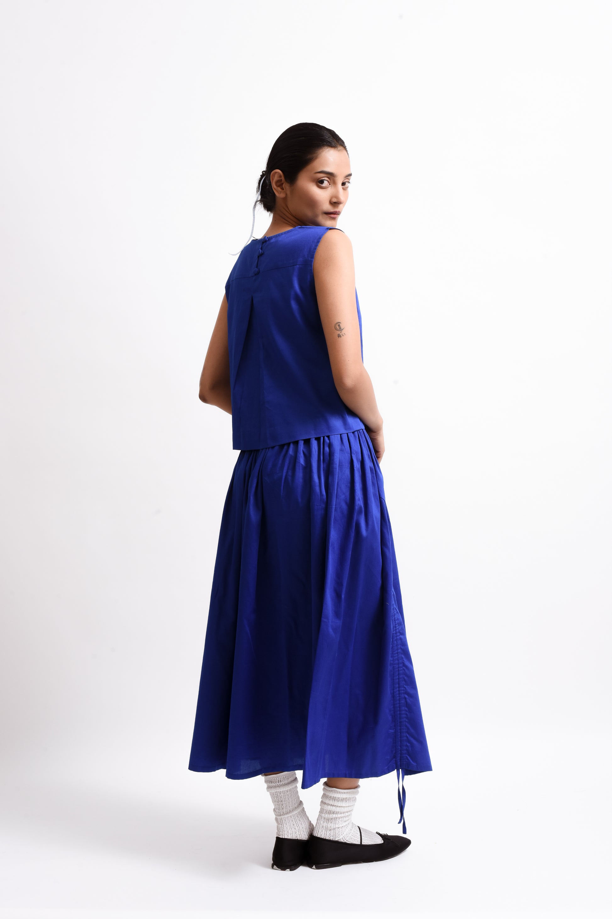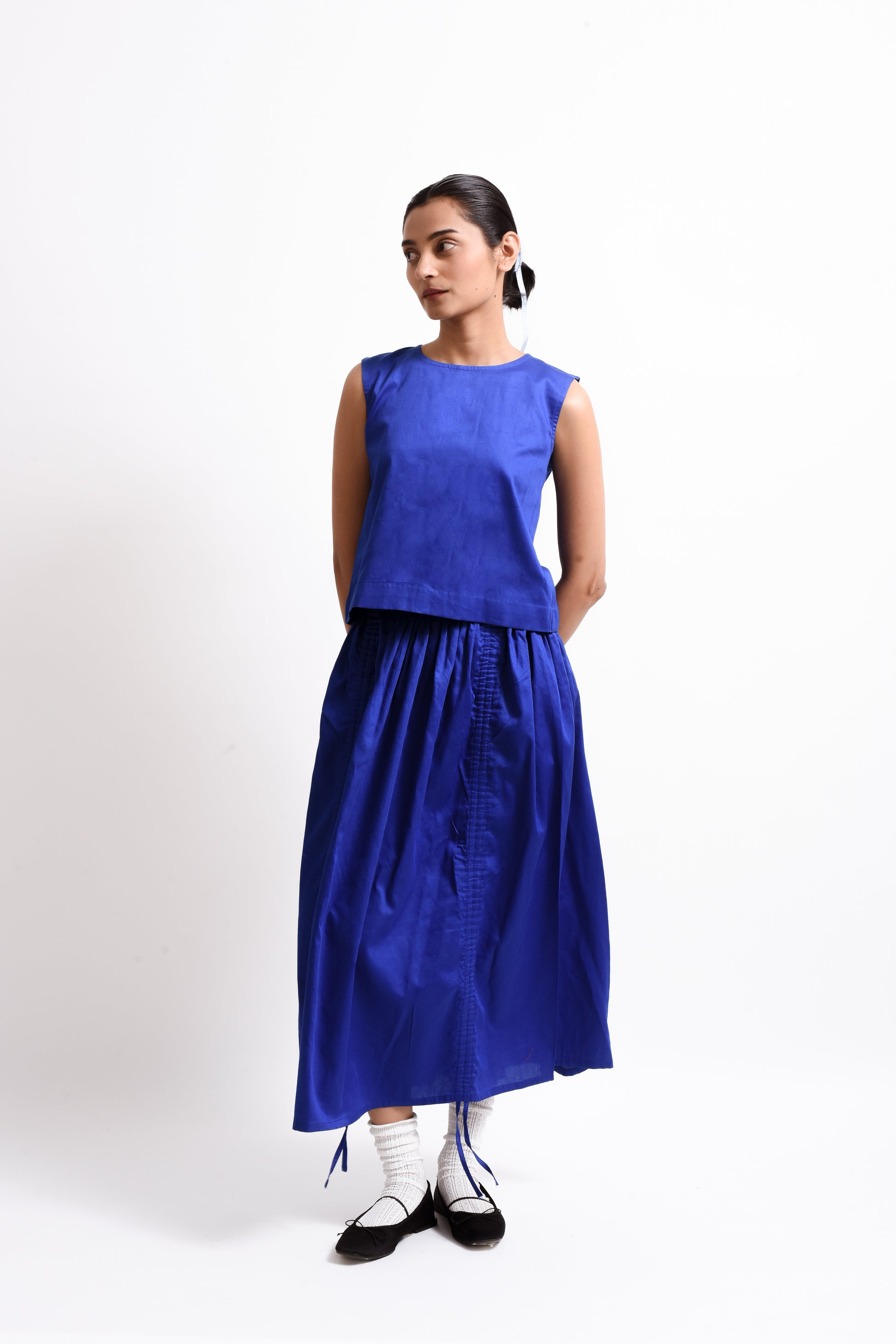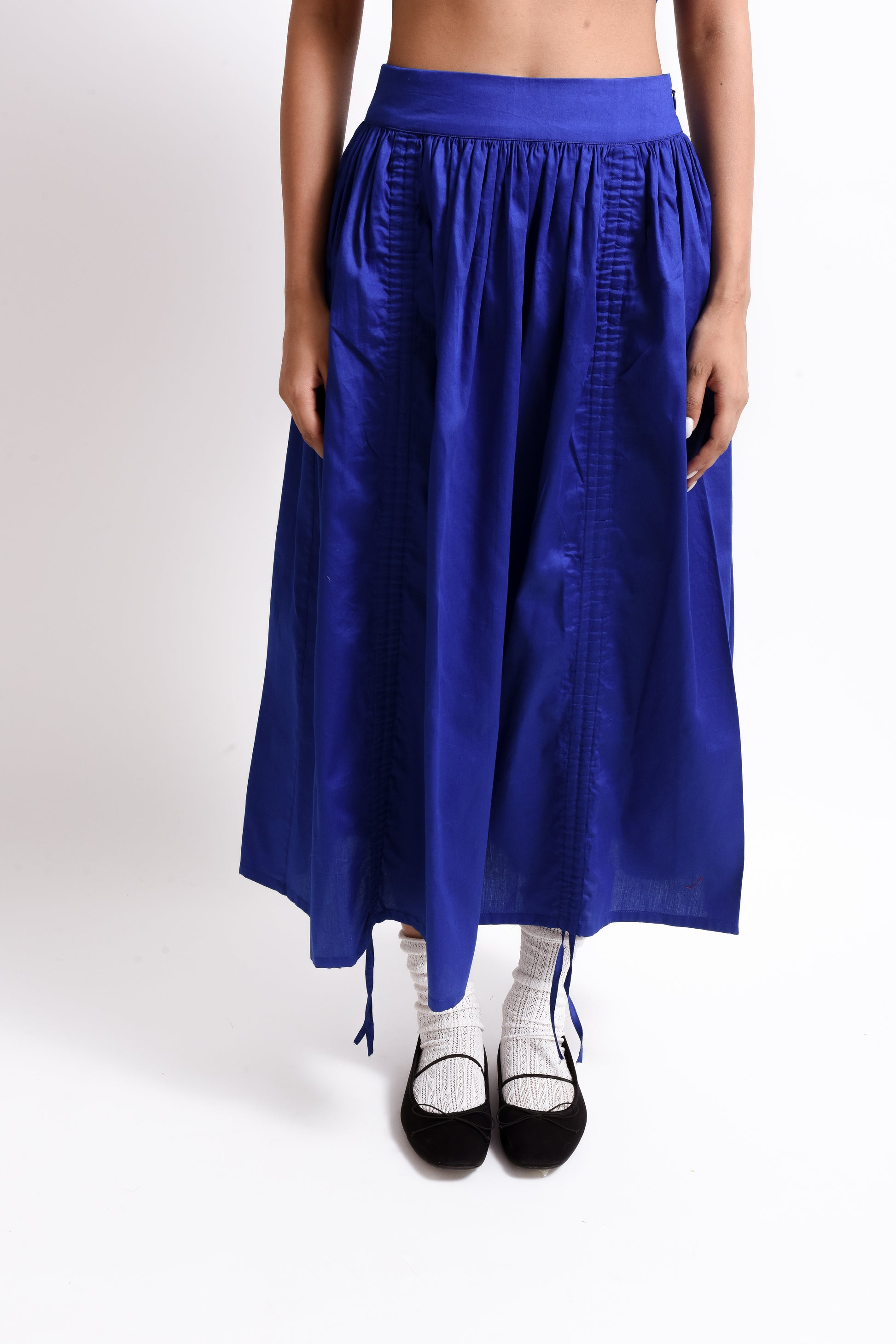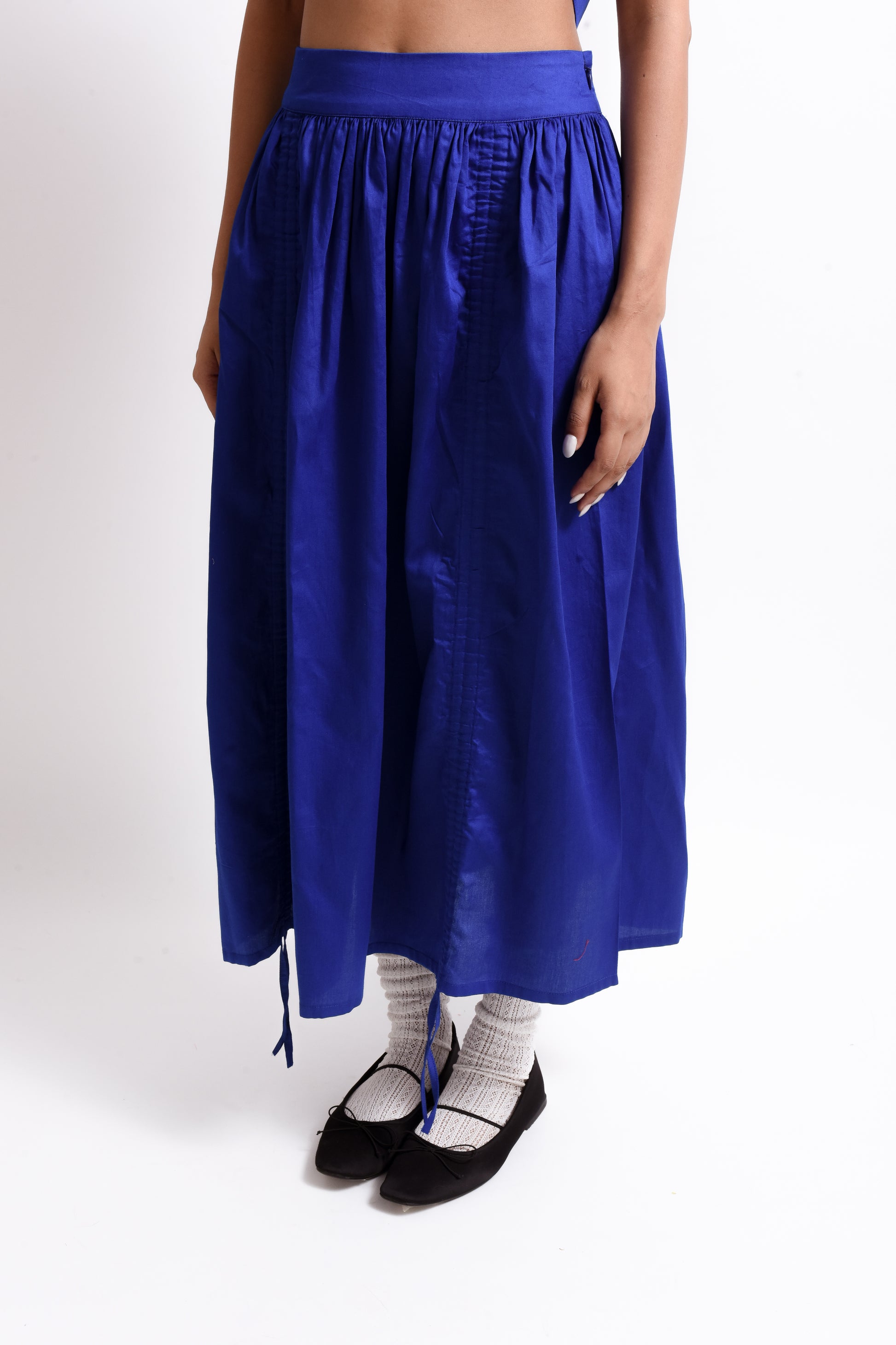 The Nancy Skirt is a chic midi skirt with a mid/low rise, featuring two drawstrings for adjustable ruching at the front upper thighs. Its wide, flattering waistband and invisible side zip ensure a sleek fit, perfect for versatile styling.