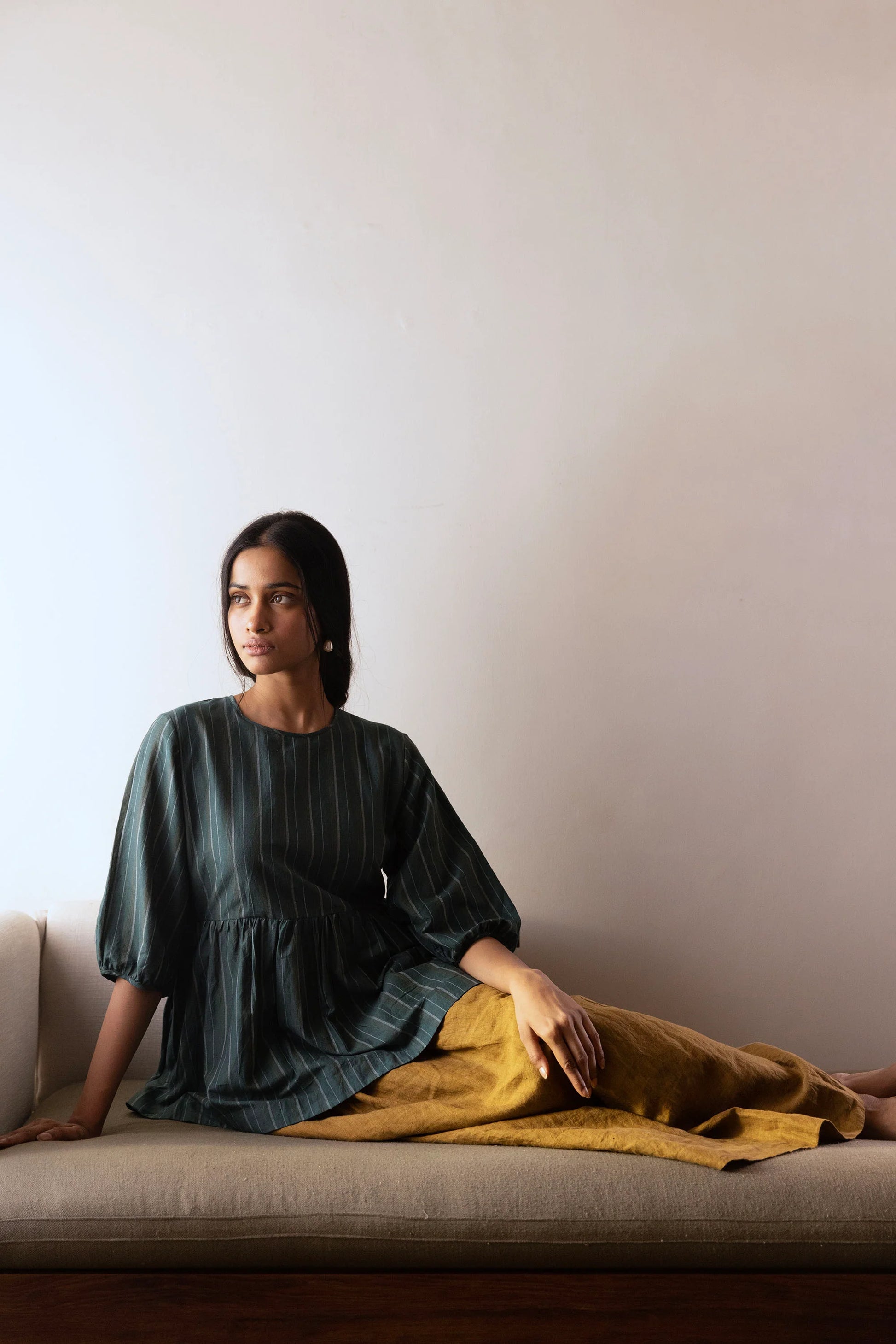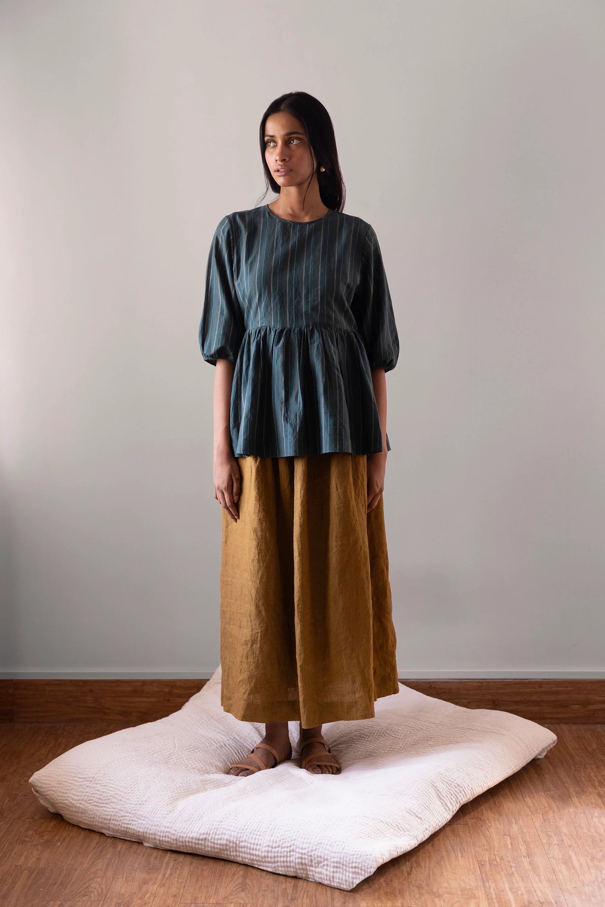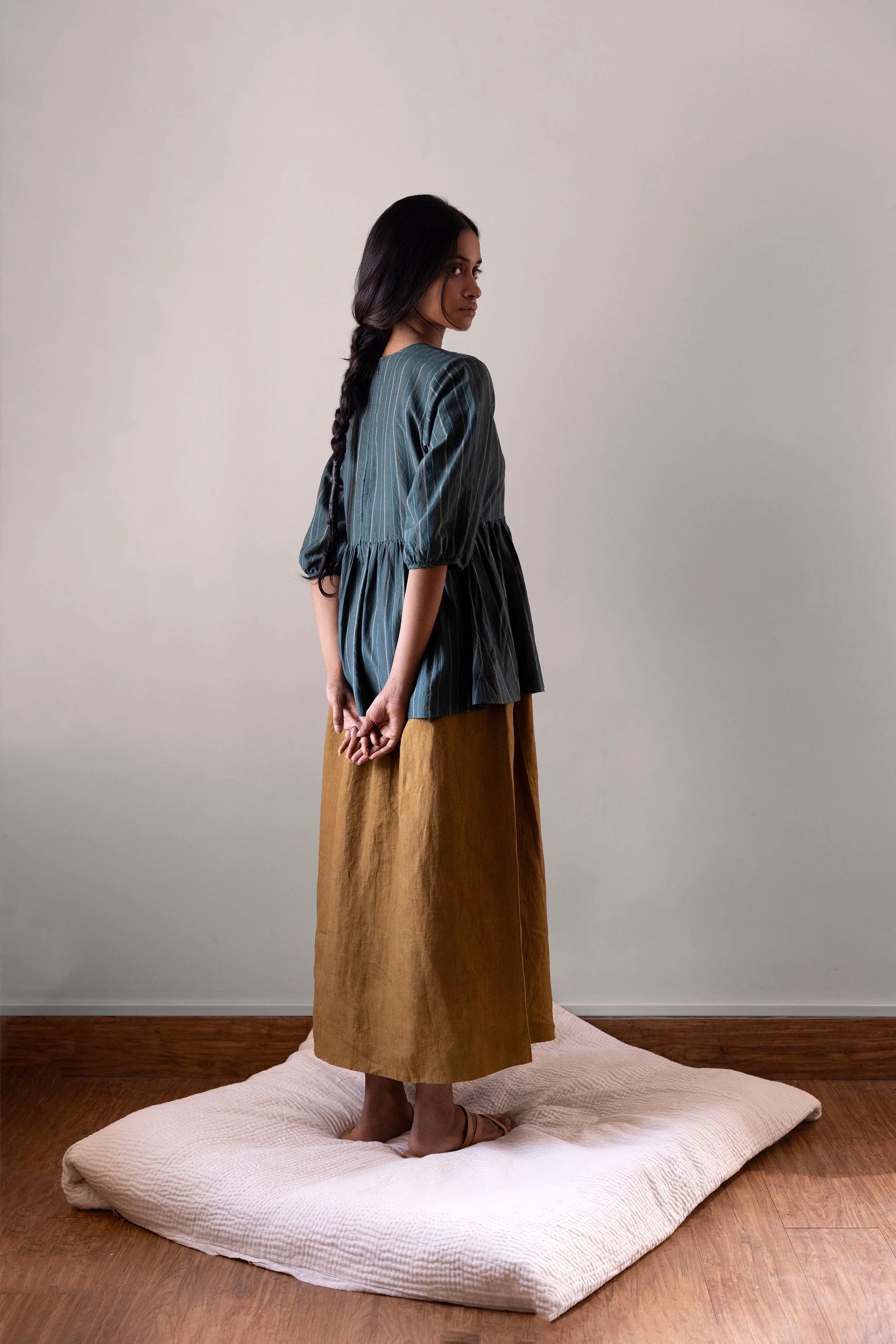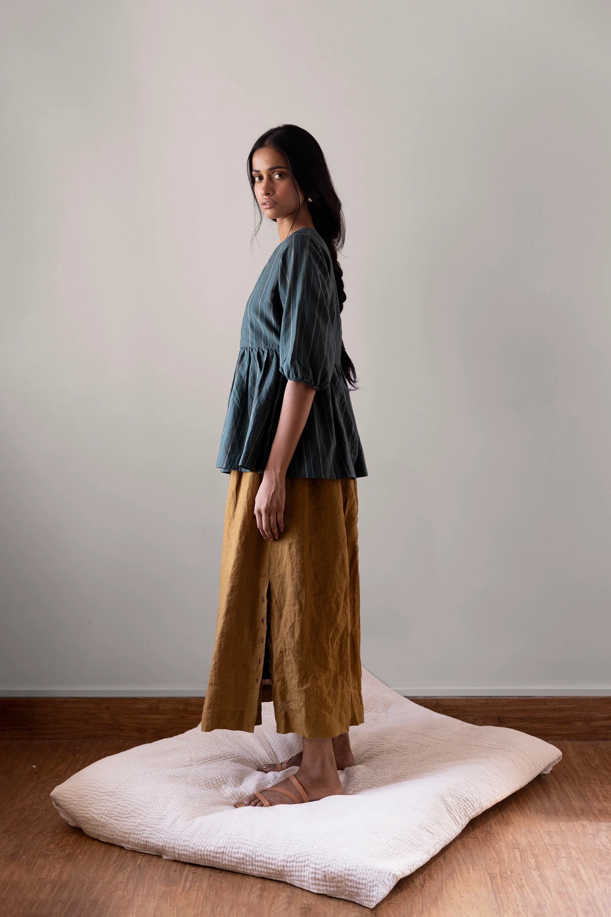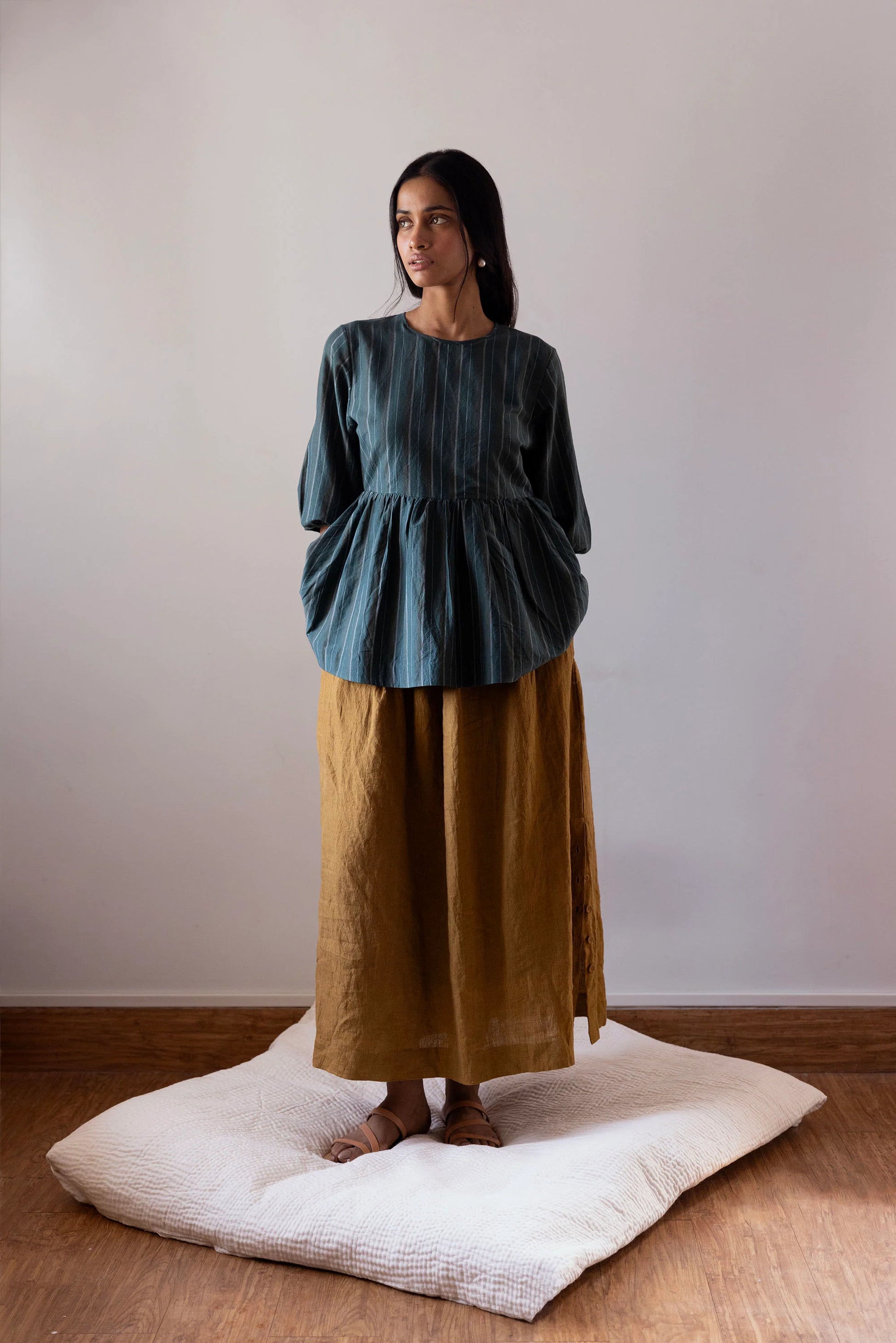 The Mahua skirt is made with handloom linen woven in West Bengal. It has an elasticated back and a drawstring front. The skirt has pockets and a slit on the left side with buttons provided for those who prefer to conceal the slit. Handcrafted with care and quality in mind, the Mahua skirt is made from handloom linen sourced from West Bengal. The elasticated back and drawstring front provide a comfortable and adjustable fit, while the pockets and concealed slit offer both style and practicality.