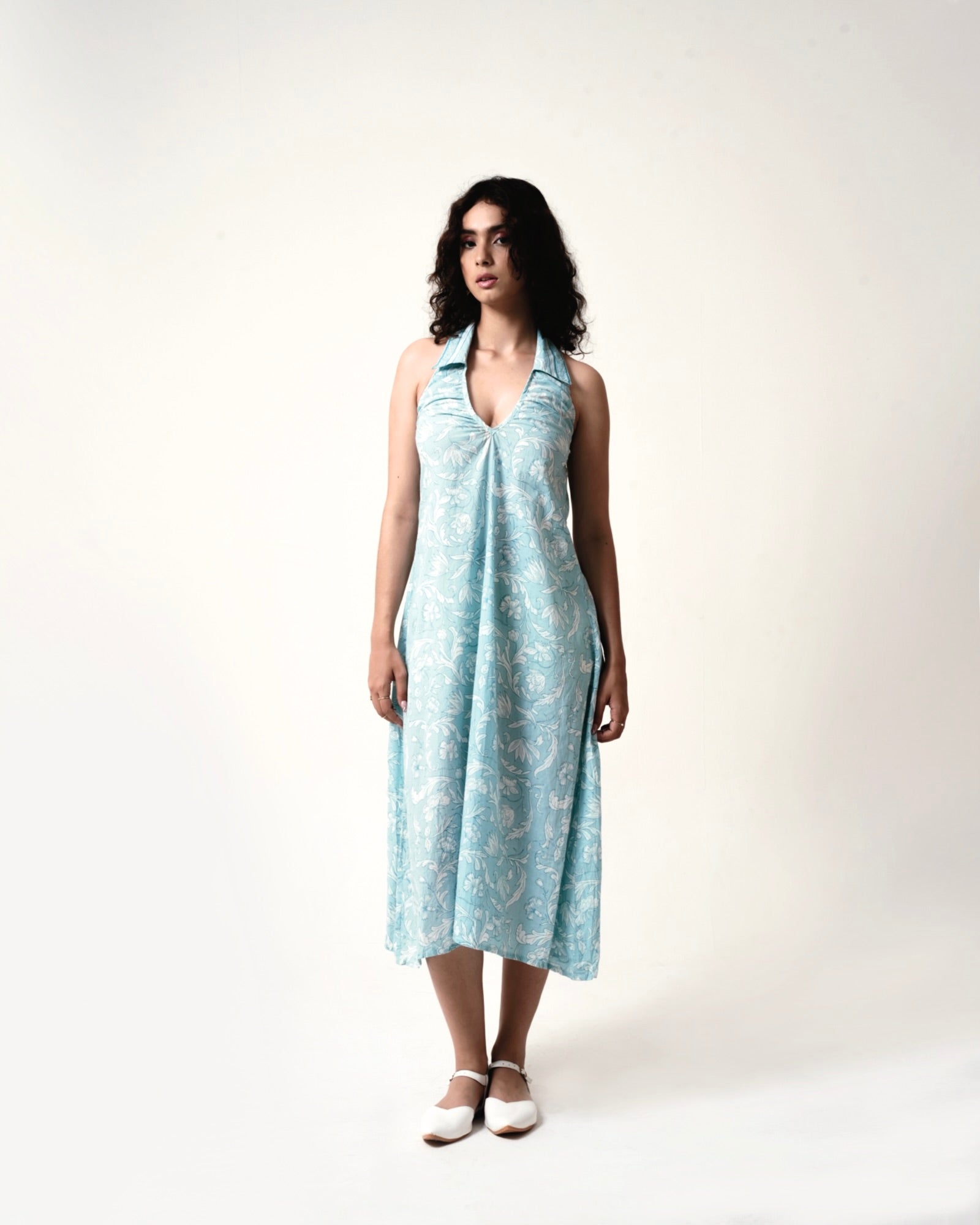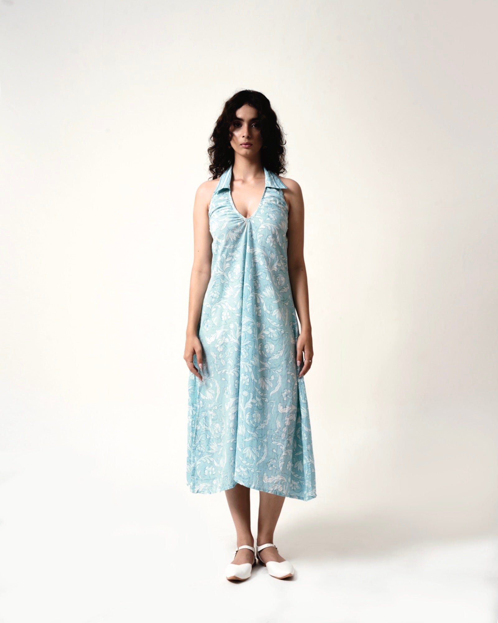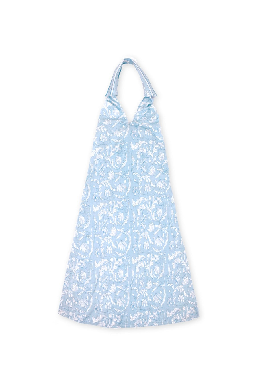 This Halter-Neck Maxi Dress in a serene blue hue embodies understated elegance with its flowing silhouette and delicate hand-screen print. The two-piece collar adds a structured touch to the neckline, while the backless design enhances its modern allure. The flattering A-line silhouette enhances the figure, while the soft, breathable fabric provides all-day comfort.