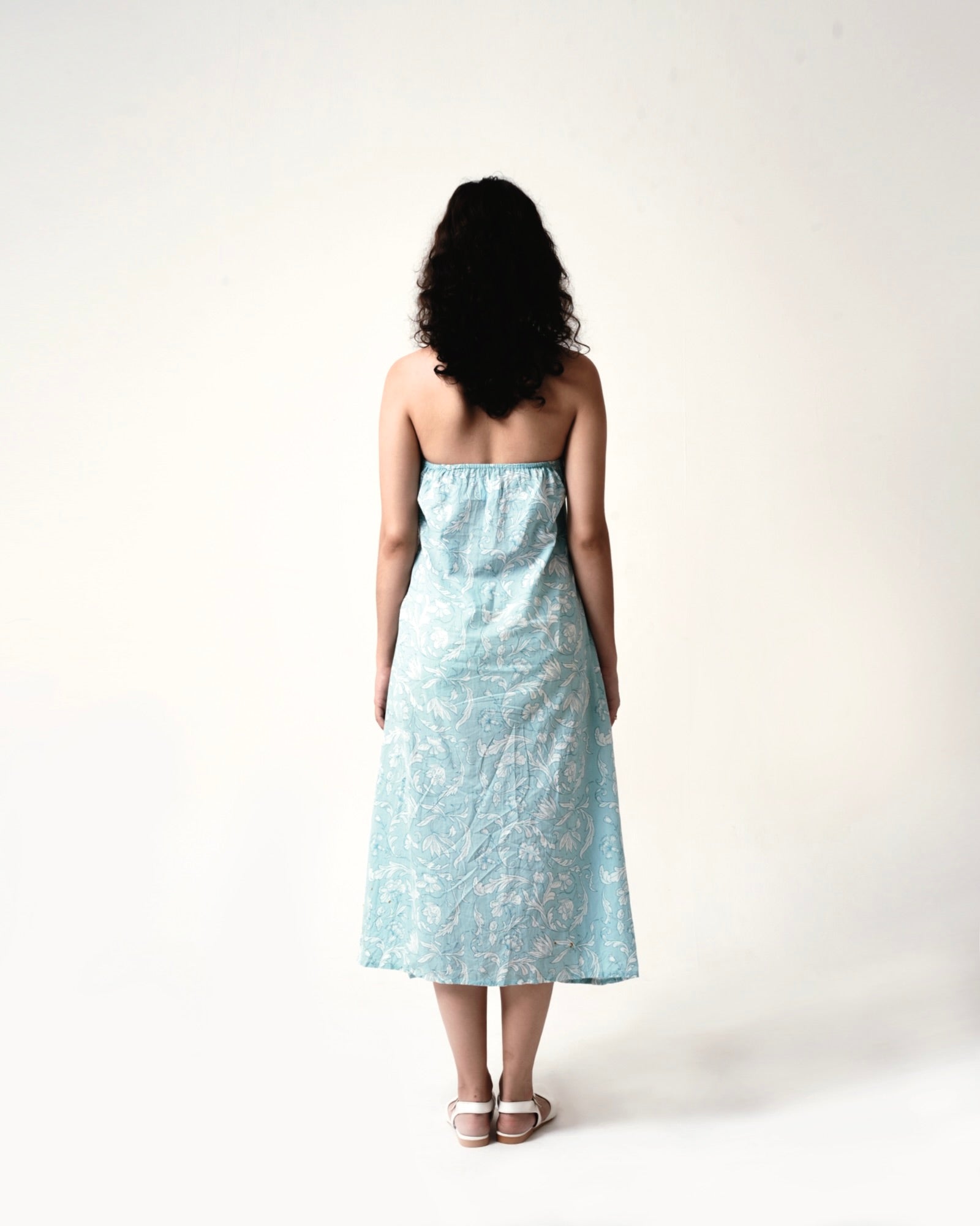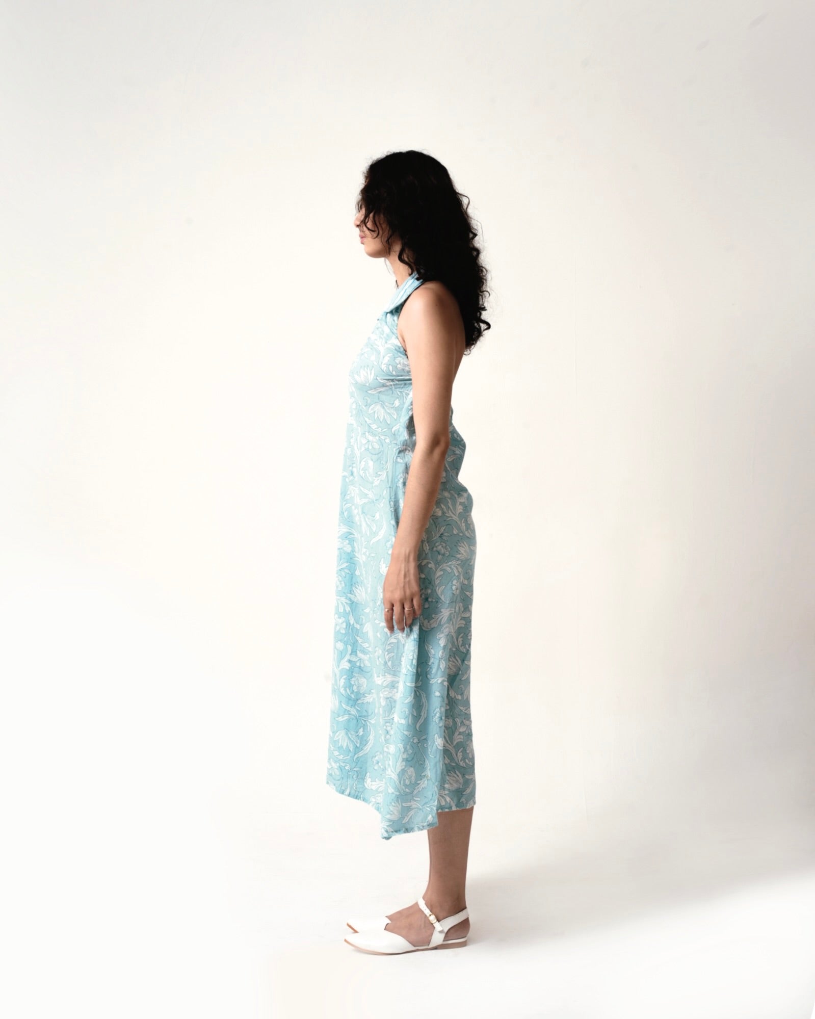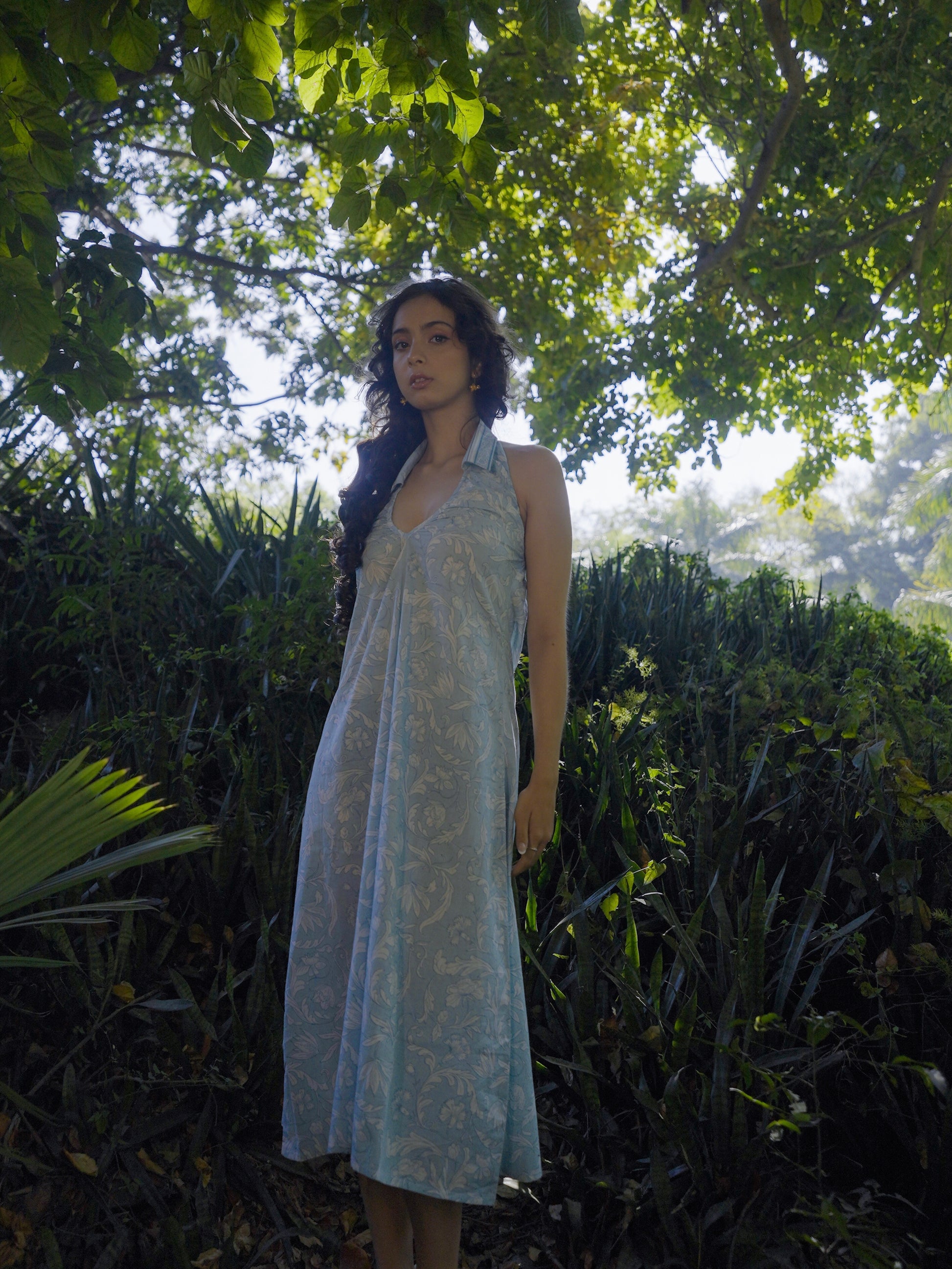 This Halter-Neck Maxi Dress in a serene blue hue embodies understated elegance with its flowing silhouette and delicate hand-screen print. The two-piece collar adds a structured touch to the neckline, while the backless design enhances its modern allure. The flattering A-line silhouette enhances the figure, while the soft, breathable fabric provides all-day comfort.