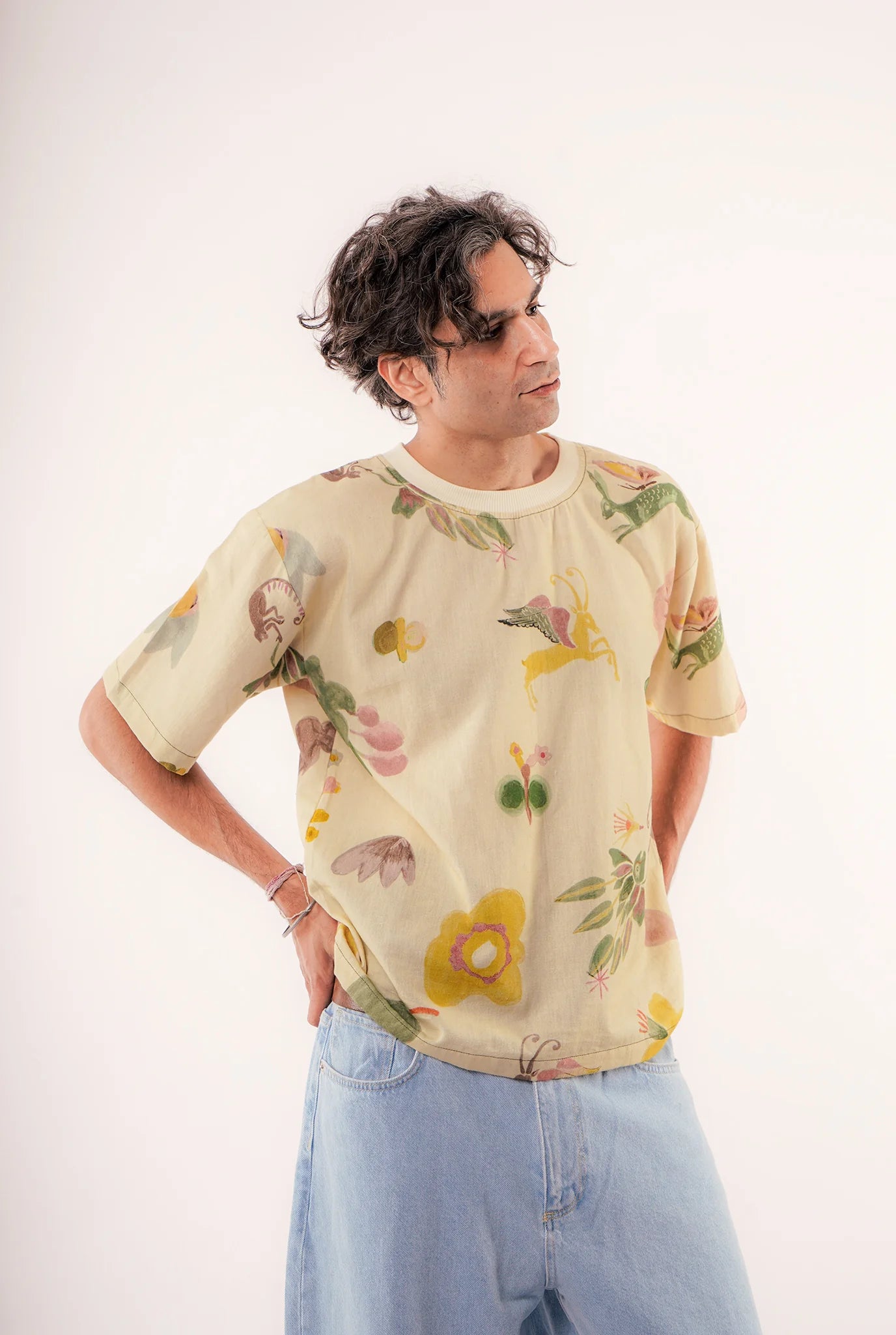 A t-shirt so nice, you’ll want to wear it twice. Signature JODI printed woven t-shirt with a ribbed neck and hand embroidery.