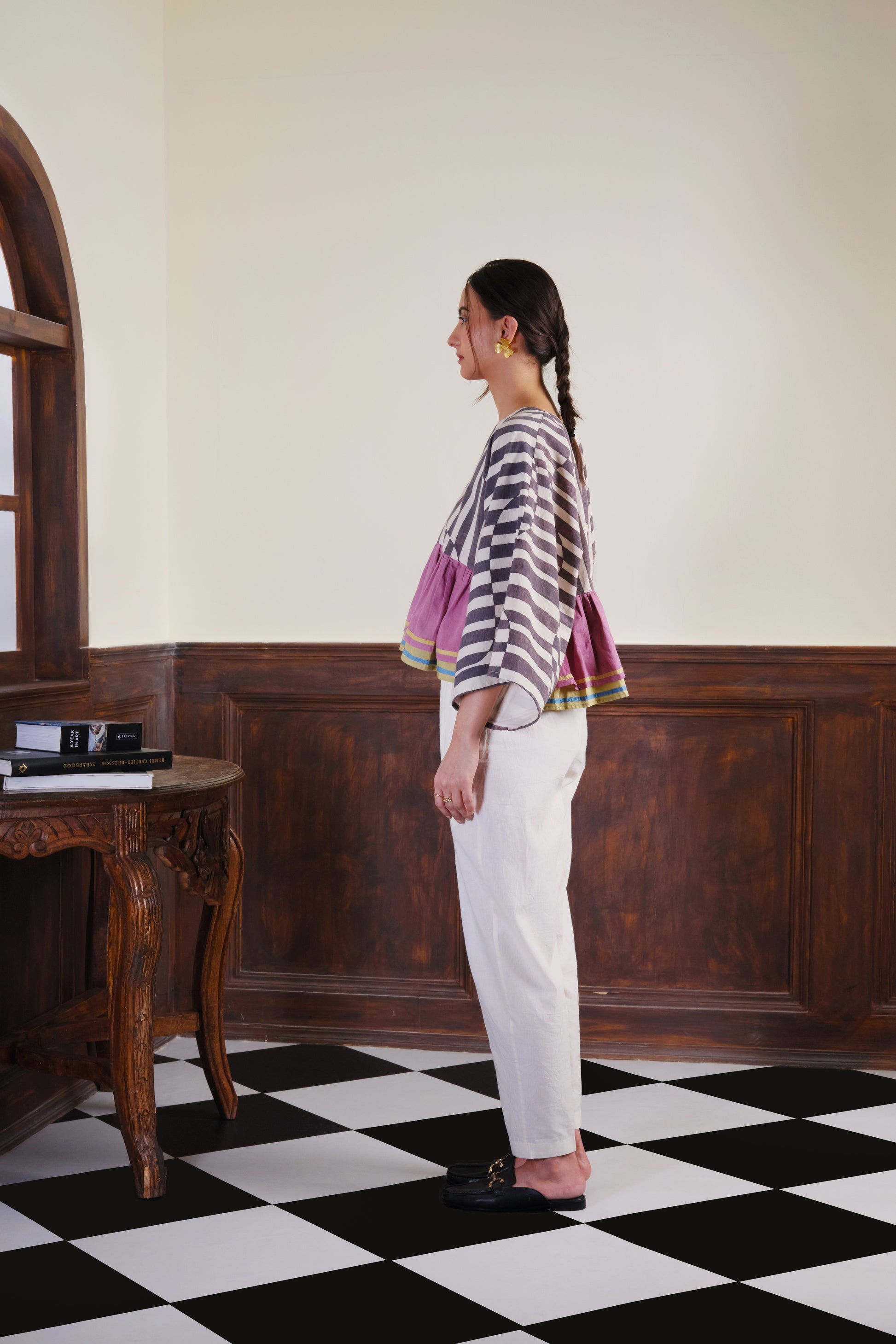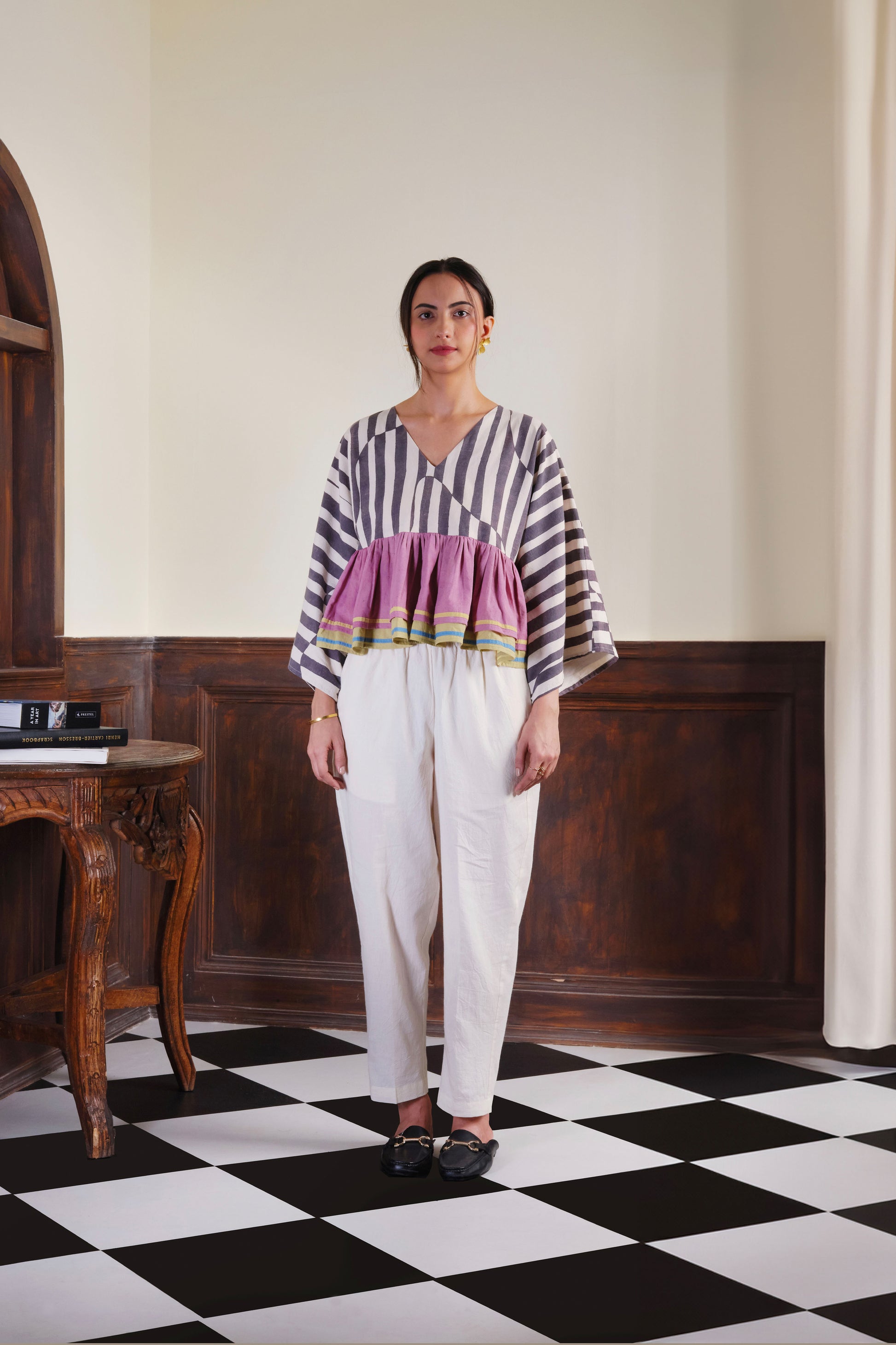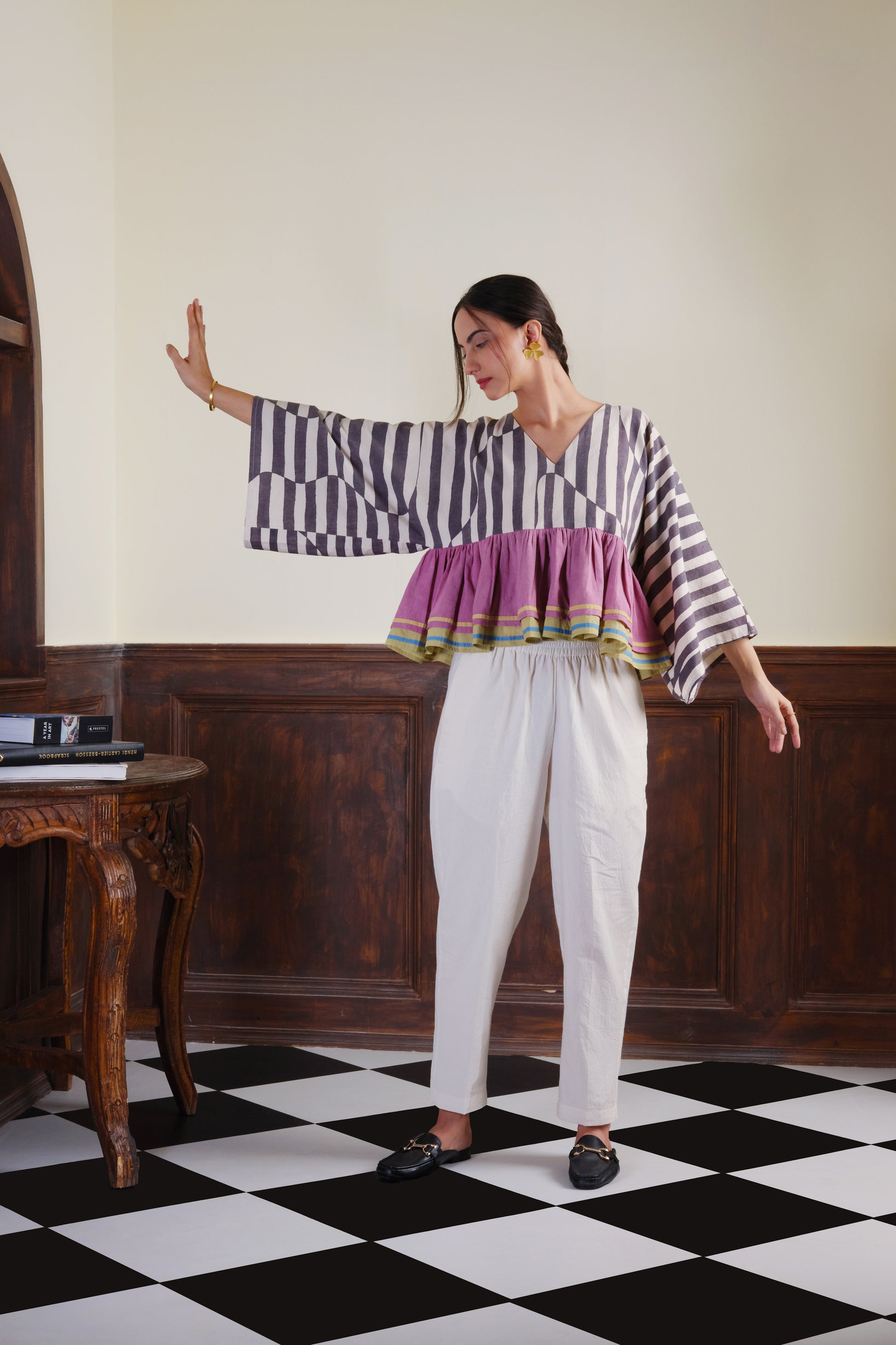 A straight top with a V neck and soft gathers at the waist. The top panel is hand‑painted with kassim, and the two gathered tiers are dyed pomegranate green and lac magenta, with small indigo and madder patches running near the hem of the gathers.