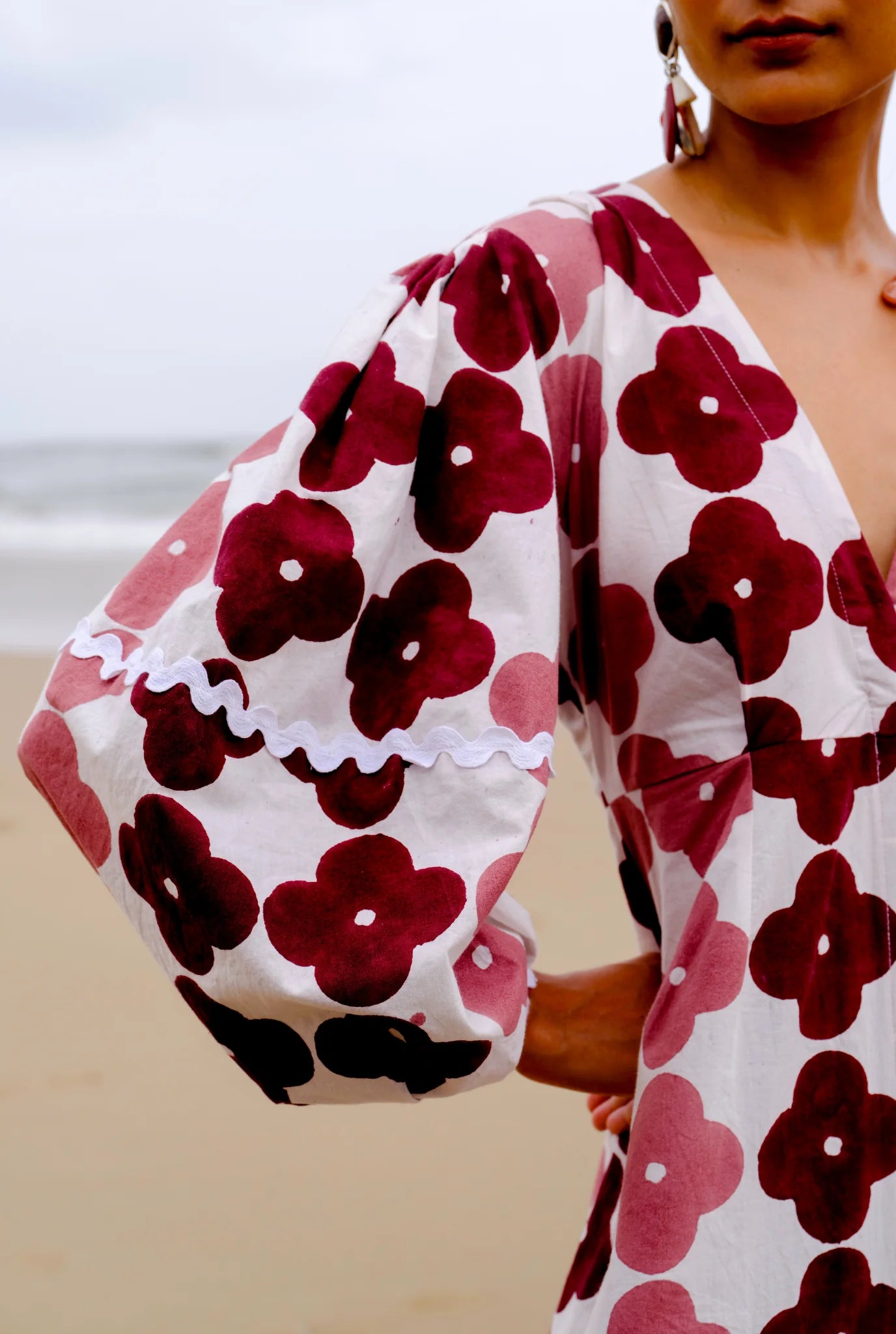 RSVP yes, thanks to this fabulous dress. Hand-block printed in cotton in a beloved JODI print, it features a flattering neckline with statement blouson sleeves and rick-rack lace detailing.