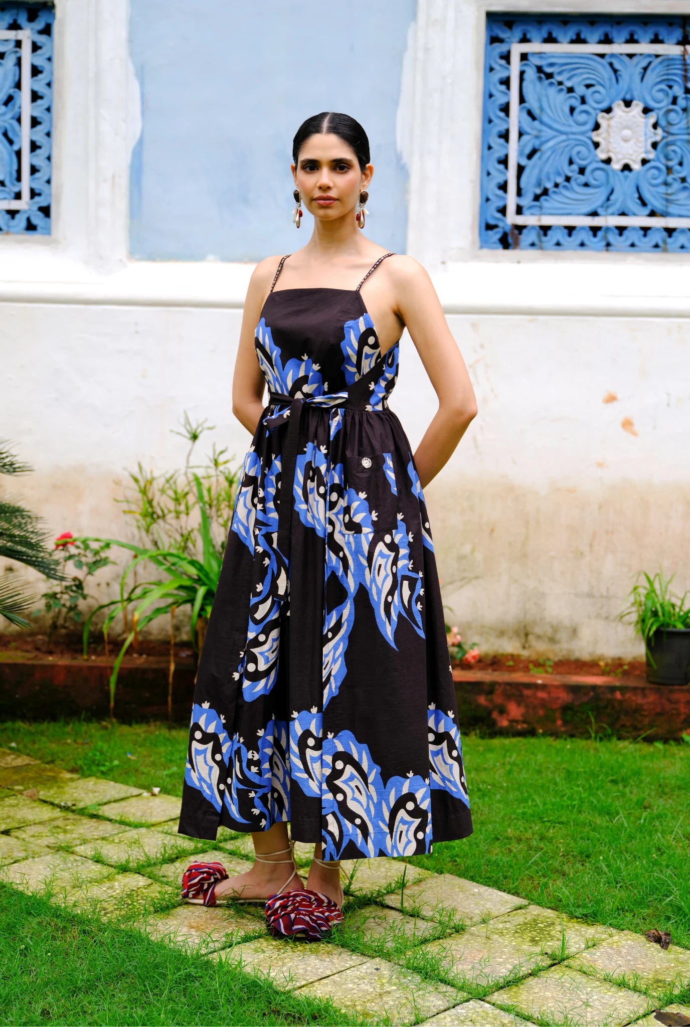 Picture yourself with a drink in your hand wearing the most flattering dress. This dress captures the carefree vibe, making every outing feel like a mini-vacation! Made from soft cotton and screen-printed, it features hand embroidery at the straps and pocket. First, tie the front panel strings at the back, then bring the back panel strings to the front for a flattering fit. The patch pocket sits neatly in front, also adorned with hand embroidery.