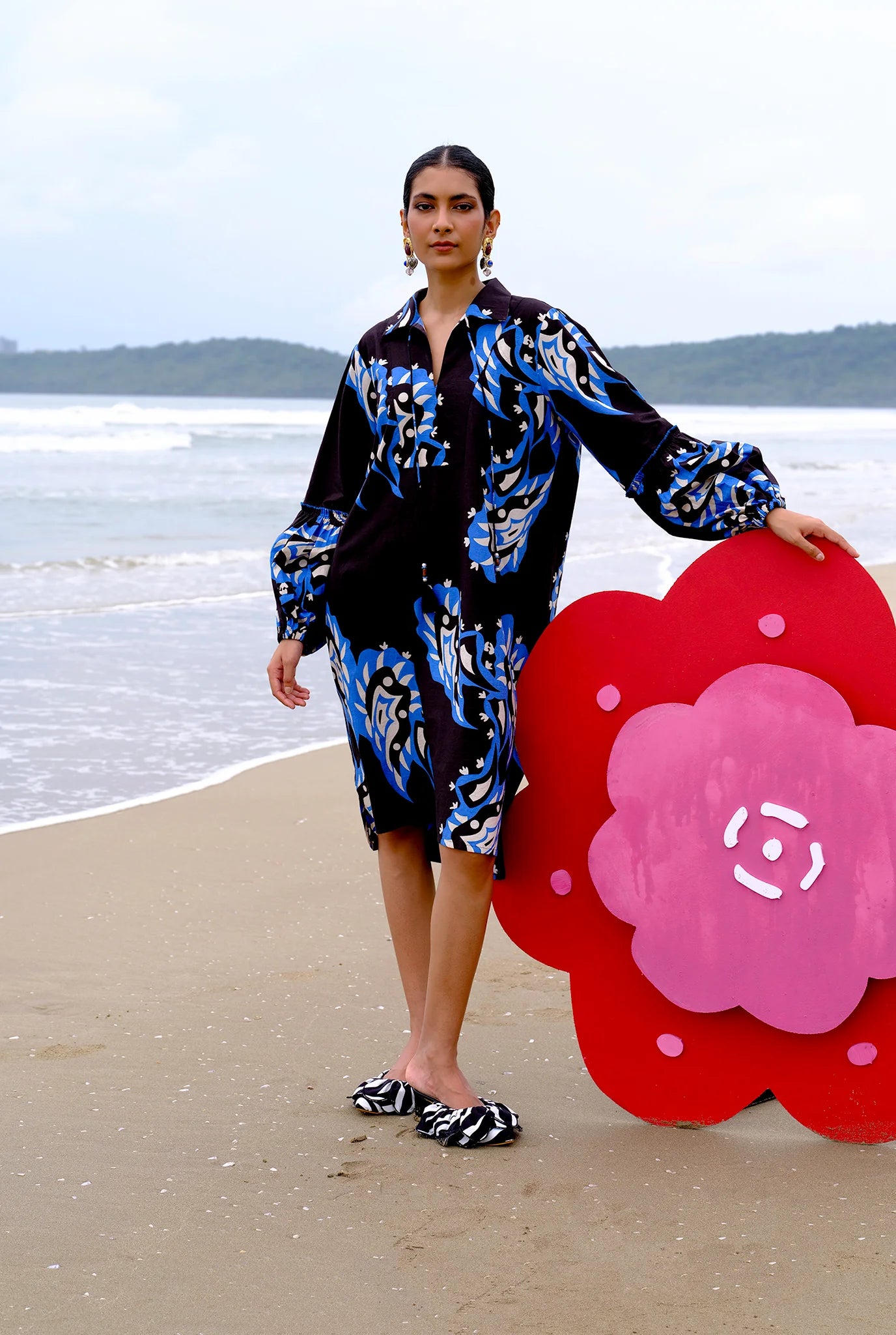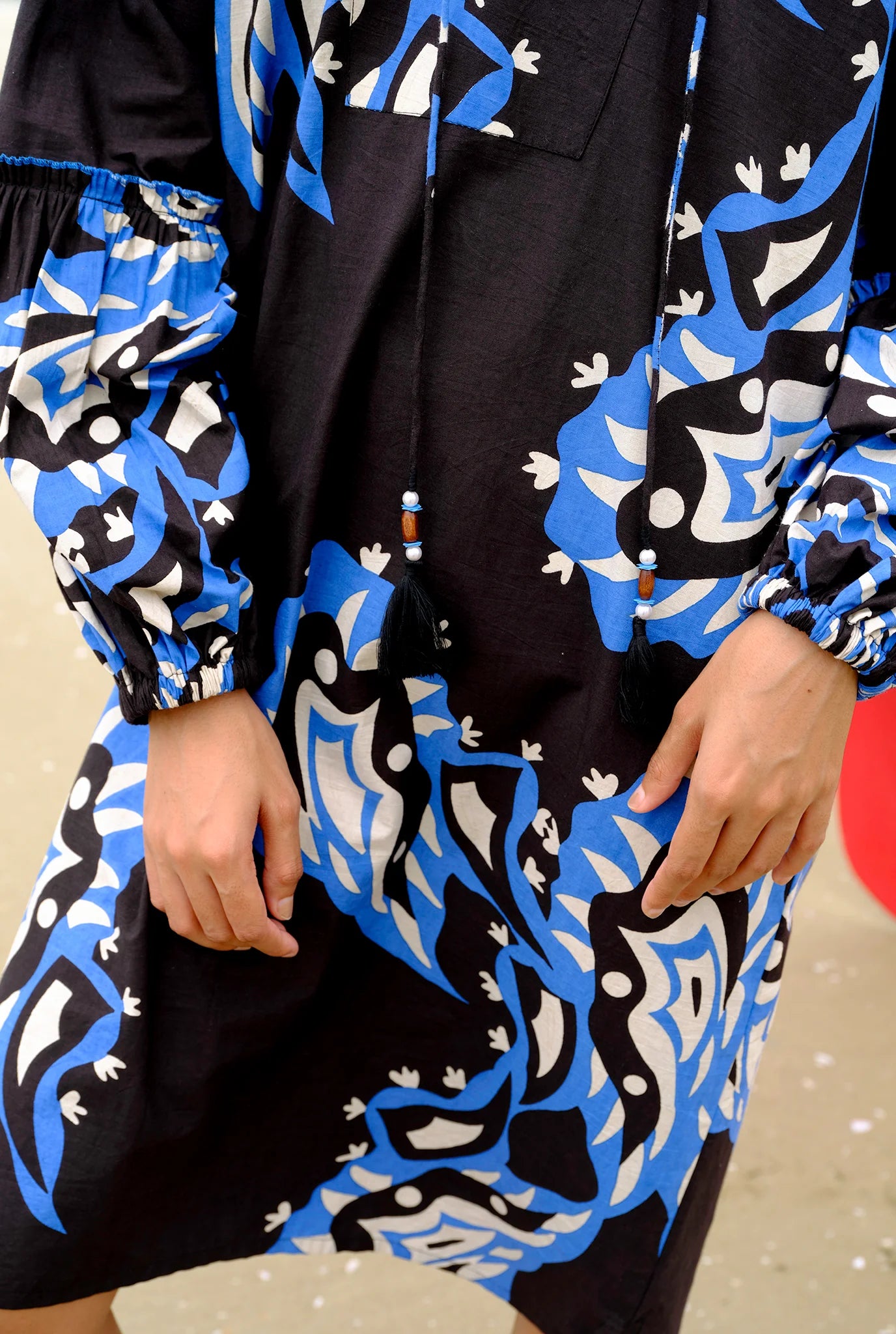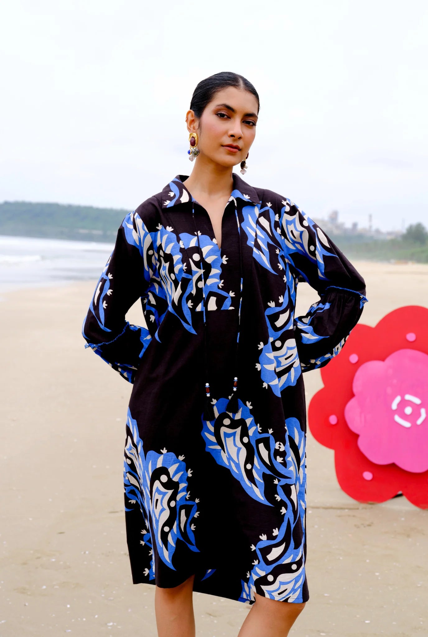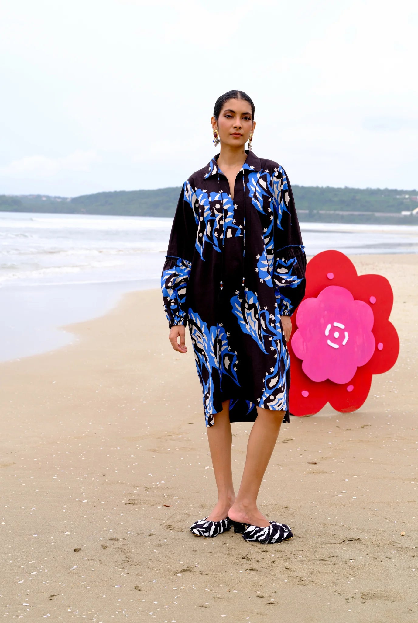 This shift dress features a high-low hem and a classic collar. It’s made from soft cotton with a screen-printed design, with neck strings and a bead detail at the tie-up. Ideal for casual outings, this roomy dress is full of playfulness!