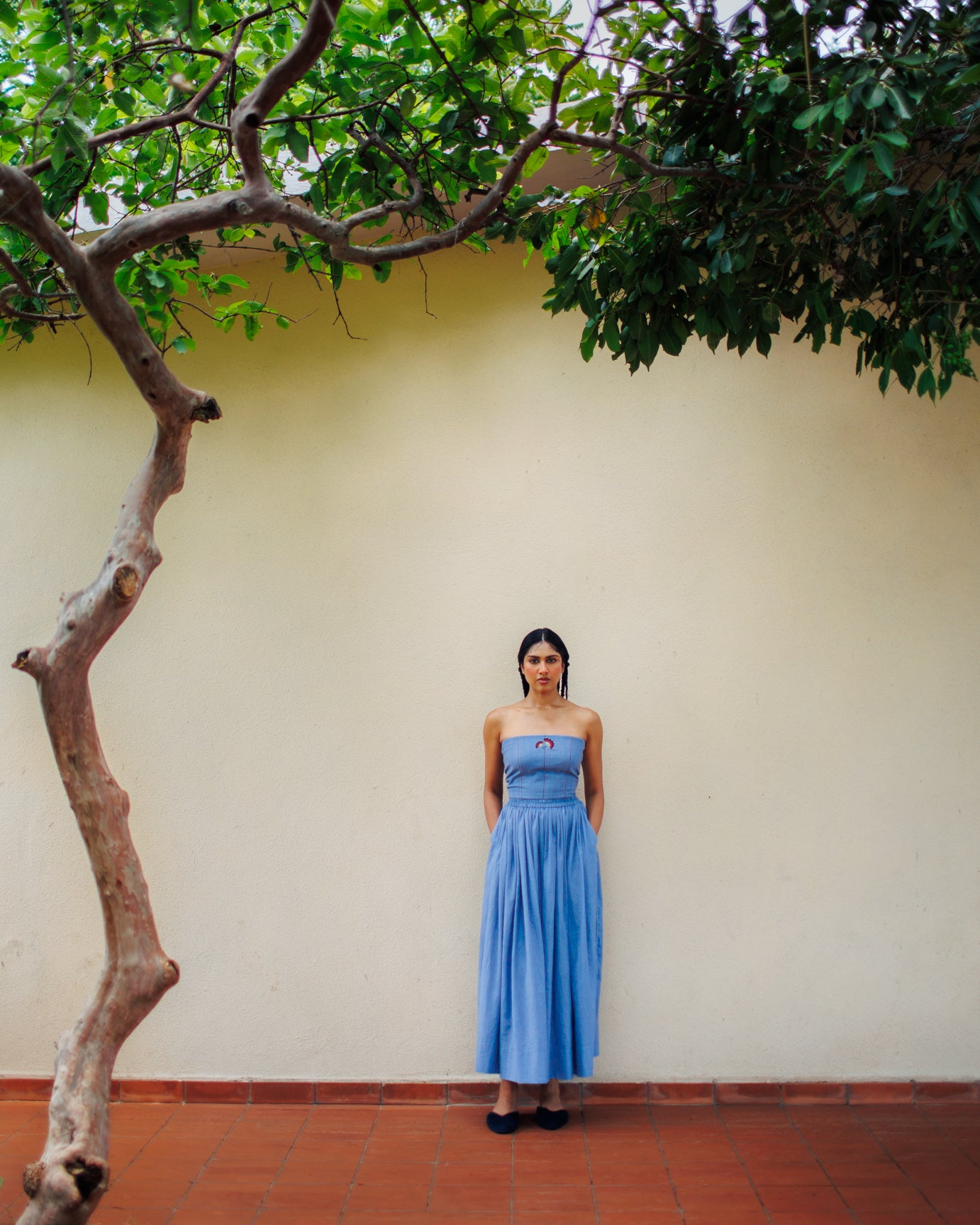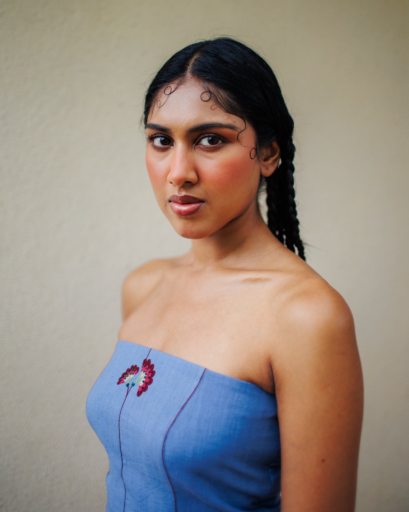 Page is an easy-to-wear corset top made from handspun and handwoven Khadi. It features a back tie-up and a side zipper for a secure and comfortable fit. The piece is detailed with our signature Aari embroidery motifs.