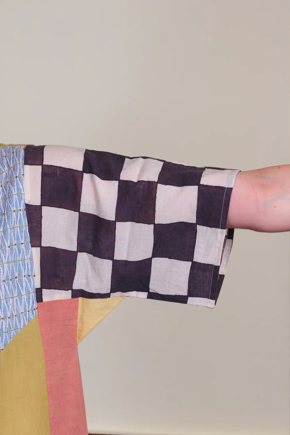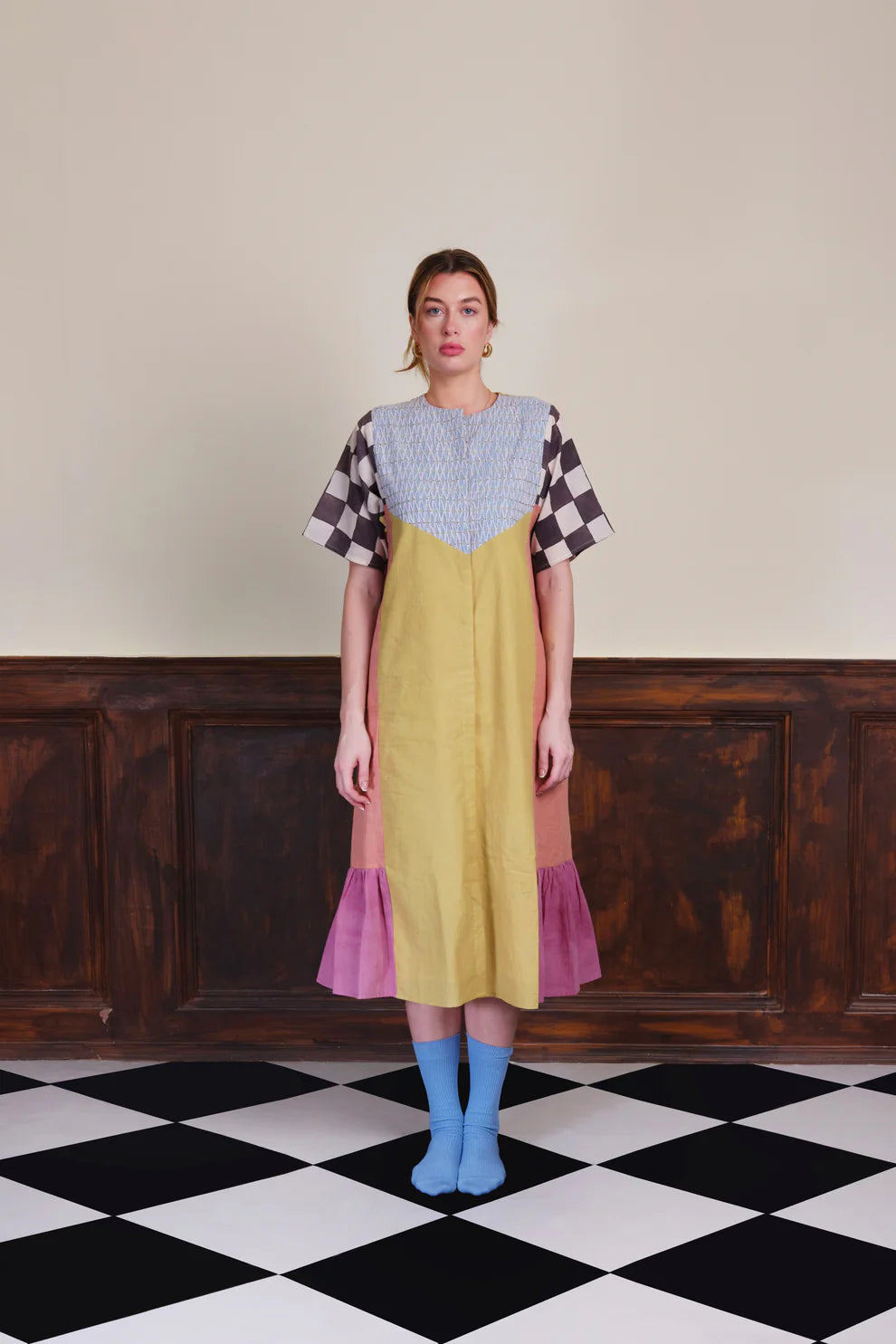 A high‑neck shirt dress with concealed placket, pintucks, gusset and short sleeves. It features panels dyed with indigo, pomegranate, madder, lac and hand-painted sections in kassim. The pintuck panel is made with indigo and kota doria fabric and hand-embellished with brass sequence.