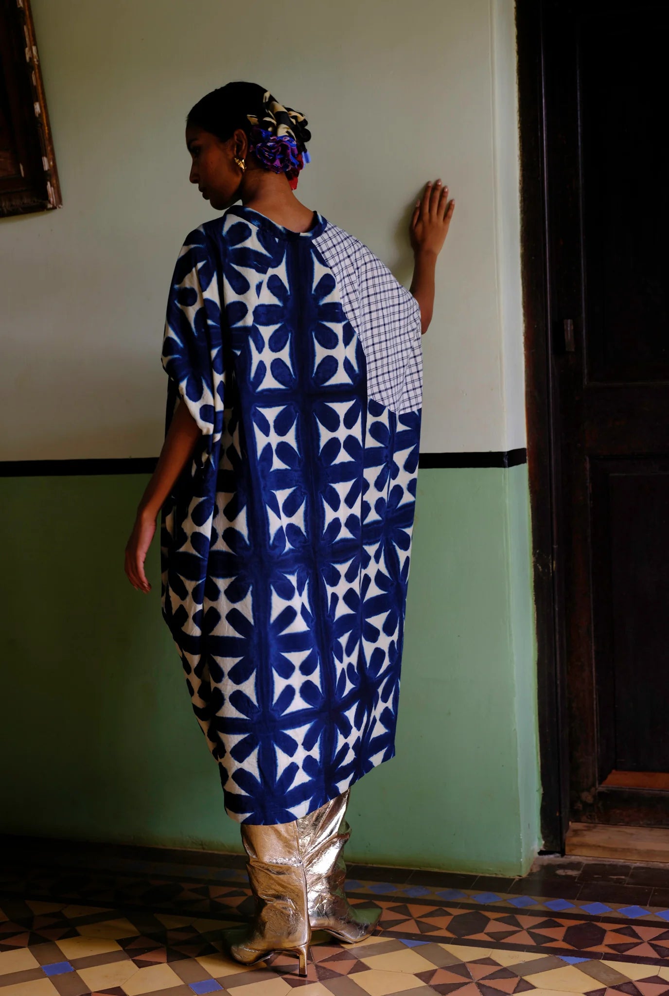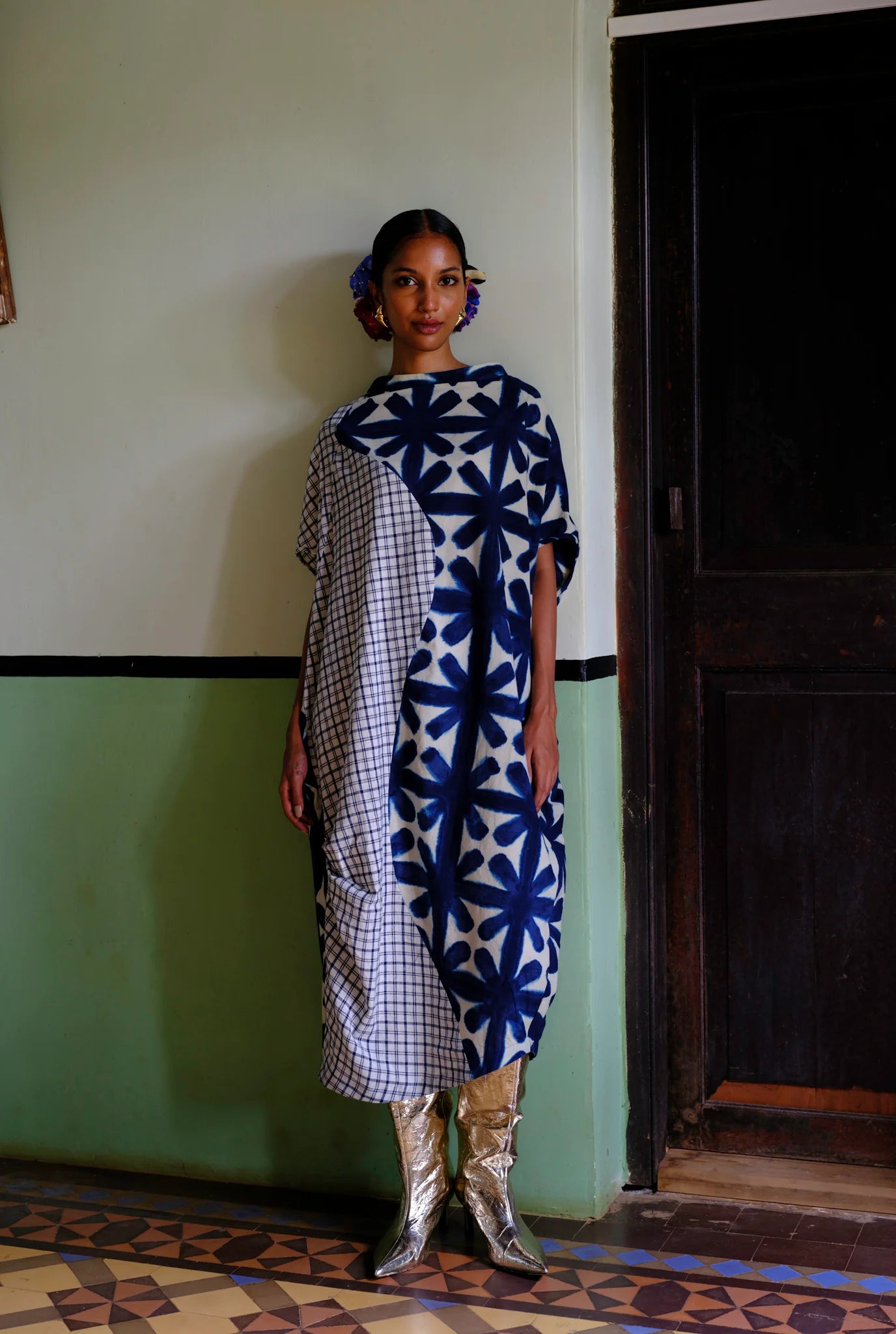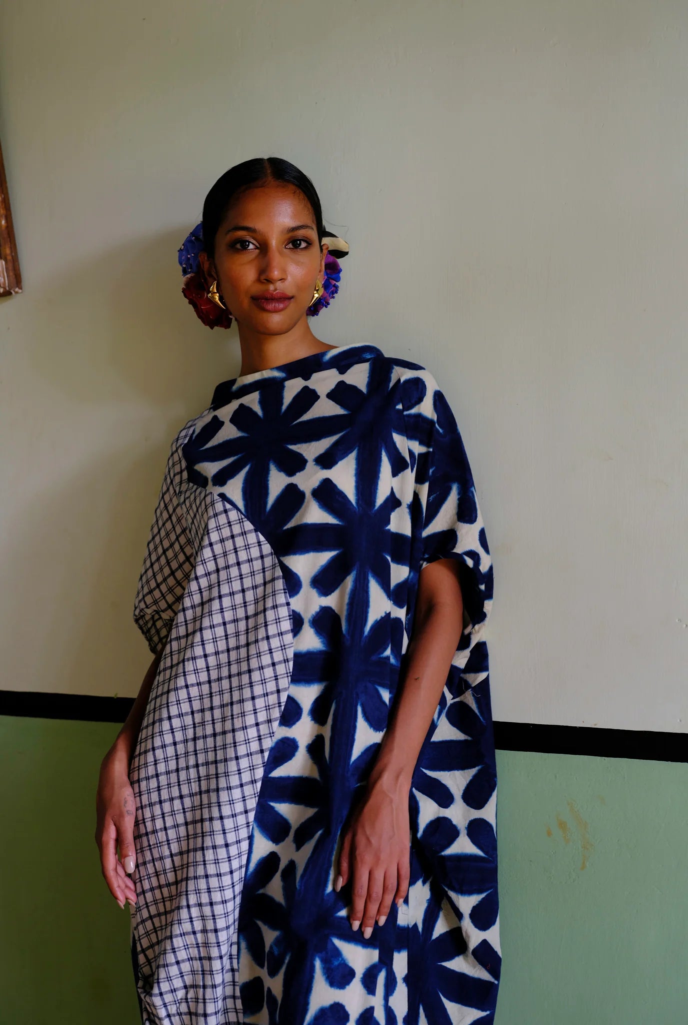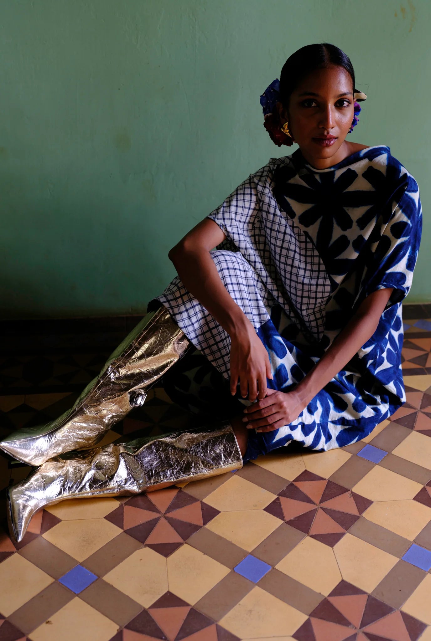 This simple, yet excitable silhouette is so effortless to slip on. Crafted in a mix of hand dyed indigo and handloom checks, this roomy piece features pleat details and a neckline that runs horizontally across the collarbone.