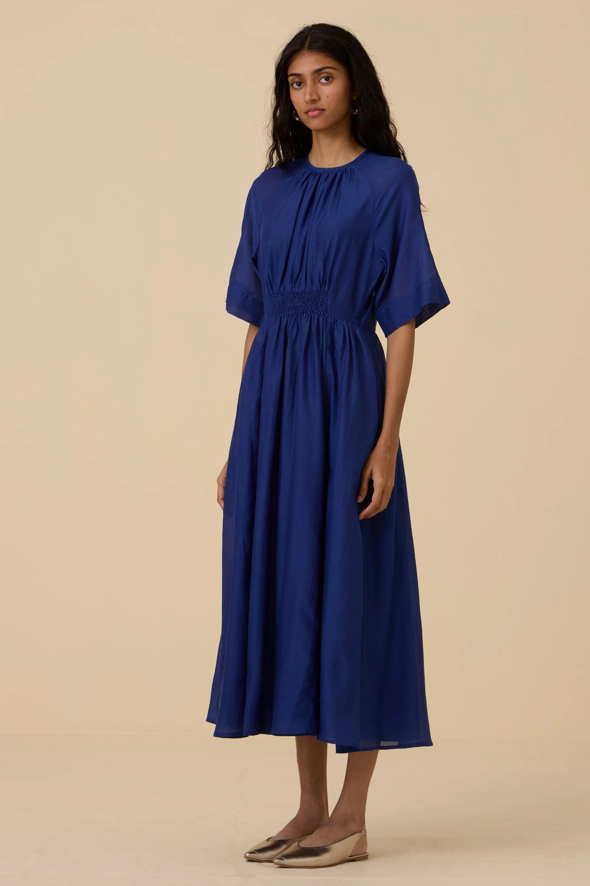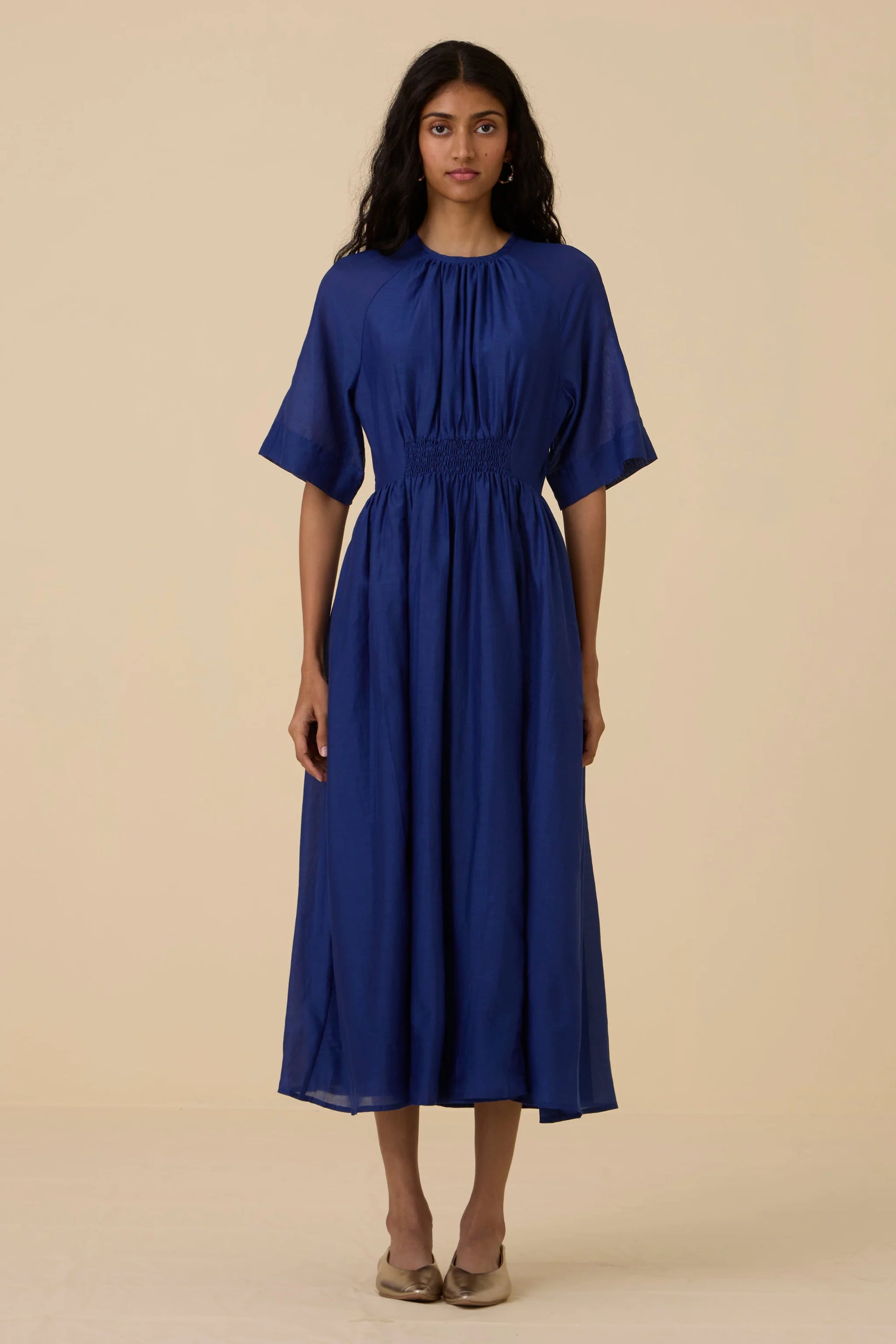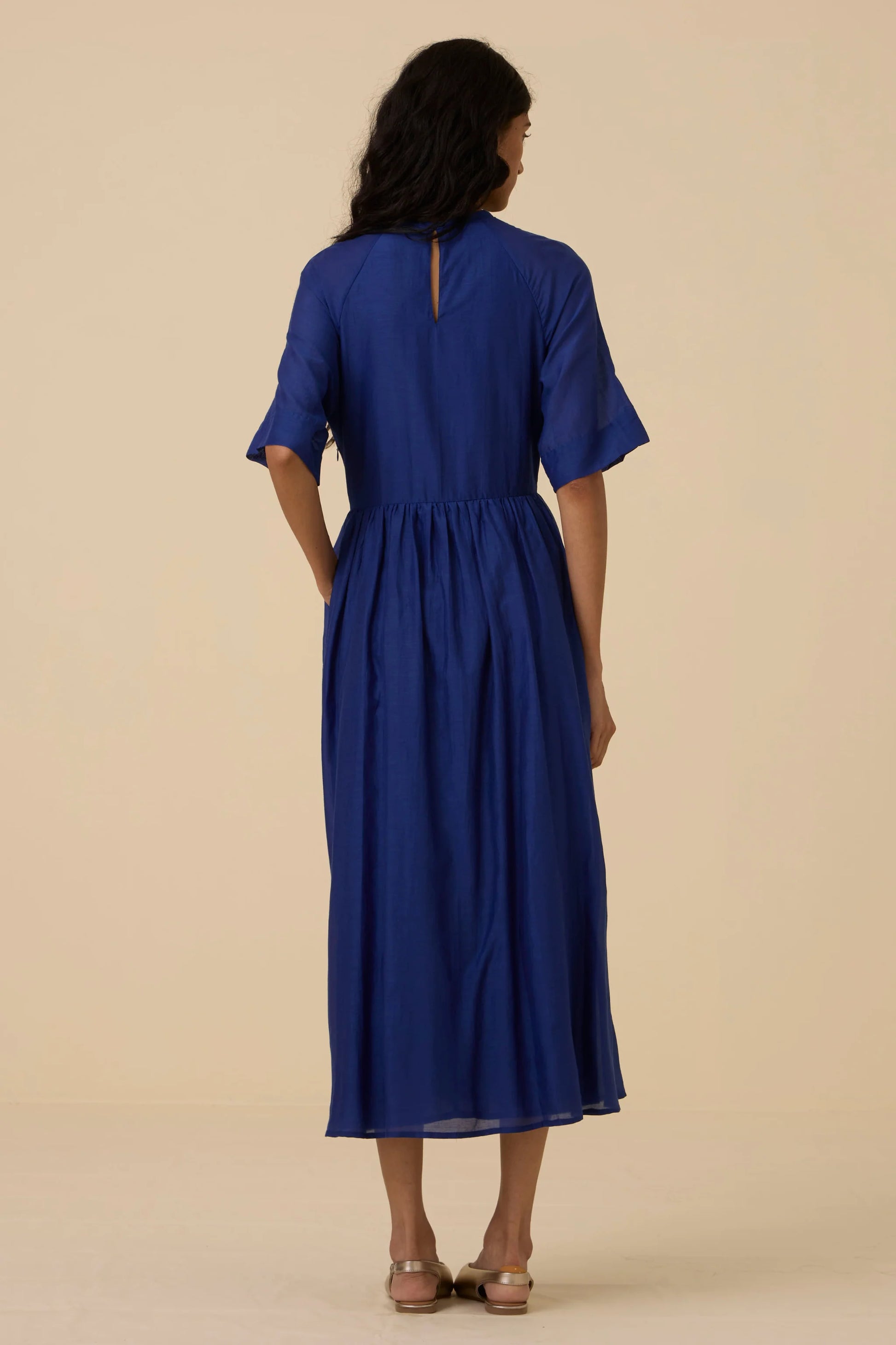 Get ready for compliments in this deep hued cotton silk dress. A fine rouching detail at the waistline elevates it as a statement style, while allowing for a comfortably cinched waist. Button closure at the back. In-seam pockets. This dress is fully lined.