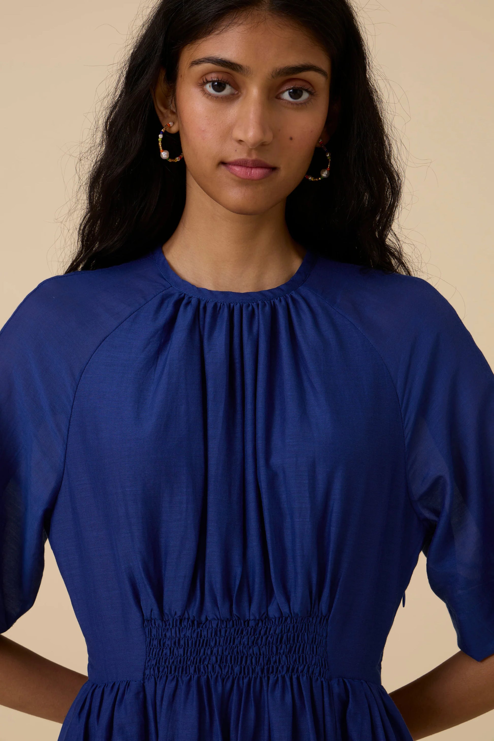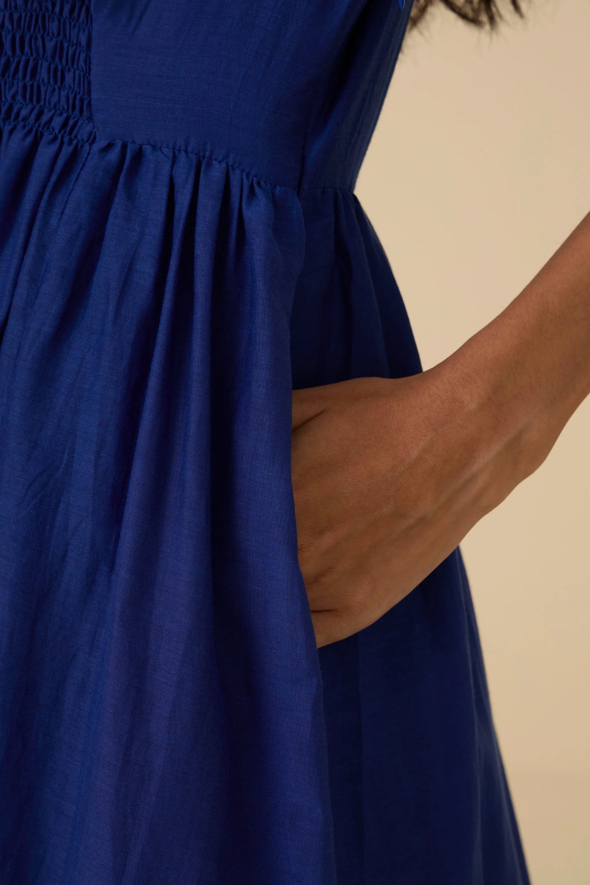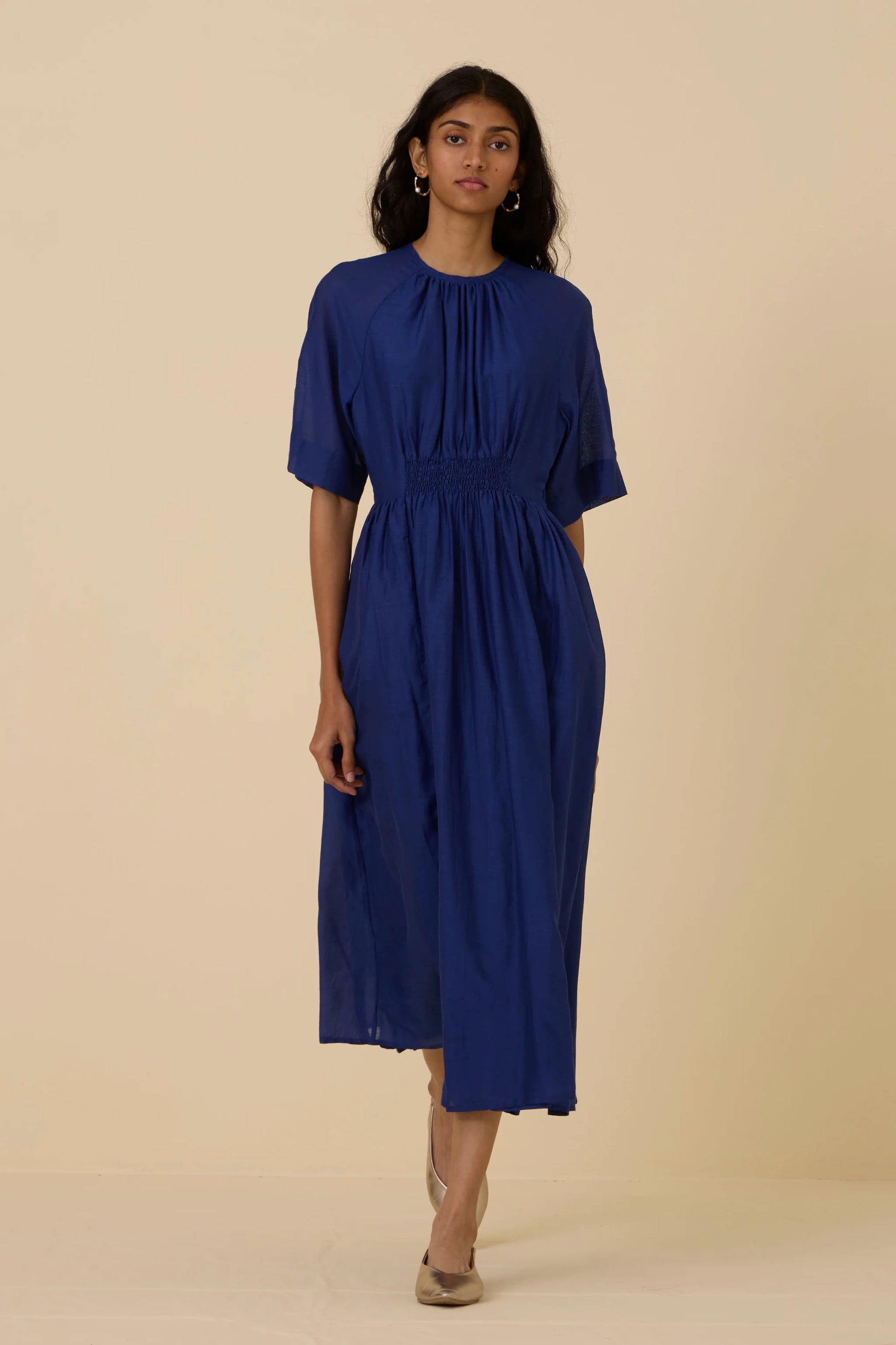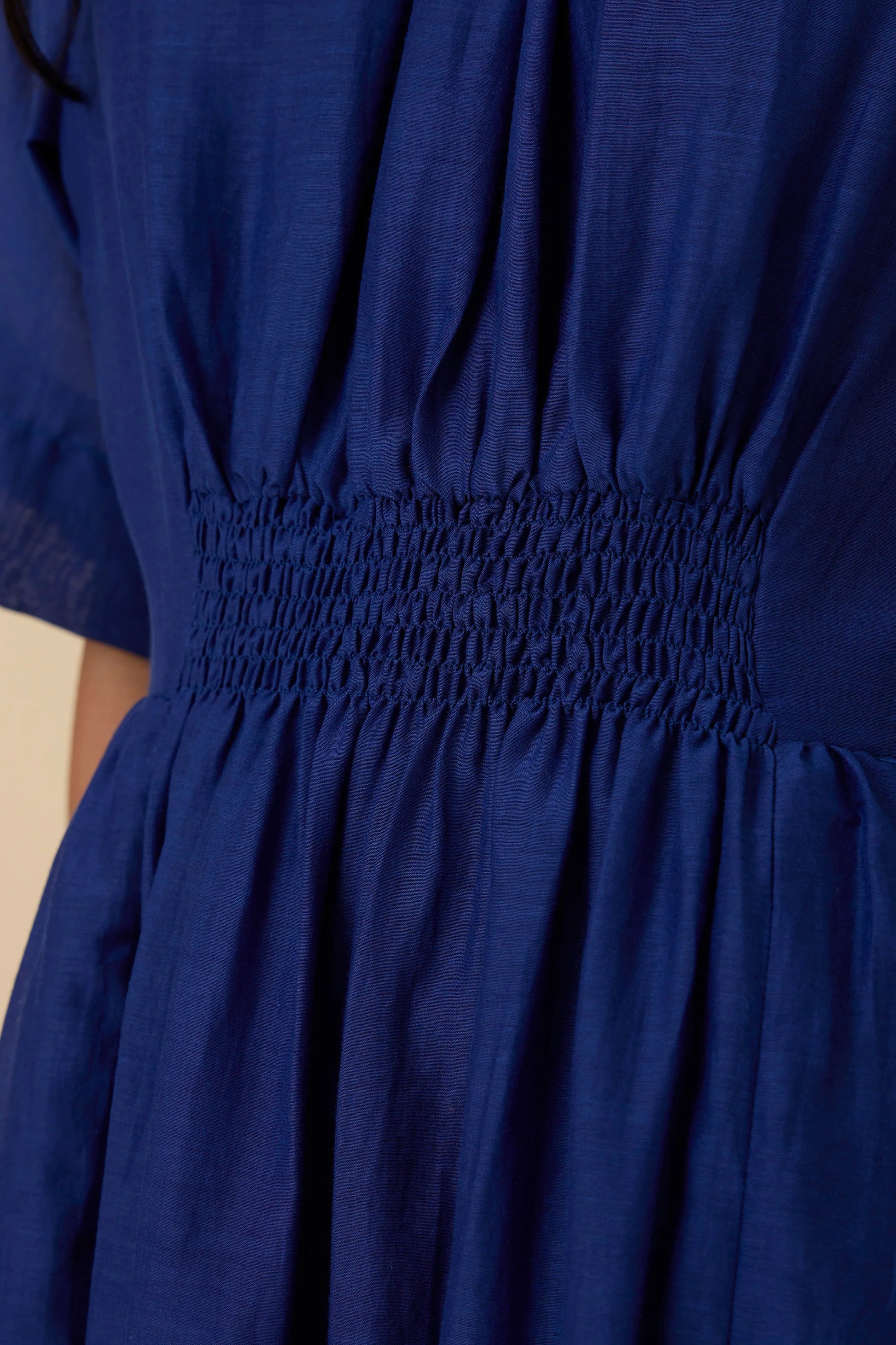 Get ready for compliments in this deep hued cotton silk dress. A fine rouching detail at the waistline elevates it as a statement style, while allowing for a comfortably cinched waist. Button closure at the back. In-seam pockets. This dress is fully lined.