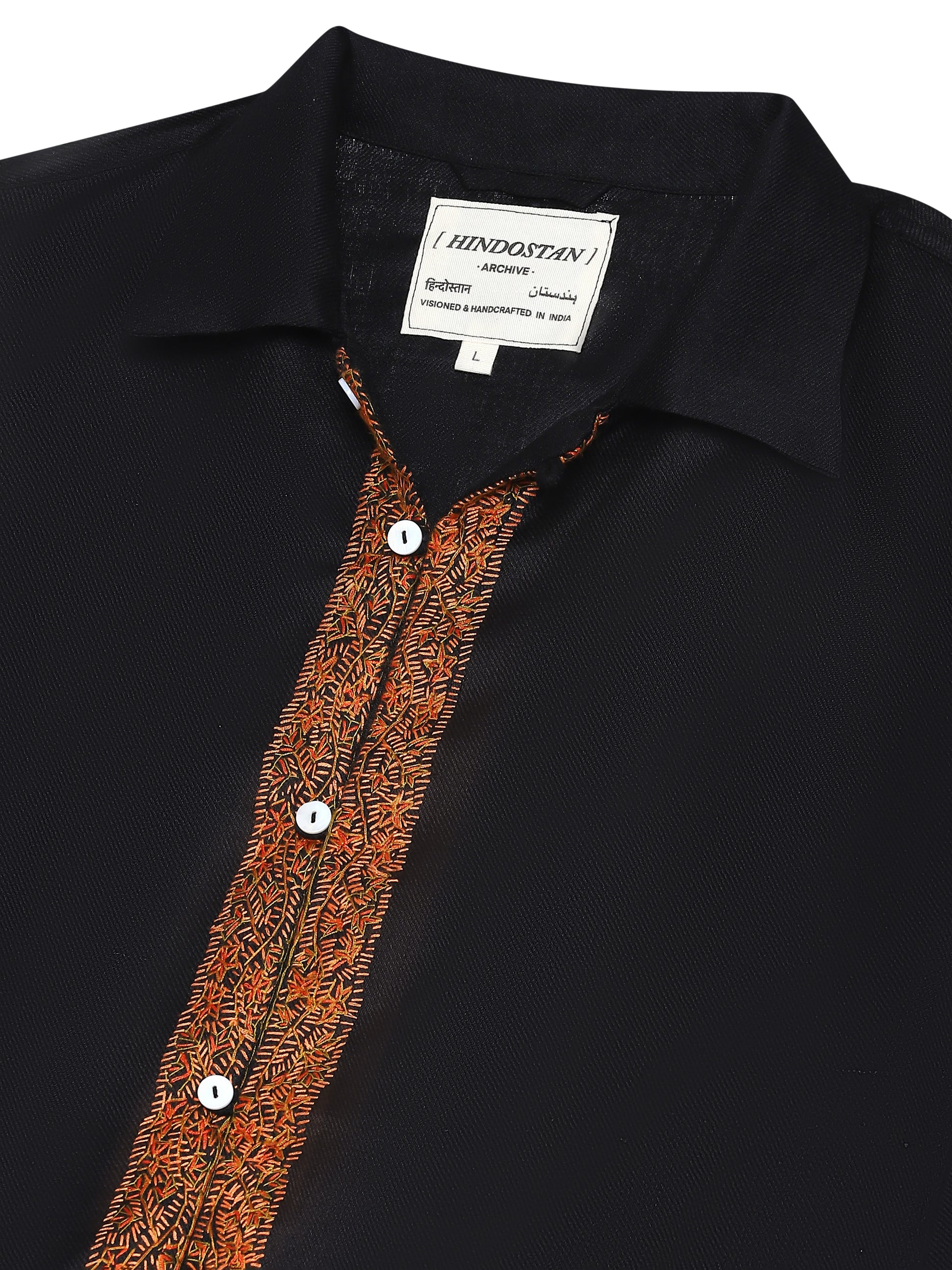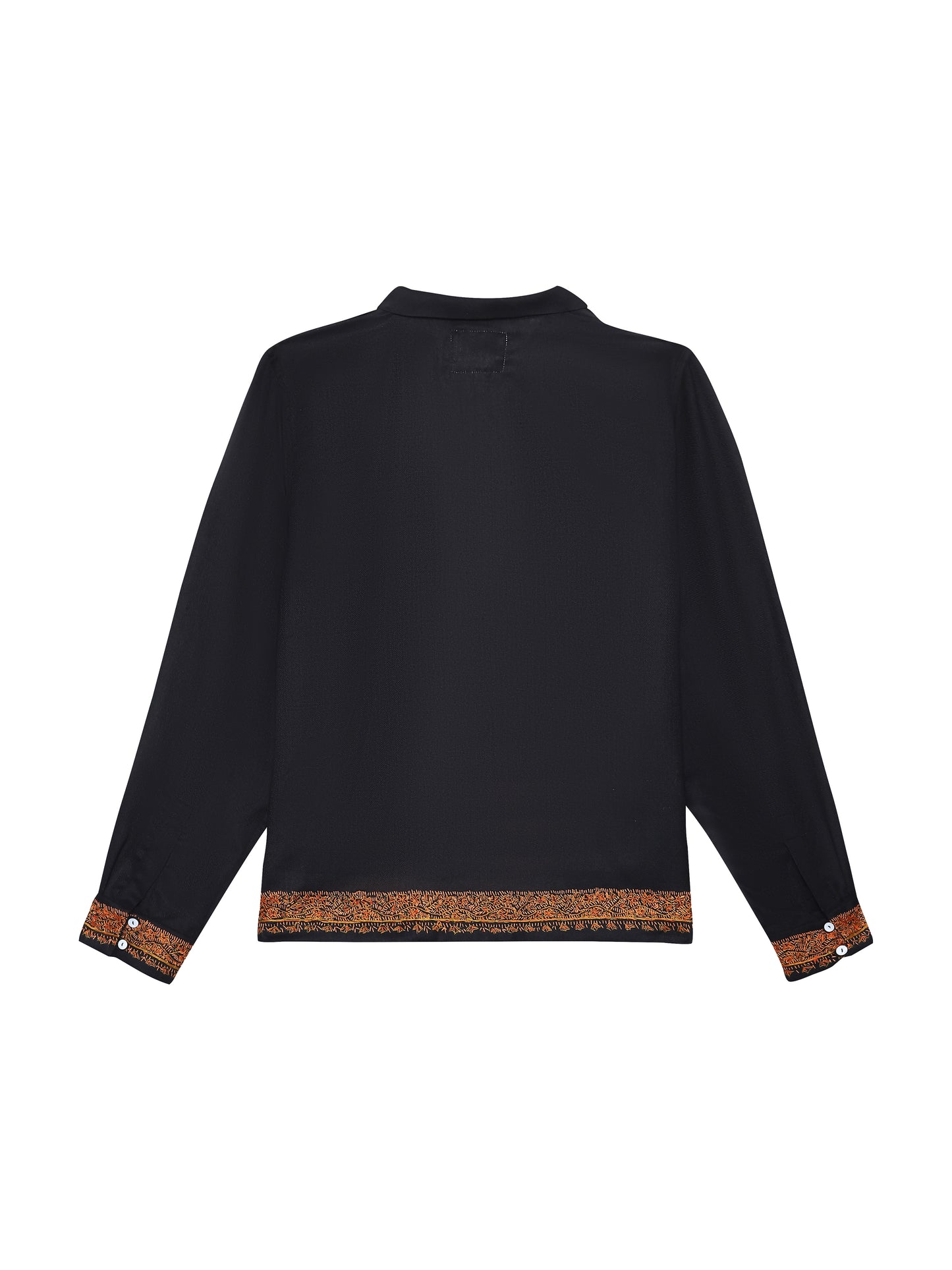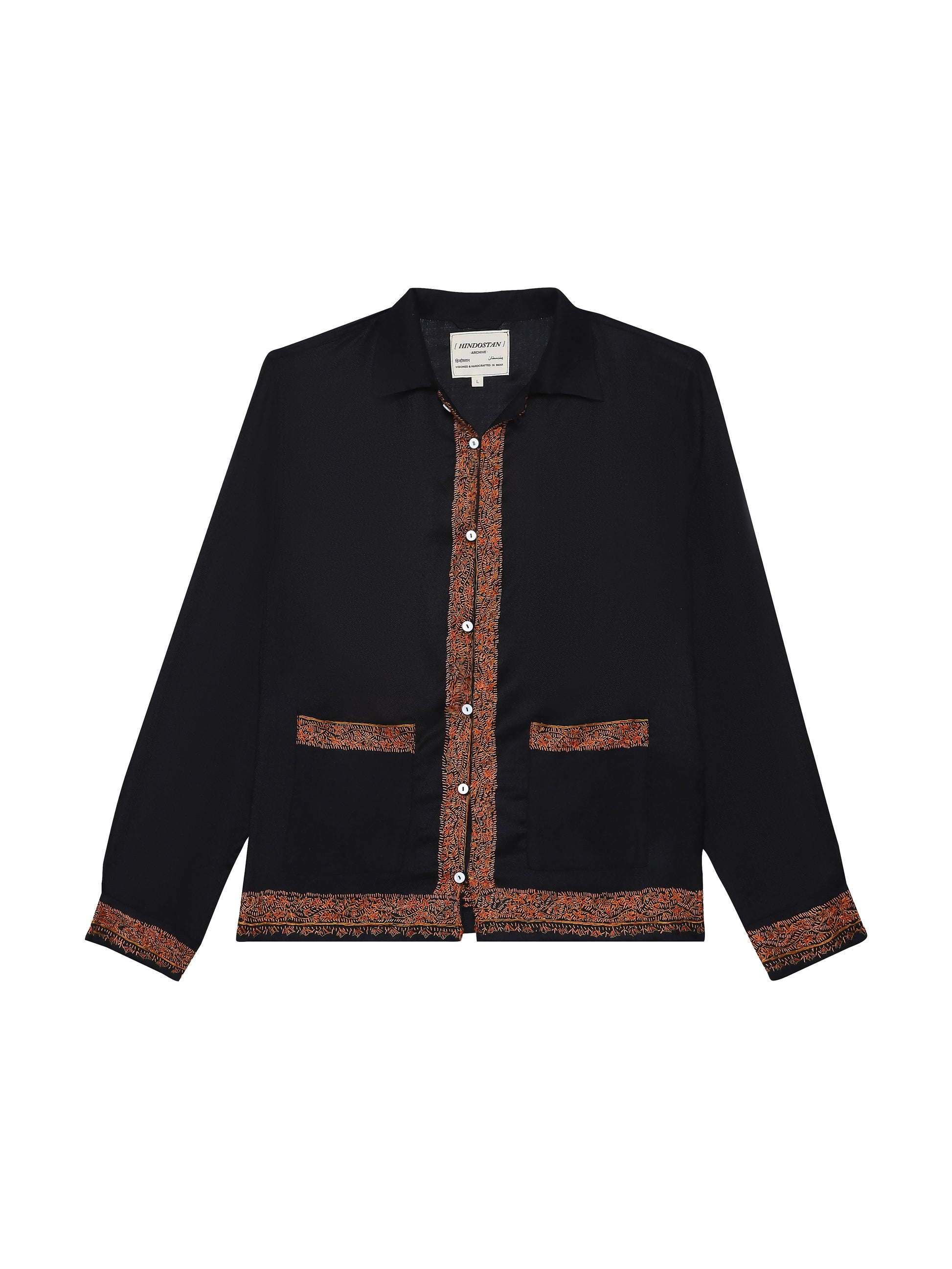 Handcrafted from the finest cashmere wool (sourced from Himalayan goats), the soft, lightweight but warm camp collar shirt has Sozni Kari hand-embroidered throughout.